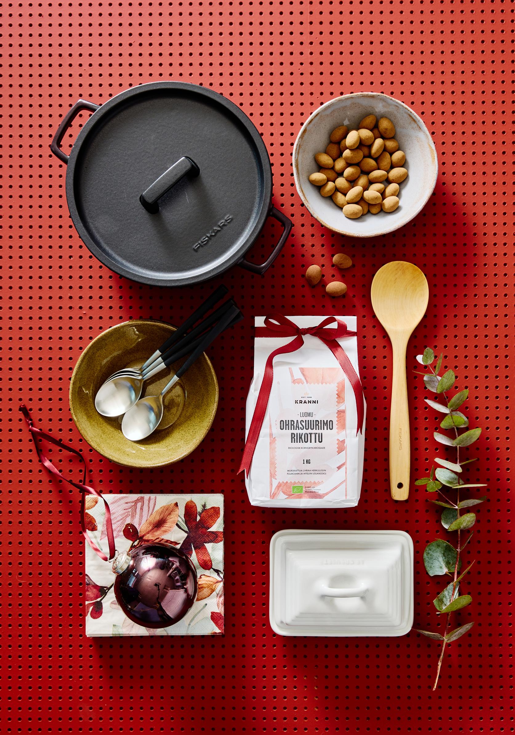 2. Puuron keittäjän paketista löytyy komeita ja käytännöllisiä kokkaus- ja kattaustarvikkeita