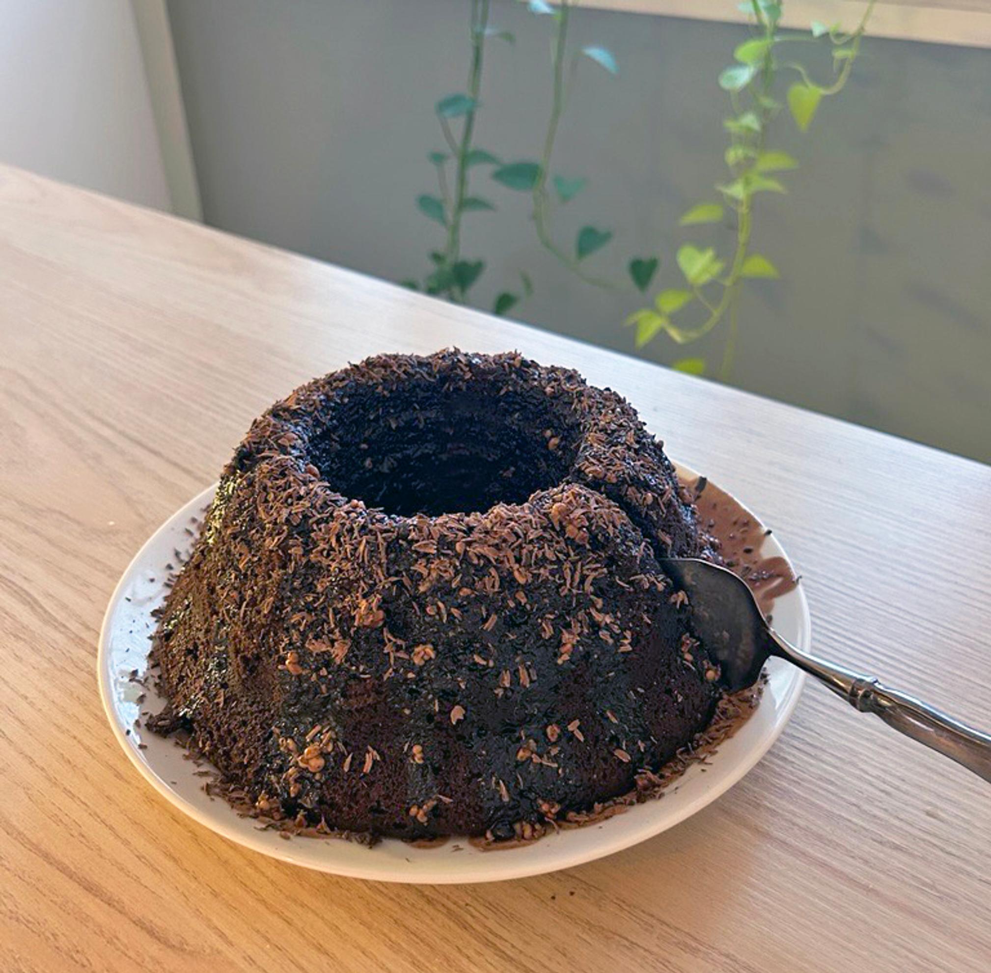 - Tee kuorrute. Sulata margariini kuumaan kahviin. Lisää tomusokeri ja kaakaojauhe. Valuta kuorrute jäähtyneen kakun päälle. Koristele suklaarouheella.