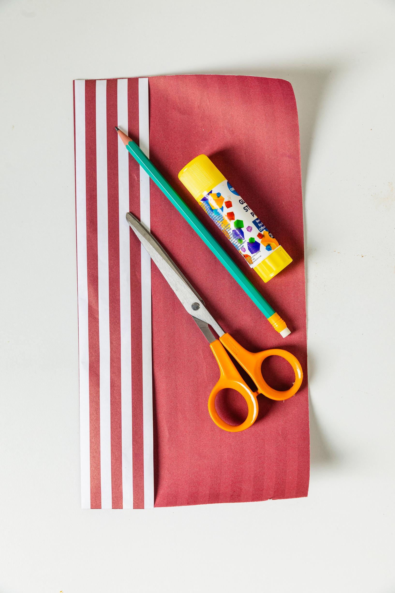 2. Laita paperi kuviopuoli alaspäin pöydälle. Taita paperin sivut kohti keskustaa siten, että reunat asettuvat hieman päällekkäin. Liimaa reunat yhteen niin, että paperista muodostuu ikään kuin putki. Älä siis liimaa keskelle taitettuja reunoja kiinni taustaan, ainoastaan toisiinsa.