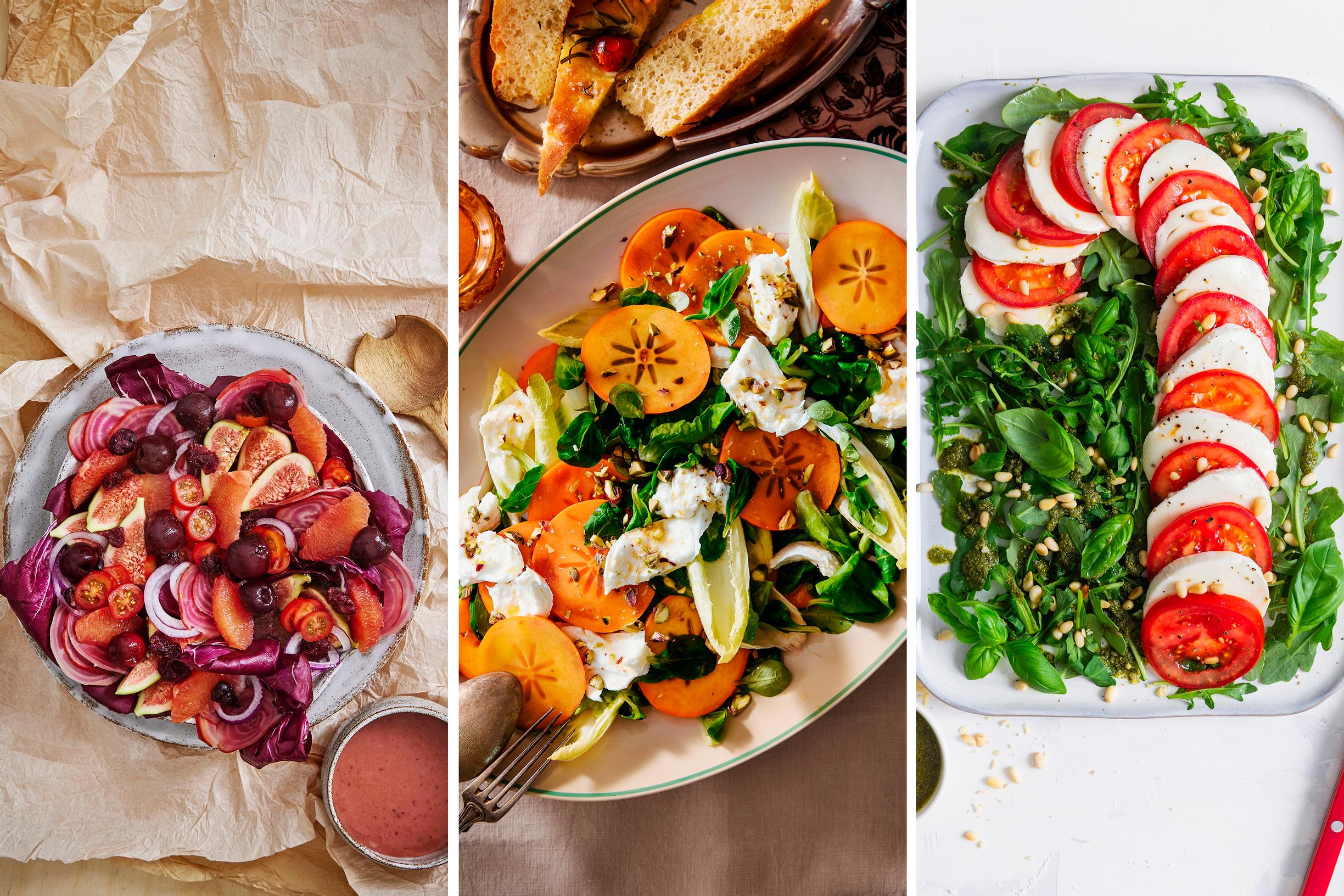 5 × joulusalaatti – valitsetko veikeän karkkikepin, kauniin joulunpunaisen katseenkääntäjän vai elegantin persimon-mozzarellasalaatin?