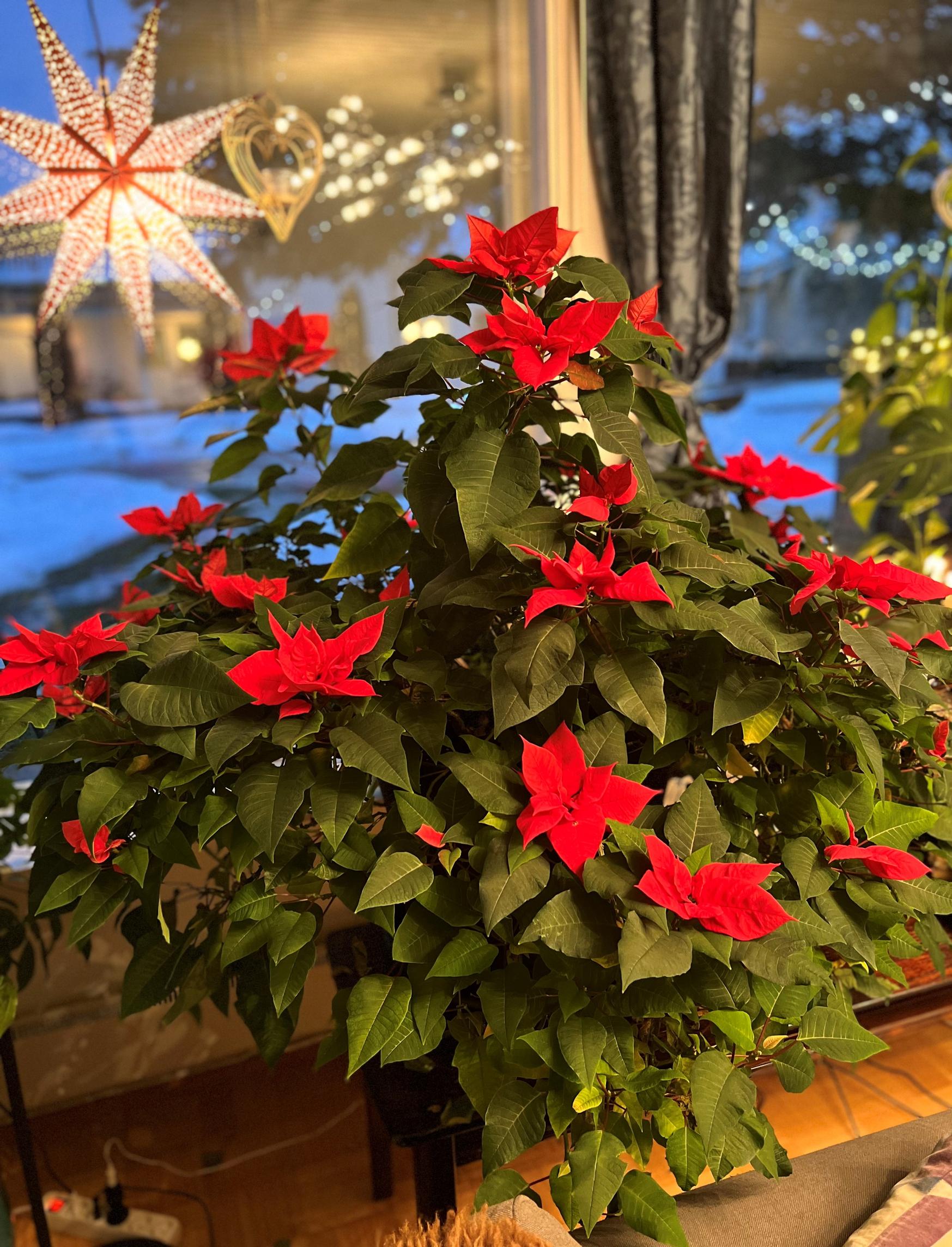 Elämme nykyään joulutähden ehdoilla: Olemme siirtäneet kukkapöydän kauemmas ikkunasta, jotta se mahtuu sille. Sen takia myös sohvaa on pitänyt siirtää, ja olohuoneessamme joutuu hieman pujottelemaan.