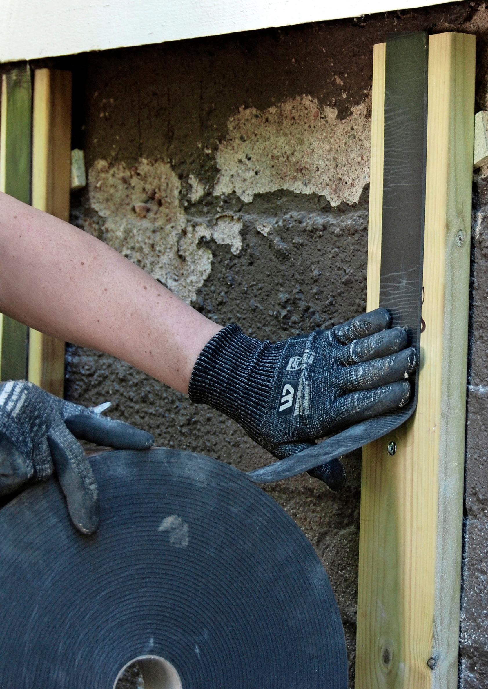 2. Sahaa koolauspuut sopivan mittaisiksi. Pidä huolta, etteivät puut osu maahan, sillä ne voivat kerätä kosteutta puun päästä. Kiinnitä puut proppaamalla. Sopiva ruuvin vahvuus on 8 millimetriä. Pidä huolta, että puut tulevat pystysuoraan. Laita nurkkien ja aukkojen molemmille puolille koolauspuut.