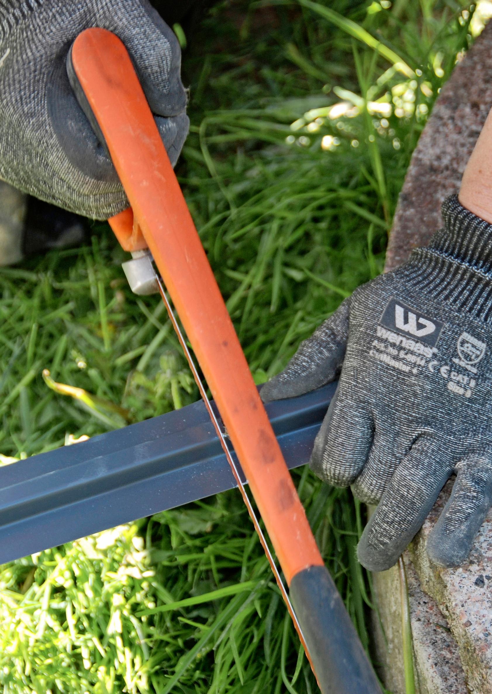 7. Katkaise väliin tulevat listat. Sokkelilevyjen väliin ja nurkkiin tulee vielä metalliset listat, jotka viimeistelevät julkisivun. Listojen sävyn voi valita sokkelilevyn väriin yhteensopivaksi, mutta halutessasi voit myös korostaa levyjen saumoja valitsemalla esimerkiksi mustan värin. Katkaise listat sopiviksi rautasahalla tai peltisaksilla.
