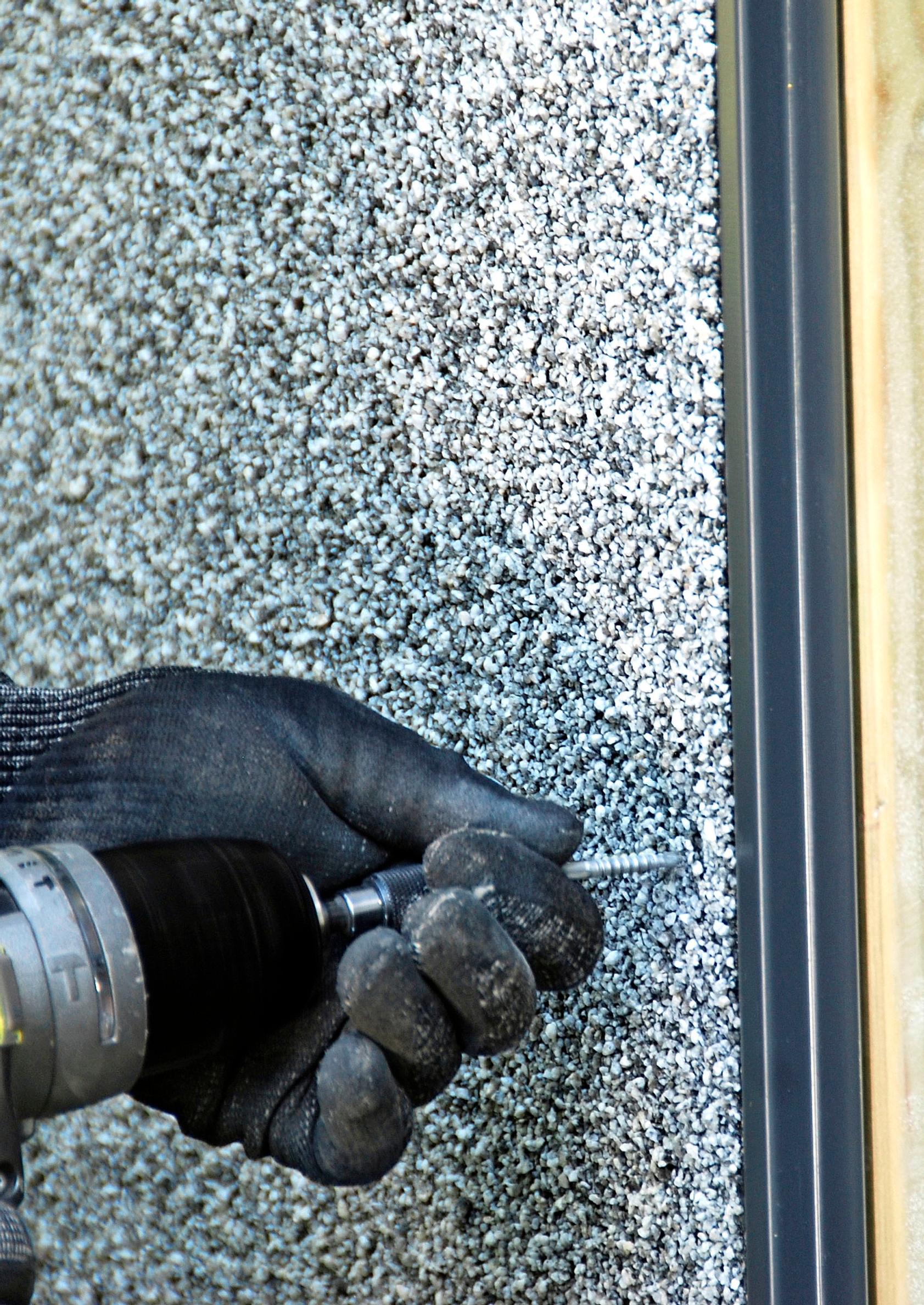 Tämä kohteen sokkelin pinnoitus tehtiin Stonerexin luonnonkivisirotteella päällystetyllä sementtilastulevyllä. Levy on 12 millimetriä paksu: 10 milliä on varsinaista levyä ja kaksi milliä luonnonkivimursketta.