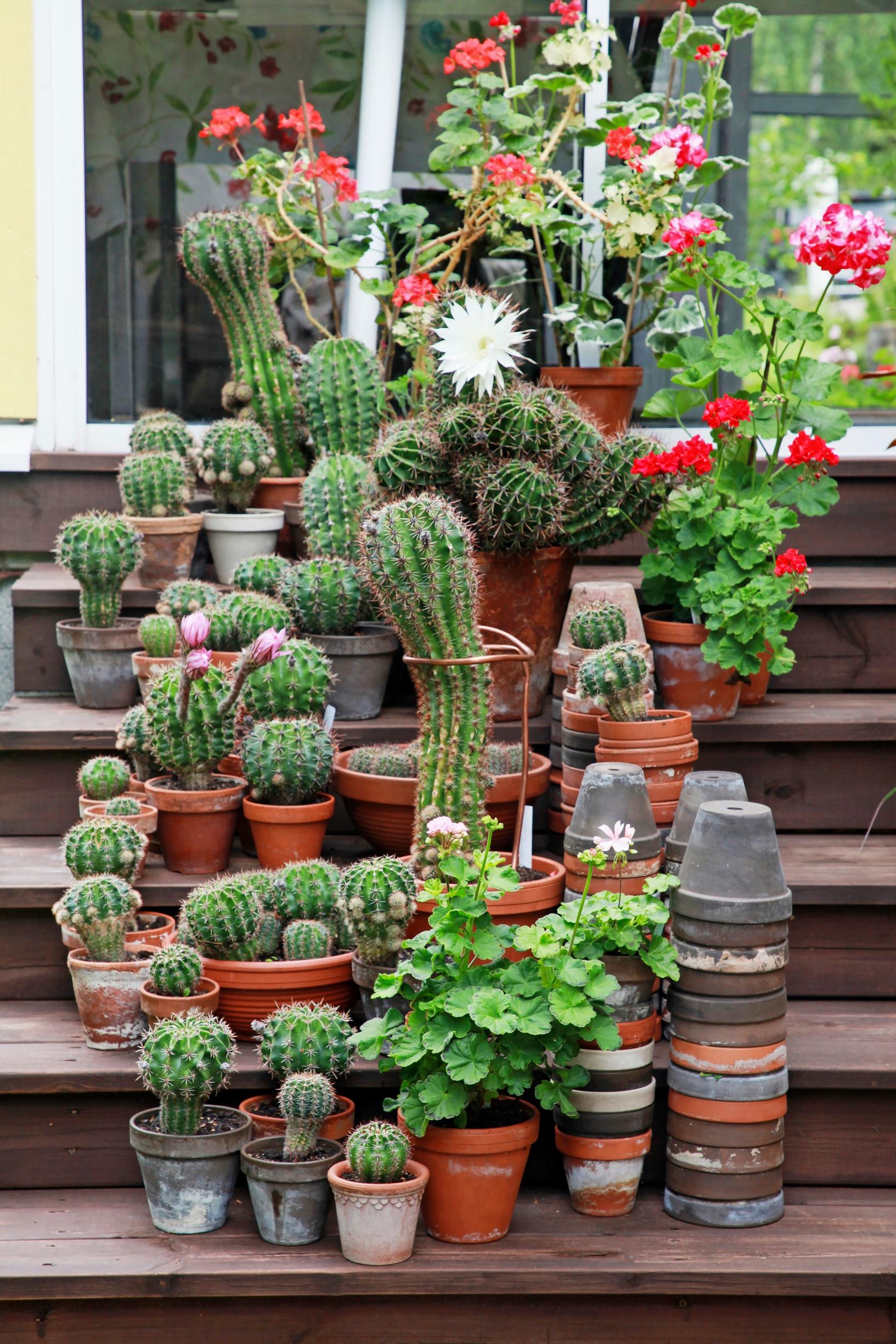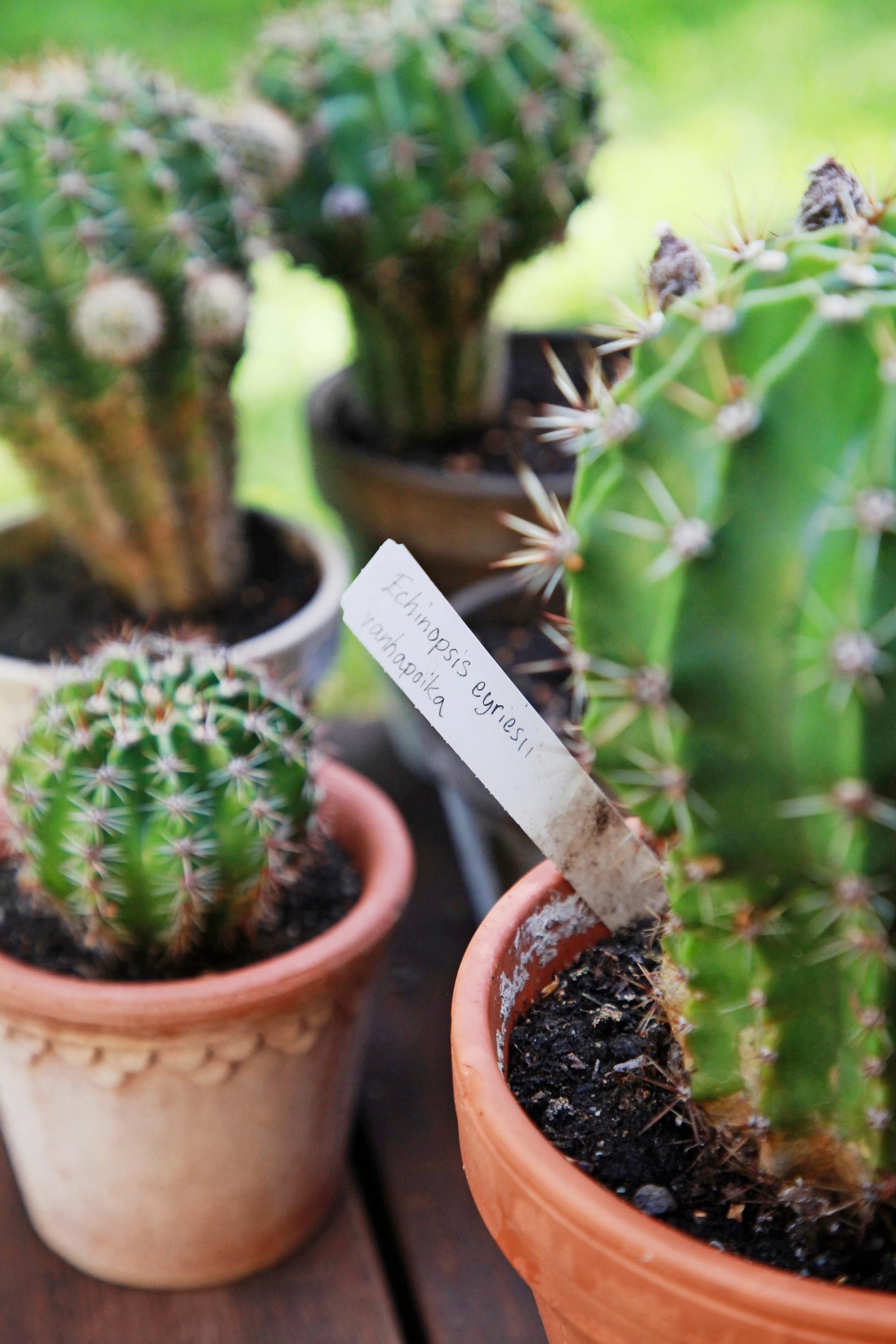 - Sisällä olleet kaktukset tarvitsevat aluksi suojaa auringolta. Tuon vanhapojat ulos yleensä toukokuun alussa ja peittelen kasvuharsolla.