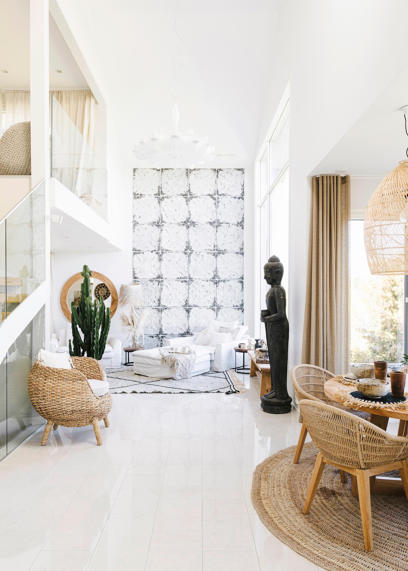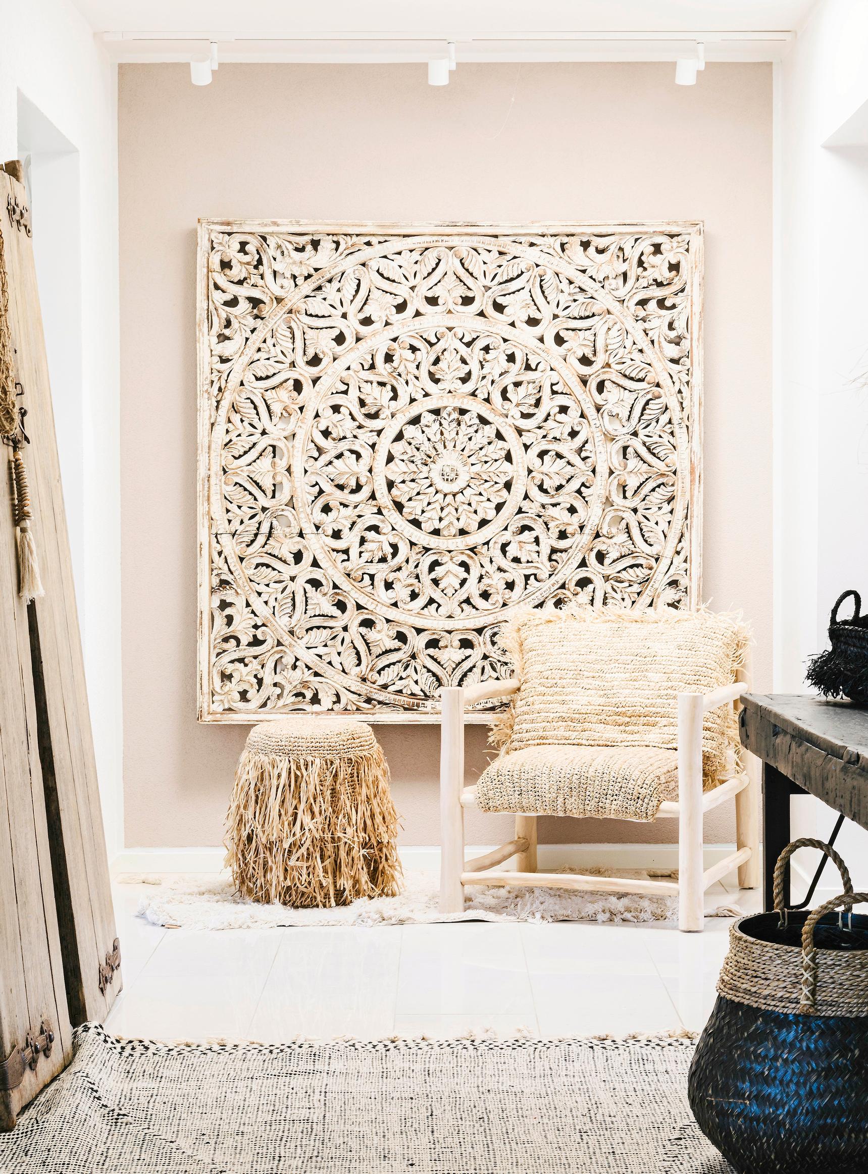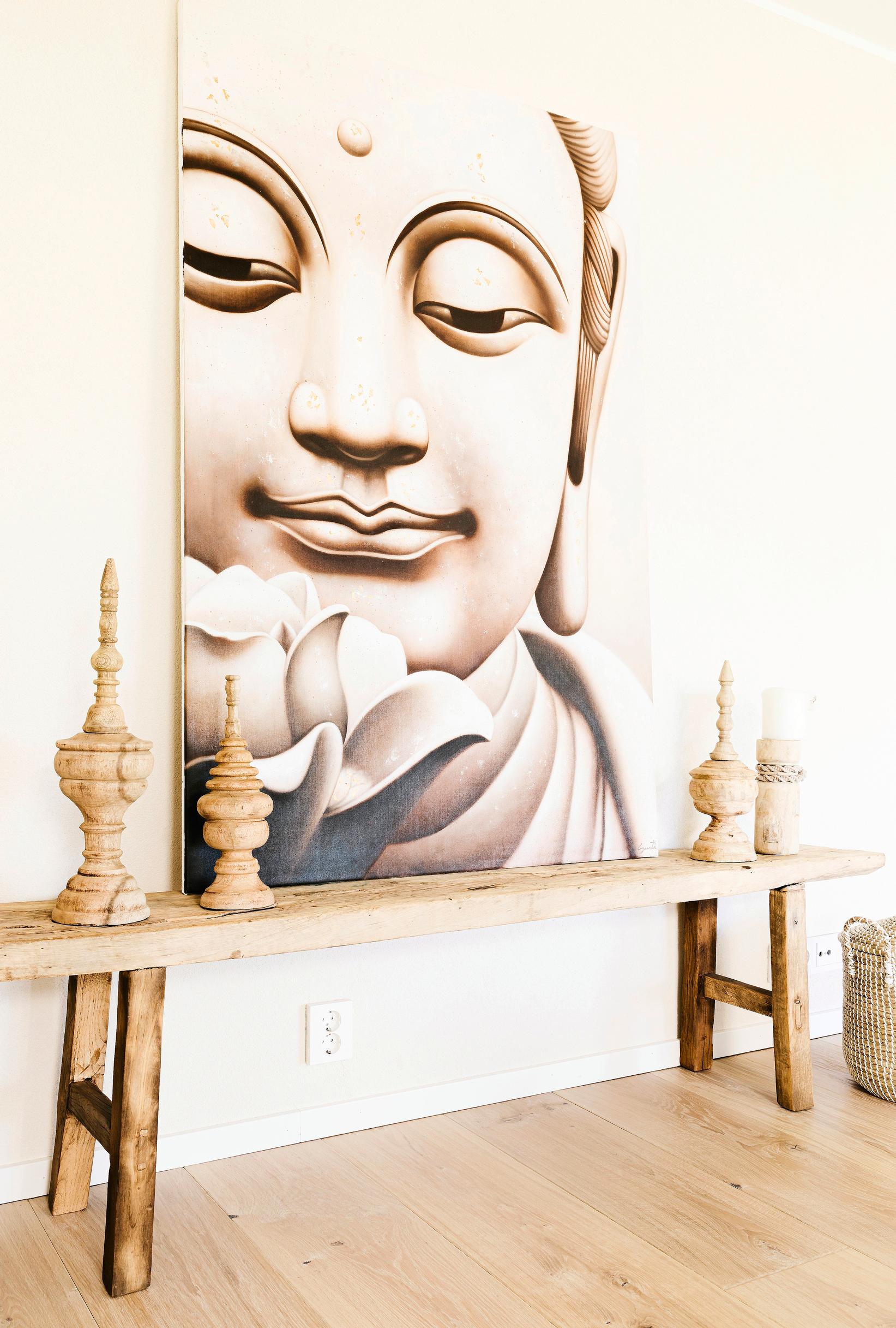 Kodin sisustuksen päävärit ovat nykyään hiekka ja puun sävyt. Olohuoneen tinalaattaseinä sitoo kaiken kauniisti yhteen. Buddhapatsaat, villamatot ja makrameetyöt saavat mielen matkustamaan kaukorannoille.