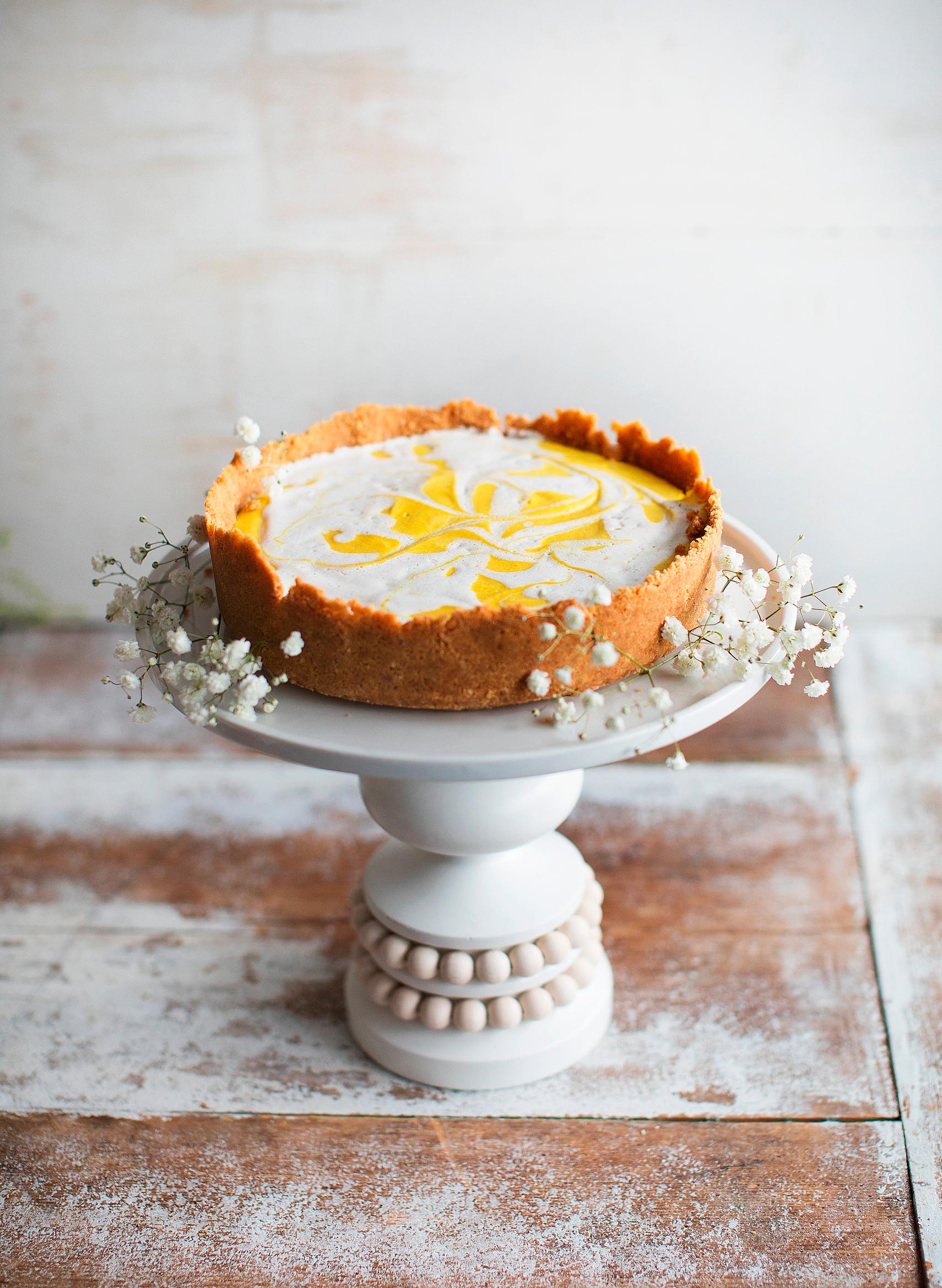 Juustokakun valmistamiseen ei aina tarvita liivatetta, maitoa tai munia. Täytteen hyydyttämiseen sopii esimerkiksi vegegeeli, kuten tässä vegaanisessa raparperi-appelsiinijuustokakussa. Kahden täytteen vegaanisessa juustokakussa ihastuttaa klassinen makupari, eli mango ja kookos.