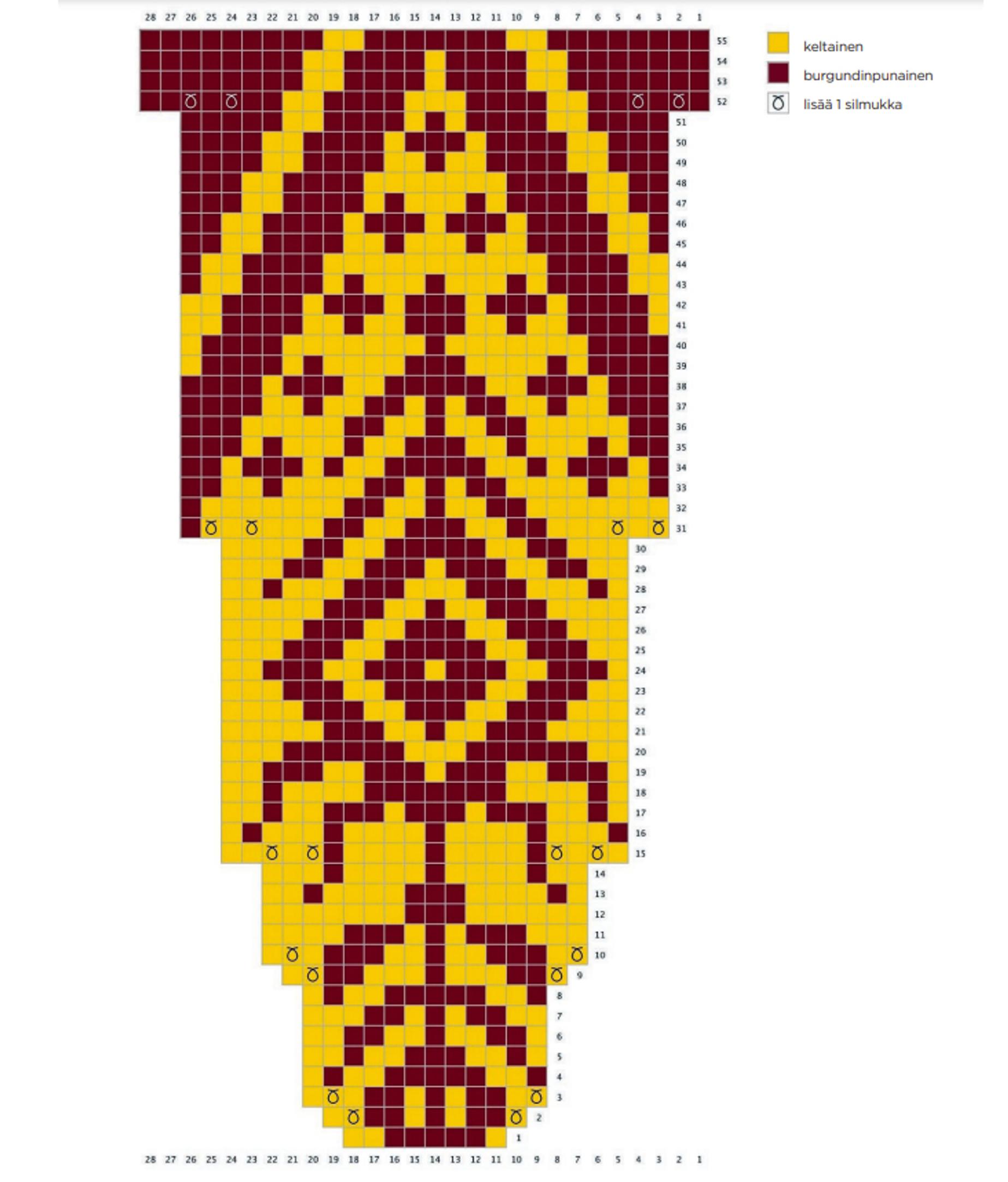 - Aloita nyt kirjoneuleen neulominen kaavion mukaan. Kaaviota luetaan alhaalta ylös, oikealta vasemmalle. Lisää silmukat kaaviossa merkittyihin kohtiin siten, että lisätty silmukka tulee kaaviossa merkityn silmukan ja sitä seuraavan silmukan väliin (neulo 1 o, lisää 1 s). Koko kuvion neulottuasi puikoilla on 308 (336, 364, 392, 420, 448) s. Neulo sileää neuletta suljettuna neuleena, kunnes kappaleen korkeus on 26 (27, 27, 28, 28, 30) cm tai sopiva.