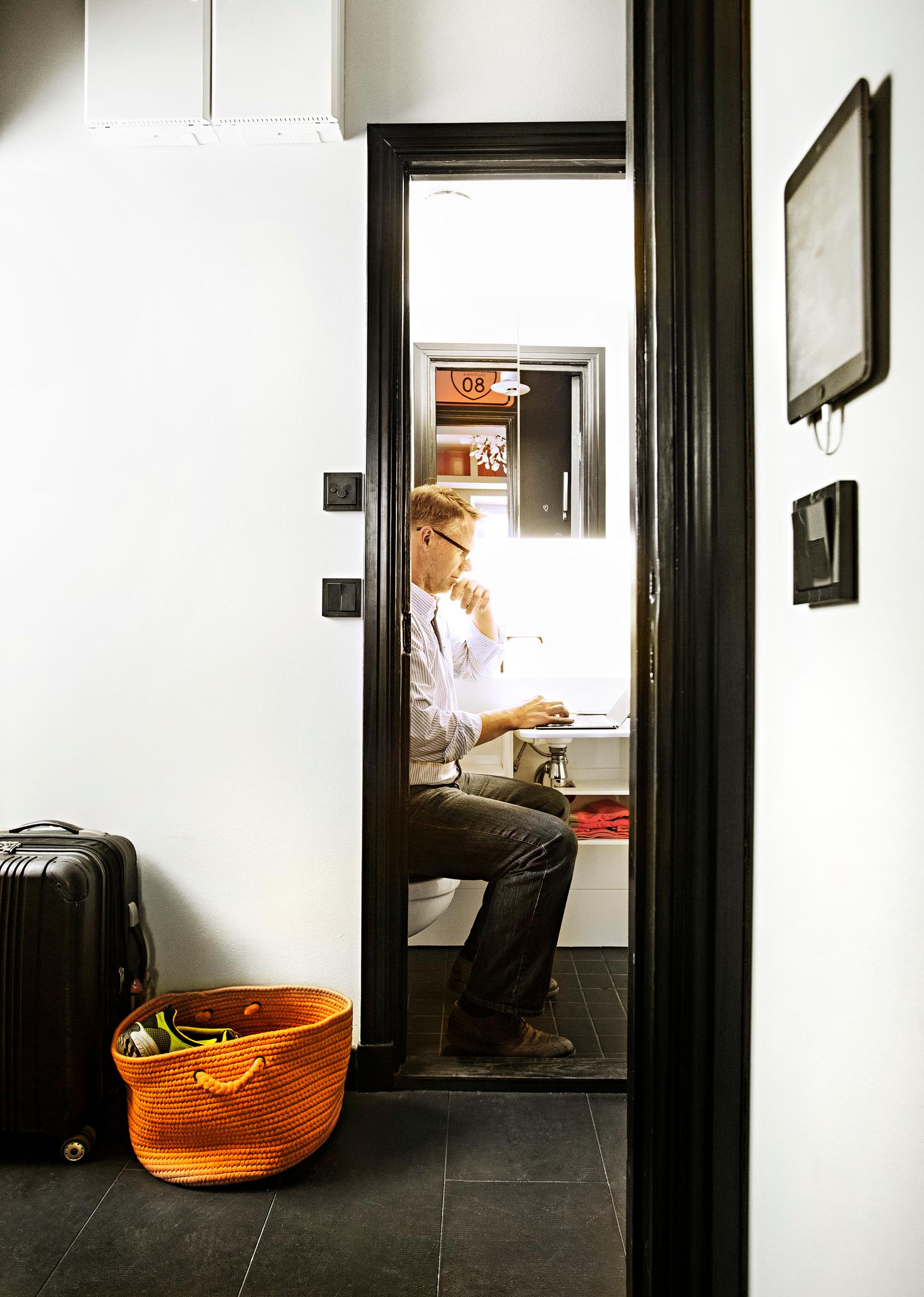Toinen neukkari on pikkuruisessa kylpyhuoneessa. Mårten istuutuu wc-pöntön päälle ja nostaa allastasoon kiinnitetyn kannen ylös. Työtila on valmis.