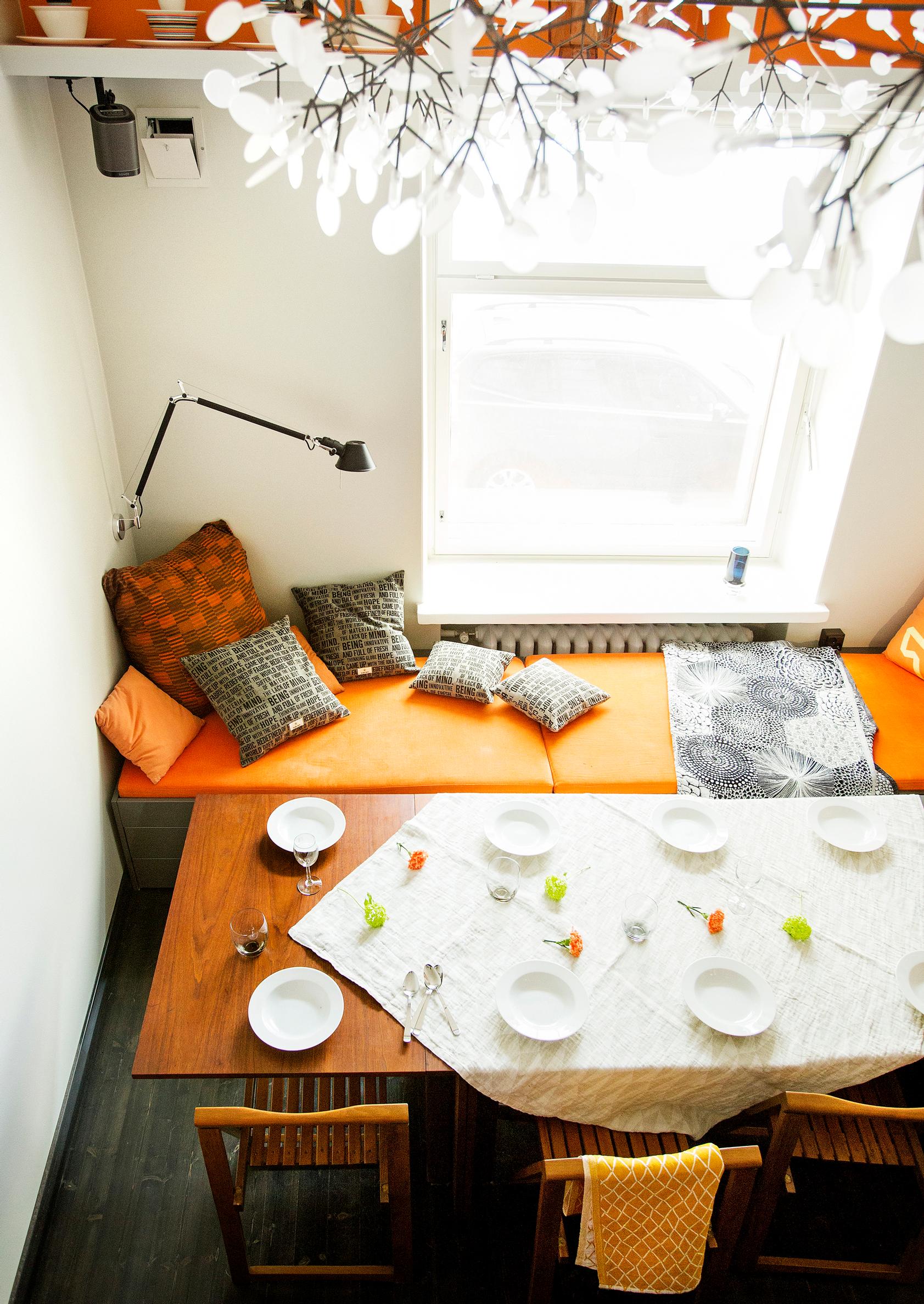 Hetkinen − mihin hän kattaa sen? Mårten ja Sari avaavat patinoituneen klaffipöydän, joka täyttää noin puolet huoneen lattiasta. Tilan toisessa päädyssä on arkkitehdin suunnittelema jatkettava sivupöytä, joka sopii täydellisesti toisen pöydän jatkoksi. Entä tuolit? Taittopöydässä on väliköt, jonne tuolit säilötään, kun pöytä on kasattuna. Nerokasta.