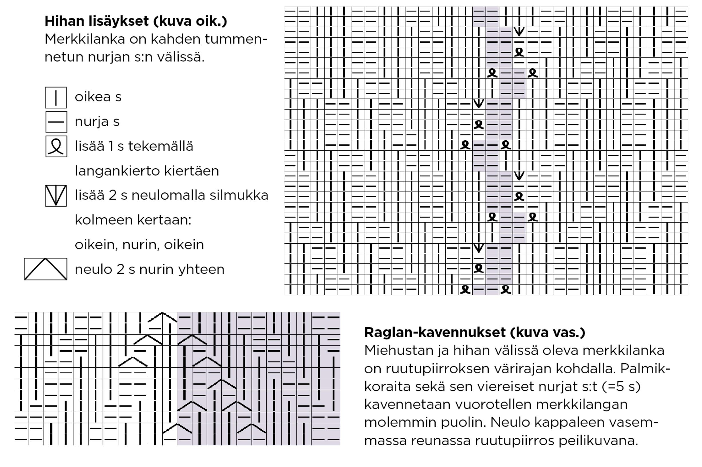 - Vaihda työhön 4,5 mm puikot ja aloita mallineuleen neulominen. Kun kappaleen korkeus on 3-3-5-6-6-7-7 cm, neulo kerros loppuun ja aloita hihan lisäykset ruutupiirroksen mukaan. Toista lisäyksiä niin, että hihaan tulee 5-6-6-7-7-7-7 palmikkoraitaa lisää = 70-75-80-85-90-95-100 s.