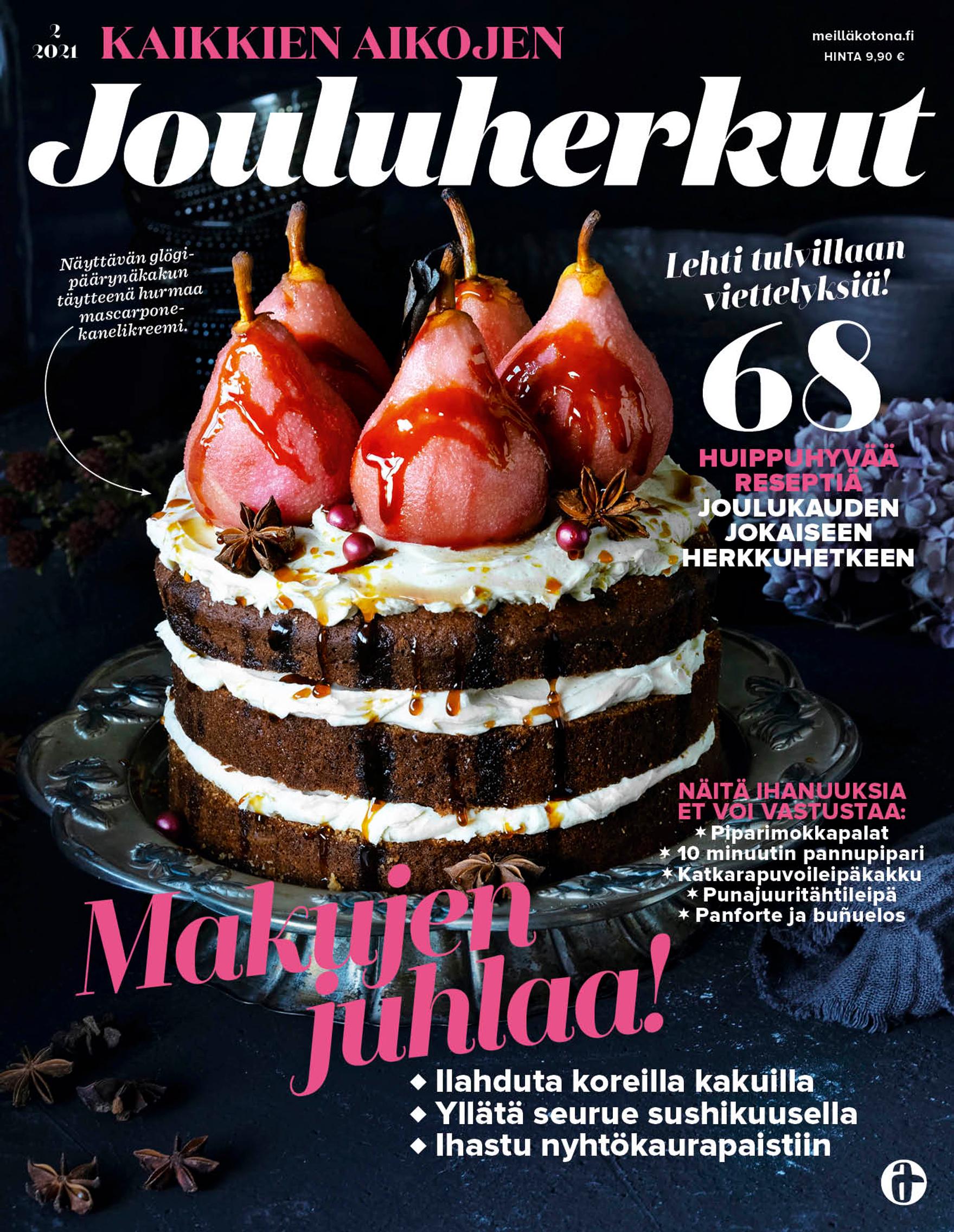 Kaikkien aikojen Jouluherkut on sesongin kaunein ruokalehti. Se kutsuu kokeilemaan huippuhyviä reseptejä, löytämään uusia makuja ja nauttimaan niistä yhdessä läheisten ja ystävien seurassa. Hurmaa glögipäärynäkakulla, kokoa näyttävä makijoulupuu ja ilahduta minttusuklaakonvehdeilla.