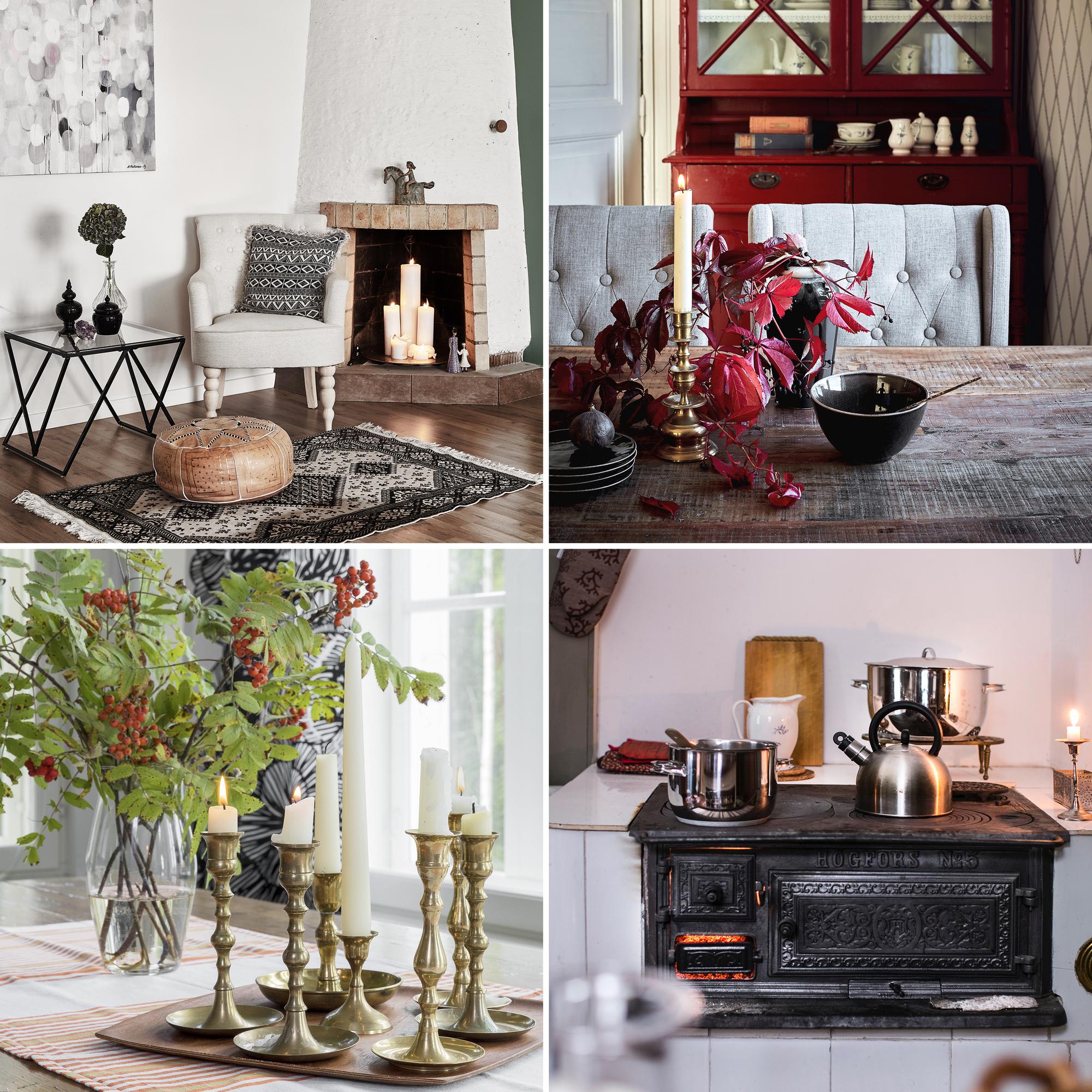 Pihlajanoksat punaisine marjoineen ovat alkusyksyn kauneimpia näkyjä, myös vaasiin koottuna! Ruskan värit lämmittävät kummasti koleuden nuuduttamaa mieltä. Kurkkaa täältä lisää terapiakuvia keltaisesta puutalokodista. Yksikin kirkkaankeltainen oksa maljakossa saa sydämen hymyilemään. Ja käsi hakeutuu kuin huomaamatta ryijyn pehmeälle pinnalle. Tuli rätisee vanhan uunin uumenissa, vatsa on täynnä lämmintä keittoa. Juuri näin on hyvä! Villiviinin vihreys vaihtuu ilmojen viiletessä upean syvään punaan, jonka paloa astiakaappi kauniisti toistaa. Jos tykästyit tunnelmaan, kurkkaa täältä lisää kuvia porvoolaiselta sukutilalta. Näyttävästi esille ladotut polttopuut ovat juurevaa katseltavaa ja tuoksuvatkin kodikkaasti. Ehkä parasta ikinä: tulisija makuuhuoneessa! Tämä makkari on osa entistä juna-asemaa, josta on remontin myötä tullut tunnelmallinen koti. Lue juttu ja katso kuvat täältä. Kynttilänvalo ja ympärille kietoutuva pimeys. Olisipa jo ilta! Kaarevalinjainen avotakka vei tämän kodin asukkaan sydämen heti ensisilmäyksellä. Jutun viehkeästä tamperelaiskodista löydät täältä. Sammuneista kynttilöistä nouseva savu on kuin tanssia. Tummaksi petsattu katto tekee olohuoneesta intiimin, vaikka tilalla riittääkin korkeutta. Kaiken kruunaa takassa loimuava tuli. Täyteläiset ja utuiset värisävyt makuuhuoneessa tuntuvat ihanan rauhoittavilta. Jos ihastuit kuvaan, kurkkaa Billnäsissä sijaitsevaan kotiin. Patinoituneet kattoparrut ja lämpimän värikkäitä tekstiilejä. Miten kaunista ja levollista! Lisää kuvia kajaanilaiskodista löydät täältä. Vanhanajan leivinuuni kutsuu viihtymään keittiössä. Pitäisikö vihdoin testata juurileivontaa? Ajan koristamat puuesineet tuovat lämpöä vaaleaankin kotiin. Jos inspiroiduit, haluat varmasti nähdä kaikki kuvat tästä kodista. Pikkuesineistä, kynttilöistä ja viherkasveista kootussa asetelmassa riittää tutkailtavaa pidemmäksikin toviksi. Tässä vaatesuunnittelijan kodissa sisustus tosin vaihtuu vikkelästi. Katso kaikki kuvat! Eikö tämä sänky näytäkin ihanan muhkealta ja lämpimältä? Saako nukkua kevääseen asti? Sillä välin, kun tee porisee hellalla, ehtii hyvin neuloa muutaman kerroksen villasukkaa tai täyttää vähän sudokua. Jos syksyinen mielesi janoaa kylläisiä värejä ja satut lisäksi pitämään vanhoista taloista, kannattaa ehdottomasti kurkistaa tähän perinnemestarin kotiin, 1800-luvun kartanoon. Muhkea sohva ja lämmin viltti. Enää puuttuu hyvä kirja! Omenoista saa hauskasti lämpöä syyssisustukseen. Ohikulkumatkalla voi tietysti napata välipalaa. Kurkkaa keskisuomalaiseen puutaloon, jonka asukkaat ovat rakentaneet omin voimin. Ruskan värittämä luonto on kuin taidetta. Eikö tämä ruusunoksa tuokin mieleen auringonpaisteen? Aurinkoisen kuulaana syyspäivänä teen tarkenee hyvin siemailla terassilla. Nyt nautitaan!