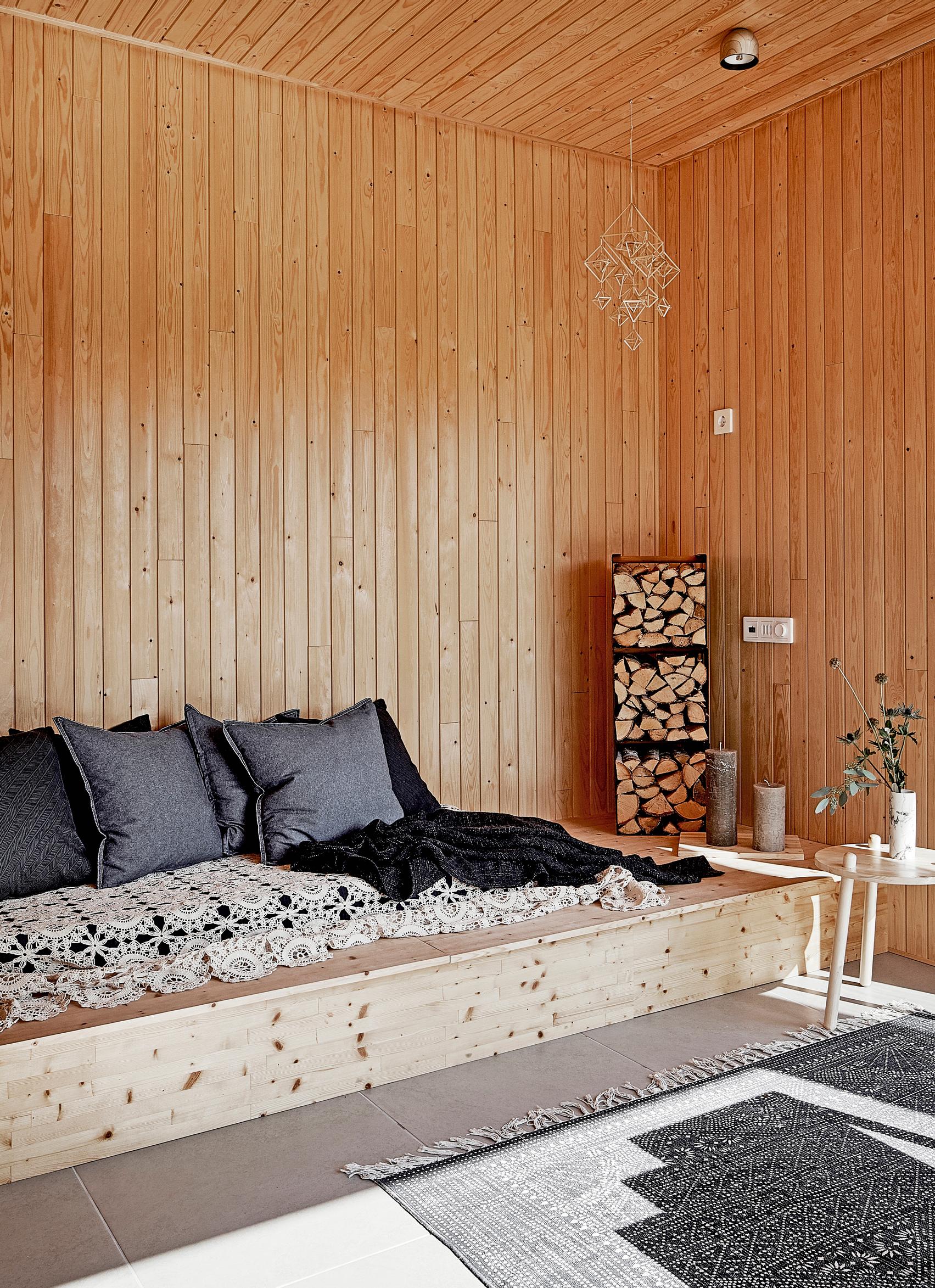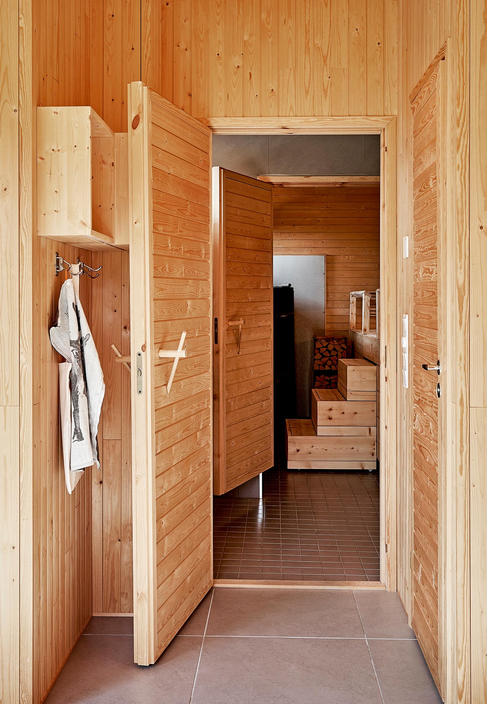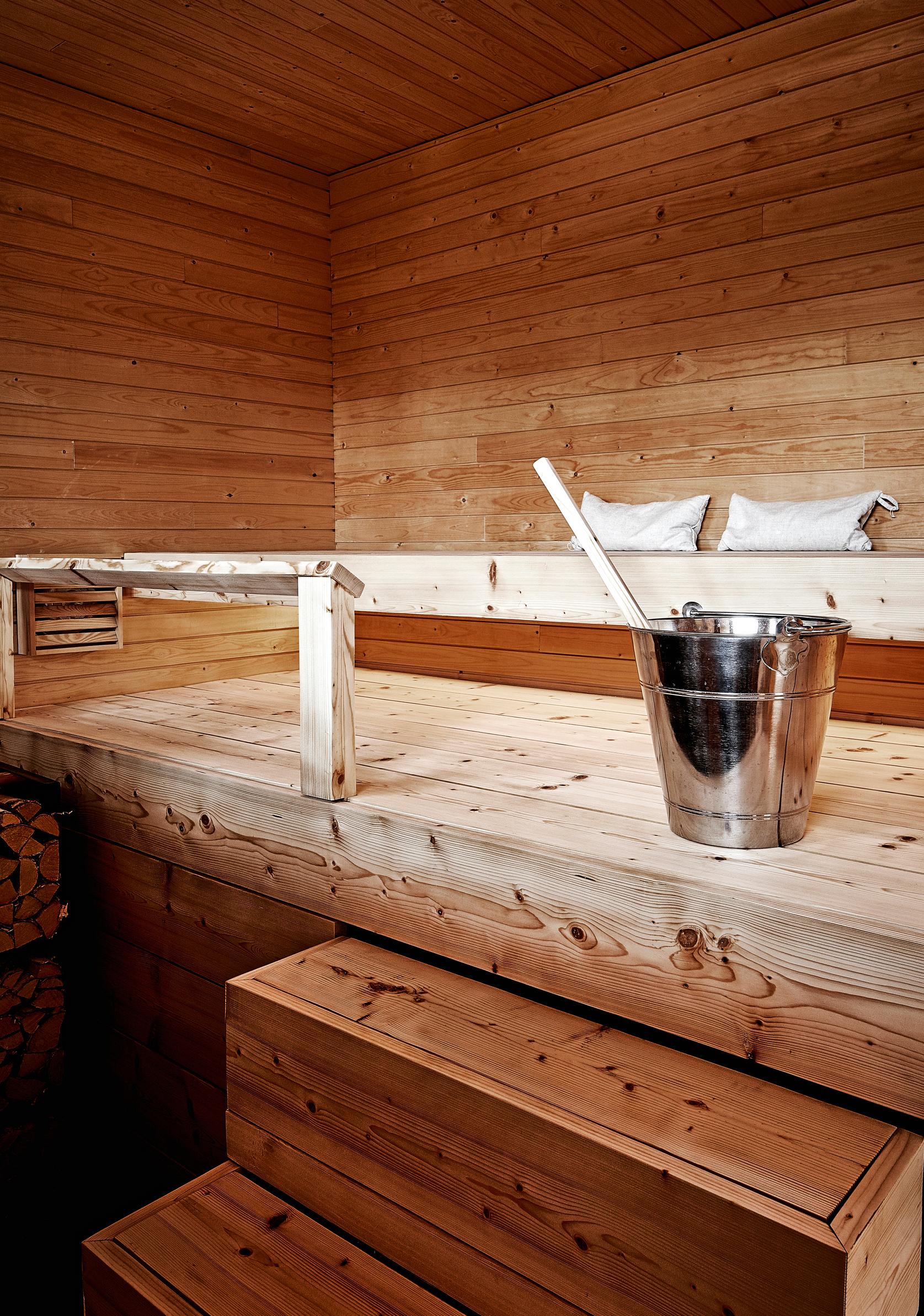 Perhe rakastaa saunomista. Talon erikoisuutena onkin erillinen saunarakennus, joka on täysin oma kokonaisuutensa. Se on Jukan suunnittelema ja toteuttama pienintä yksityiskohtaa myöten. Rakennuksessa on suuri oleskelutila, pesuhuone ja reilunkokoinen sauna. Ulkoapäin talon ilme jatkaa asuintalon tyyliä, mutta sisällä tunnelma on täysin toisenlainen: kaikki pinnat ovat puuta.