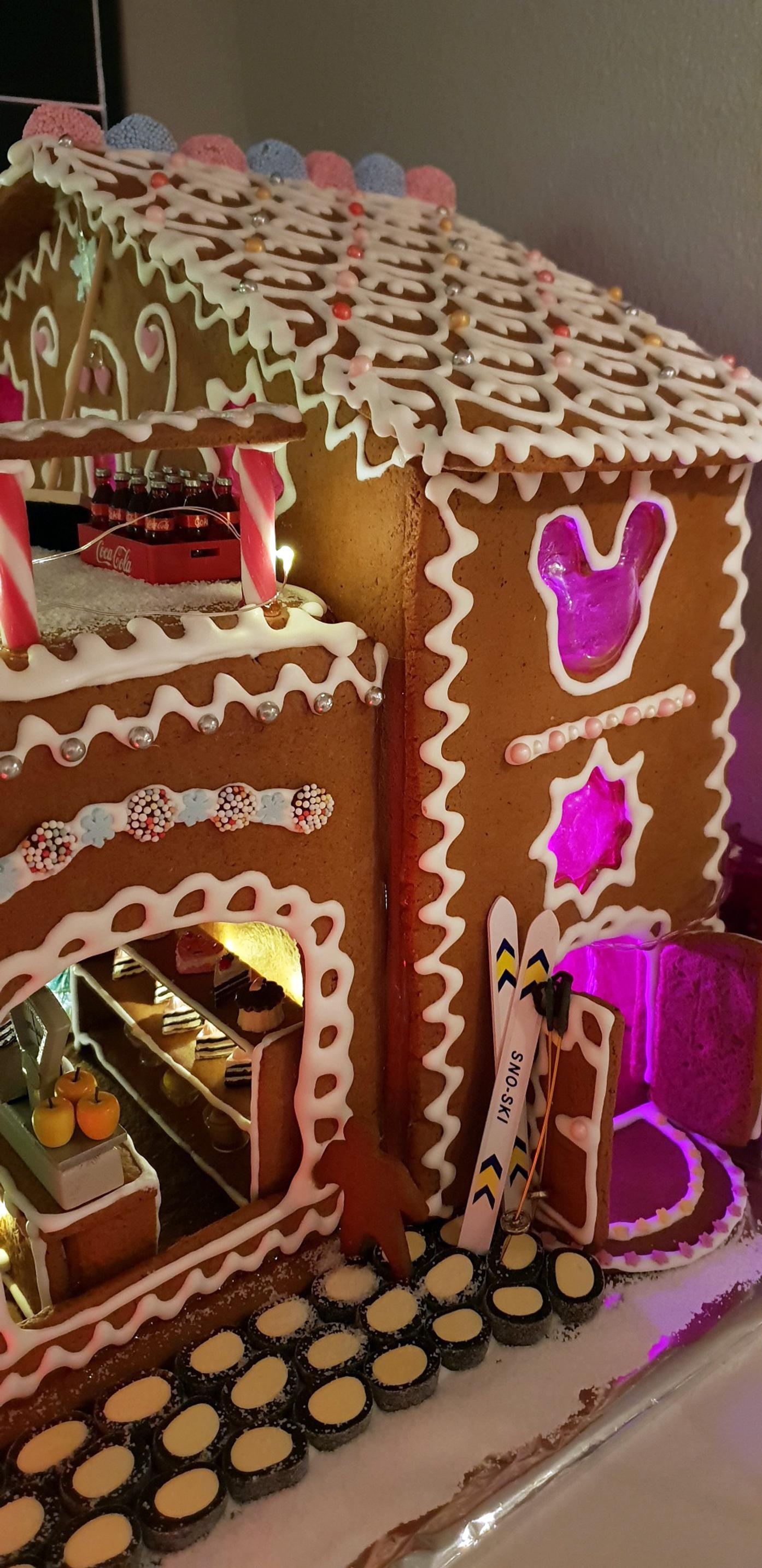Taikinaa kului pari kiloa, pikeerin tekoon tomusokeria puolitoista kiloa ja tusinan kananmunan valkuaiset. Lisäksi käytimme erilaisia irtokarkkeja, kuten lumilyhdyssä sekä parvekkeen kaarteessa olevaa liitulakua. Ikkunoiden ja muiden läpinäkyvien pintojen tekoon paras materiaali on murskattu muumitikkari, joka sulaa uunissa. Murskausvaiheessa tarvitaan yllättävän järeää kalustoa, muun muassa isoa kumivasaraa.