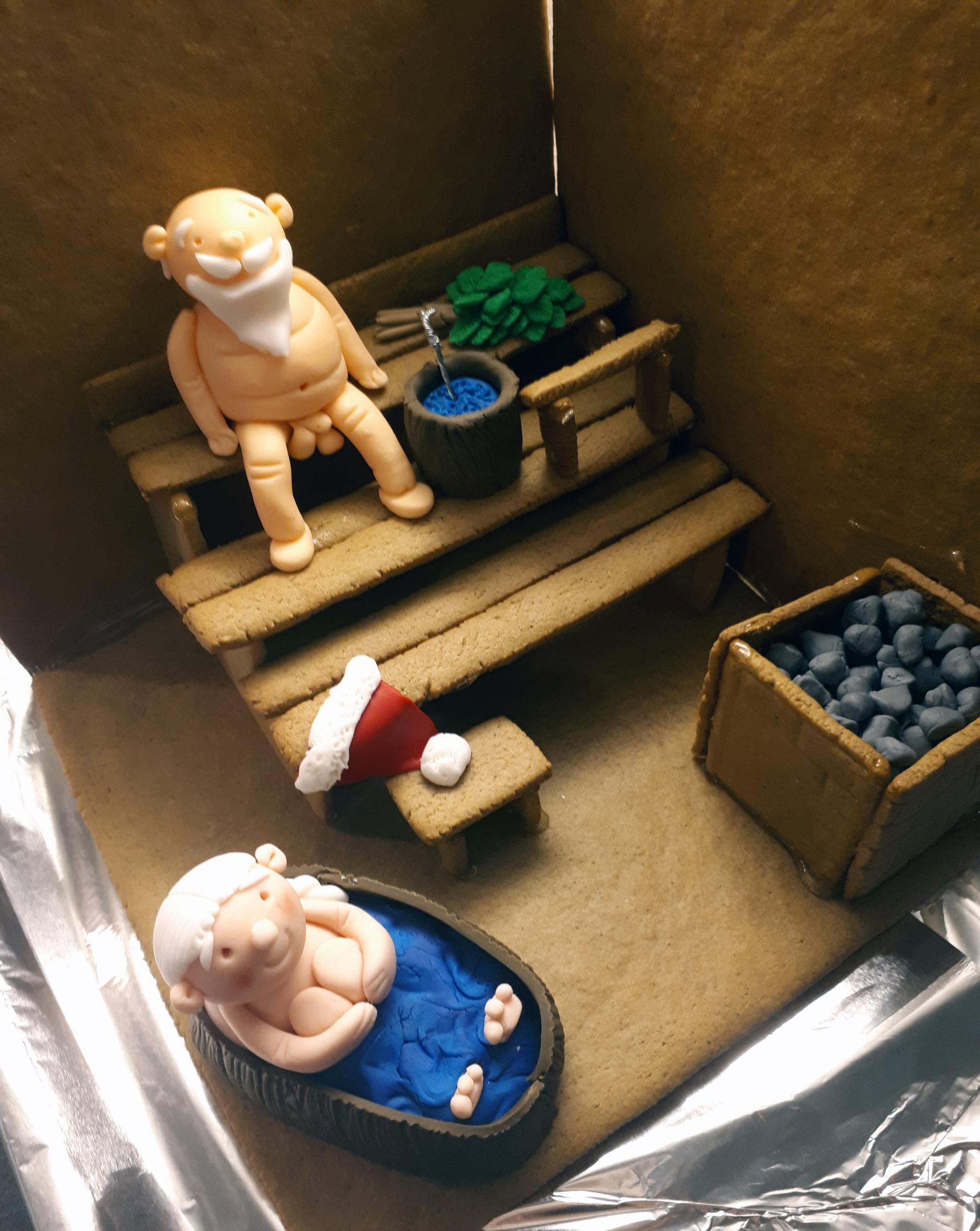 Myös joulupukilla ja muorilla on oikeus kaiken kiireen keskellä rentoutua sekä antaa aikaa itselleen ja toisilleen. Sen takia halusin askarrella heidät saunaan.