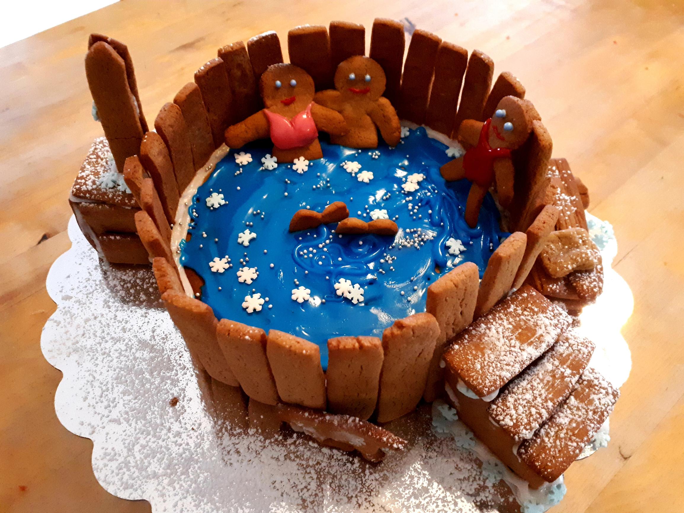 Paljussa on pohja ja sen päällä muutama tuki piparitaikinasta. Päällä on toinen pohja, jonka pinnan värjäsin vedeksi sinisellä sokerimassalla. Paljun laudoitus on liimattu pikeerillä pohjiin kiinni. Lisäksi tein erikseen kamiinan, piparihahmot, koiran, rappuset, pari kuusta ja penkin. Alustana on kakkualusta.