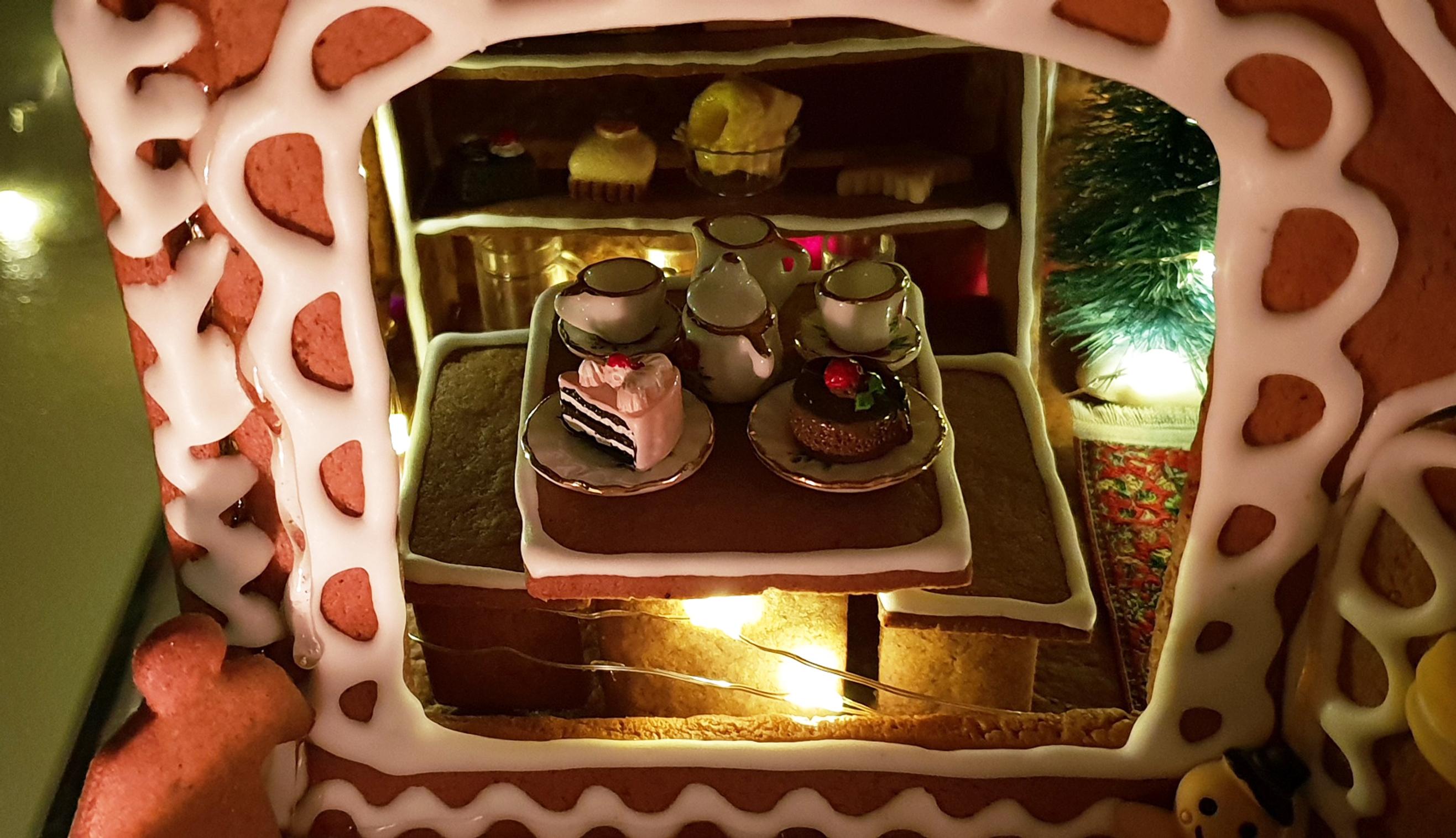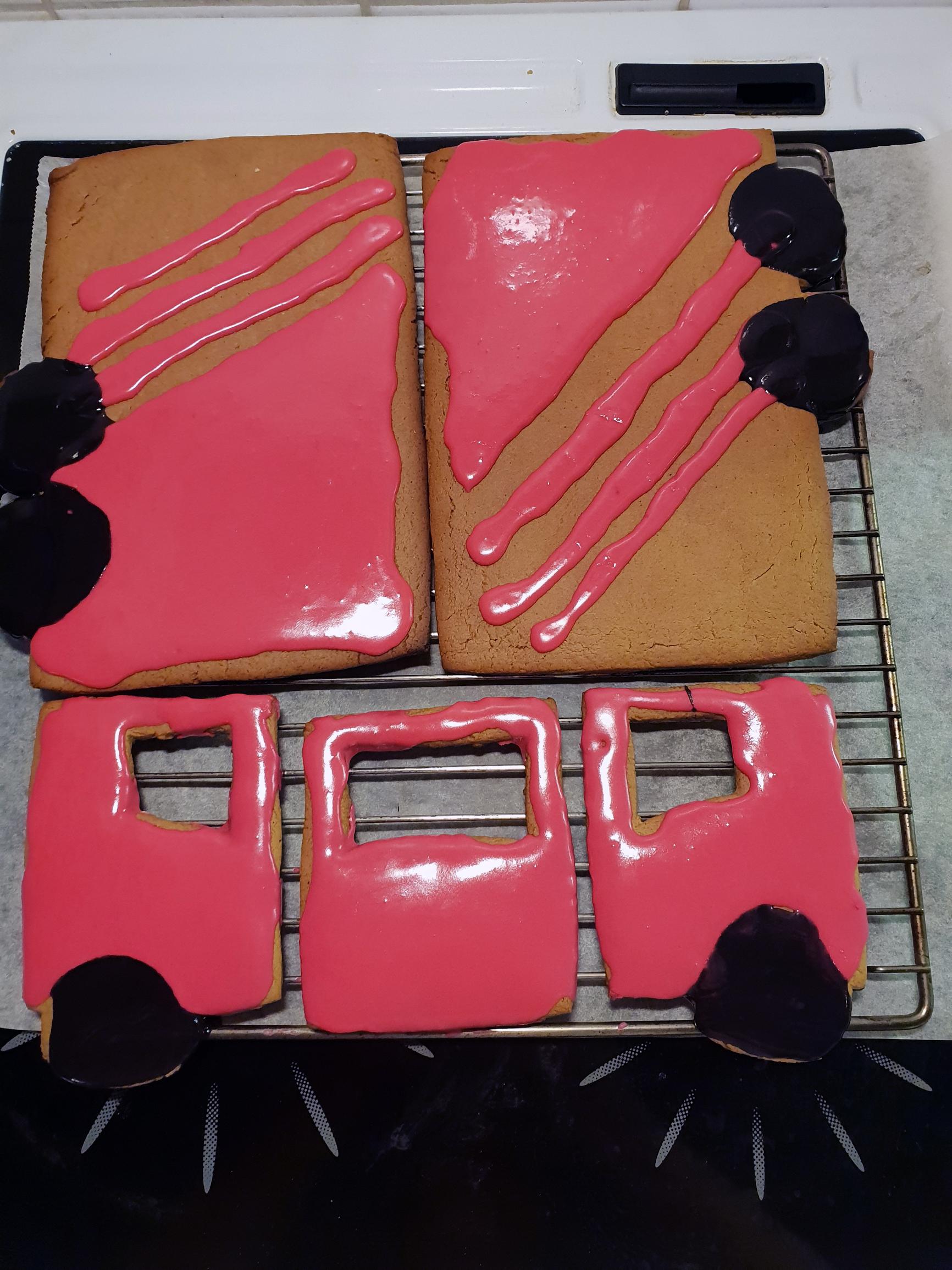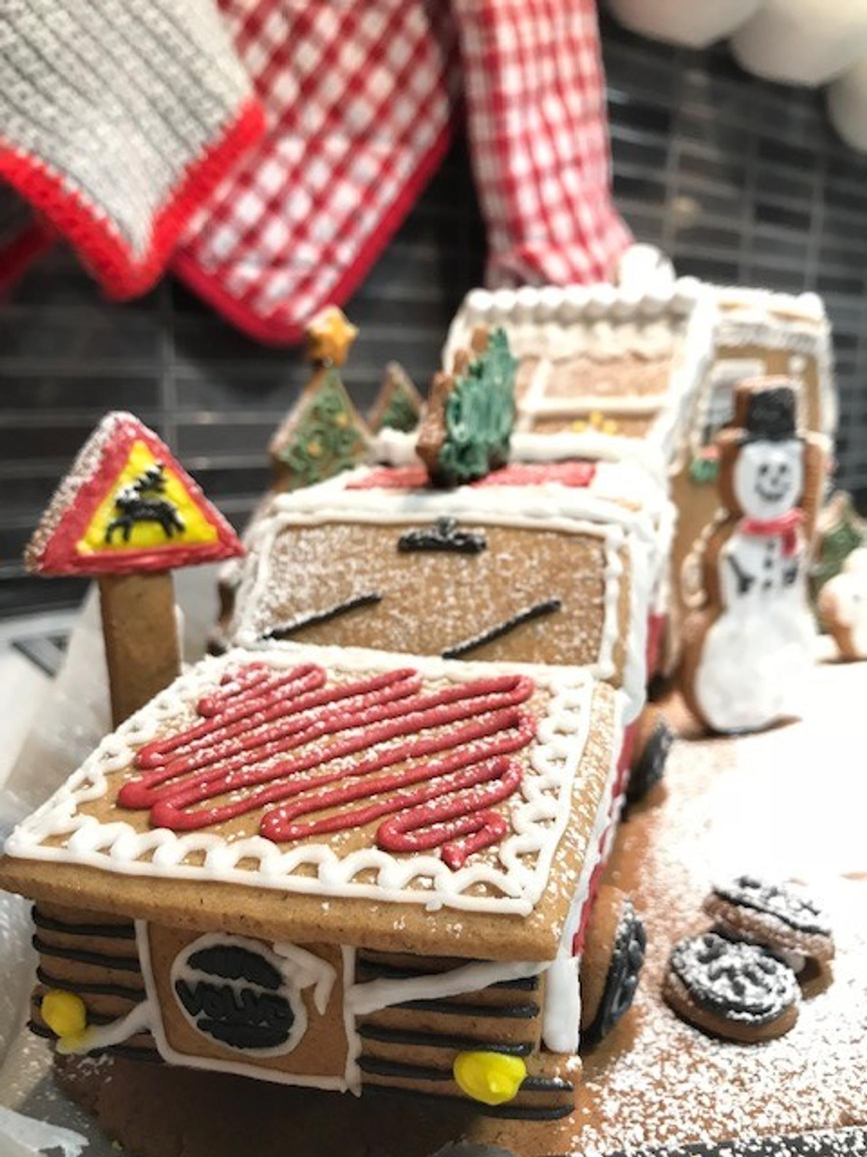 Keittiöni oli junapajana kaikkiaan puolitoista viikkoa. Yhtenä iltana tein suunnitelman ja kaavat, toisena leivoin osat, muutamana seuraavana koristelin, sitten kasasin ja viimeistelin… Toki jännitysmomenttia oli aina siinä, miten osat paiston jälkeen istuvat toisiinsa, mutta mitään suuria vastoinkäymisiä ei tullut – ei ainakaan sellaisia, joita ei olisi voinut pikeerillä peittää.