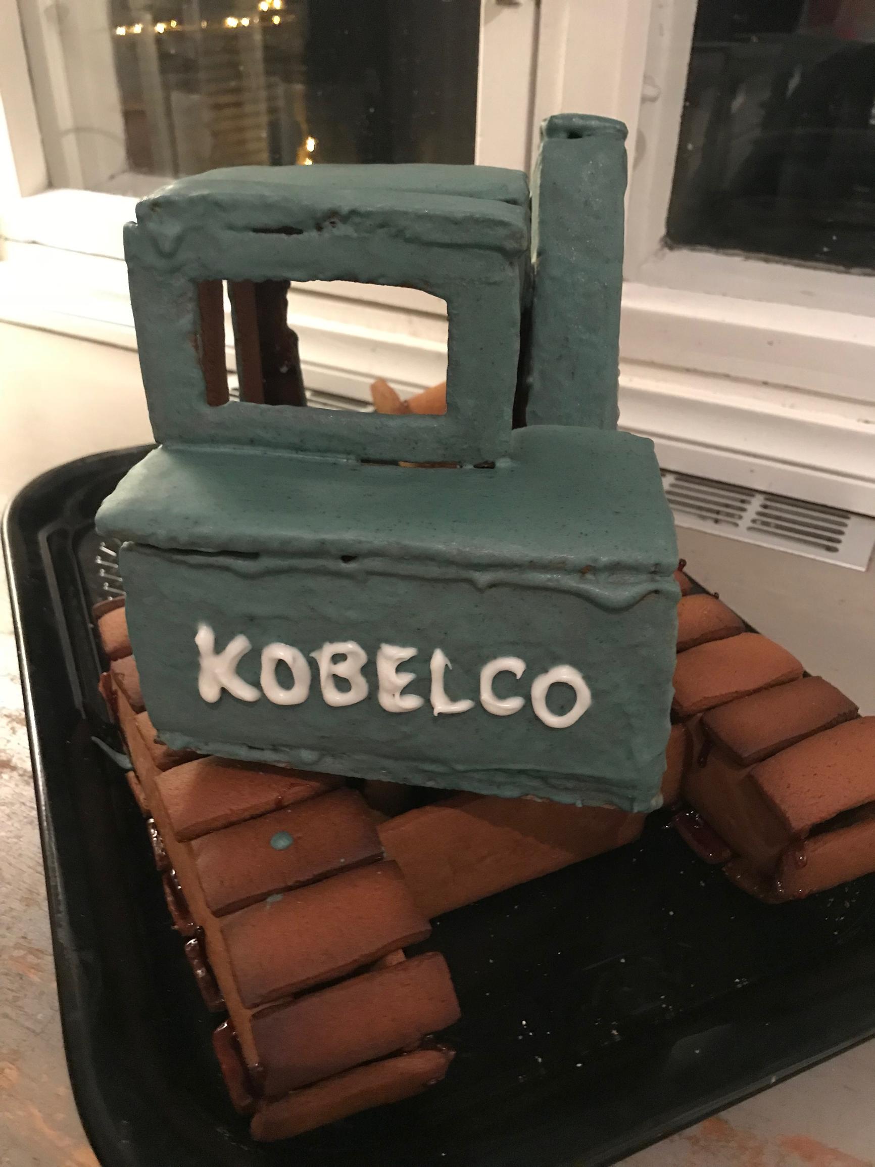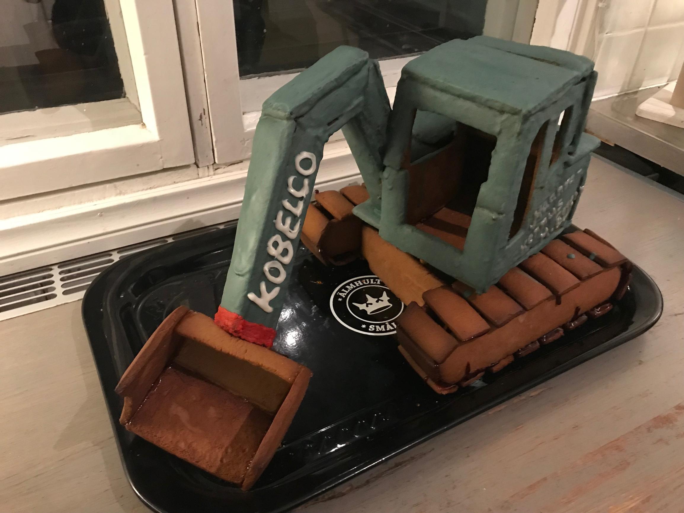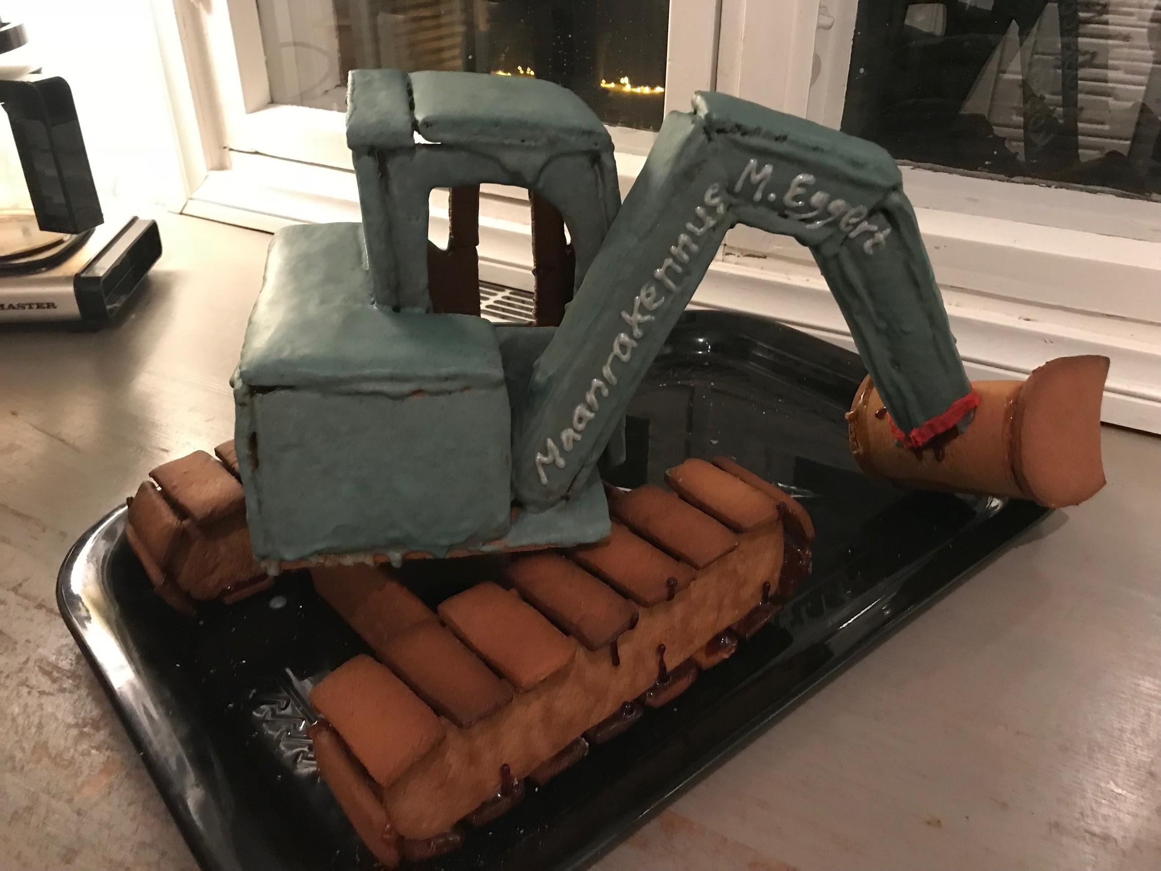 "Viime jouluna keksin jostakin väsätä piparista mieheni kaivinkoneen. Hänellä on oma maanrakennusyritys, Maanrakennus M. Eggert. Tein sen mieheni ja silloin muutaman kuukauden ikäisen poikamme iloksi, ja mies tykkäsikin piparikoneesta hirveästi. Hän laittoi siitä kuvia maansiirtoalan Facebook-ryhmään ja lähetti kuvia myös yritykselle, jolta oli ostanut Kobelco-kaivurinsa.