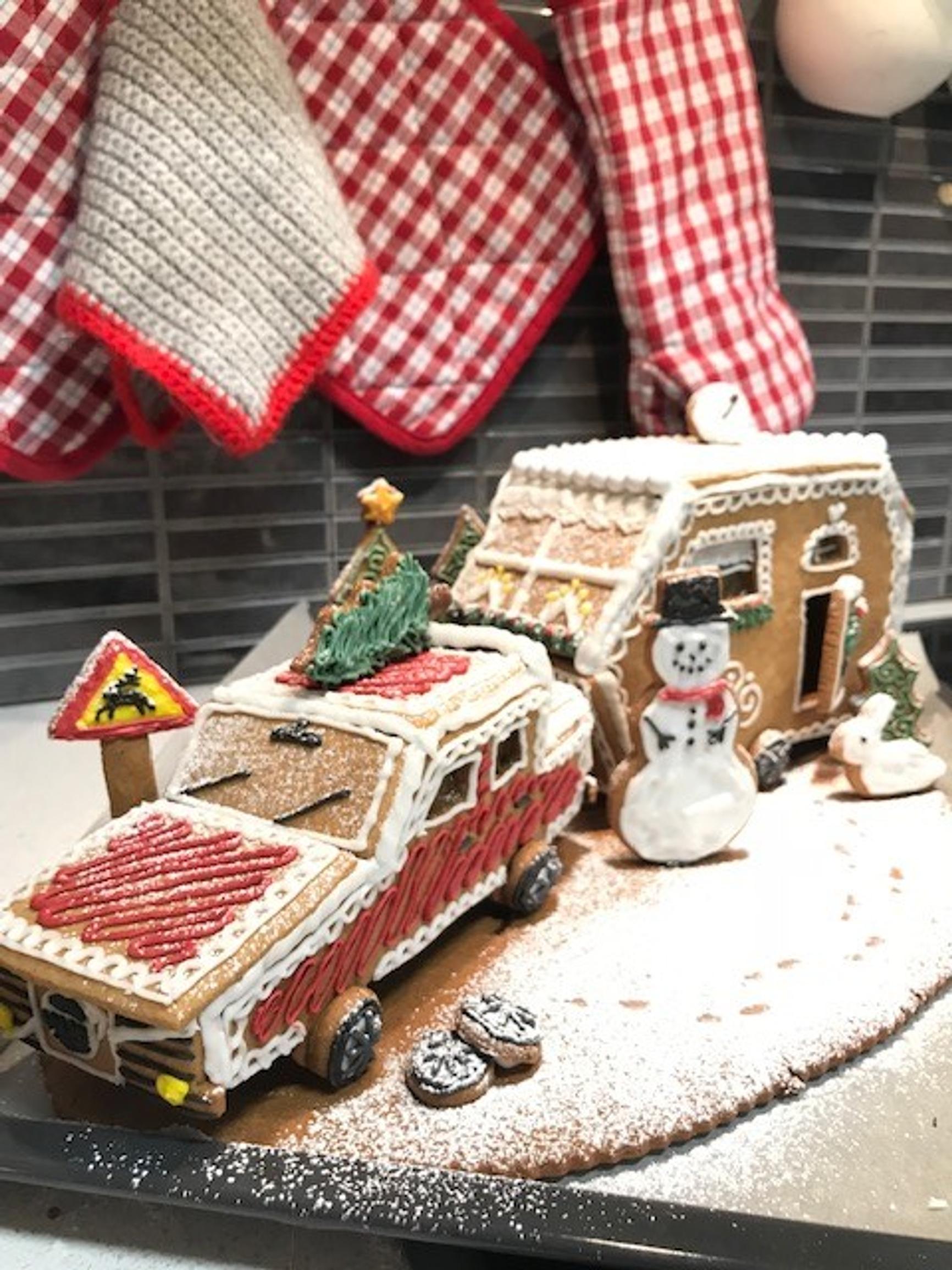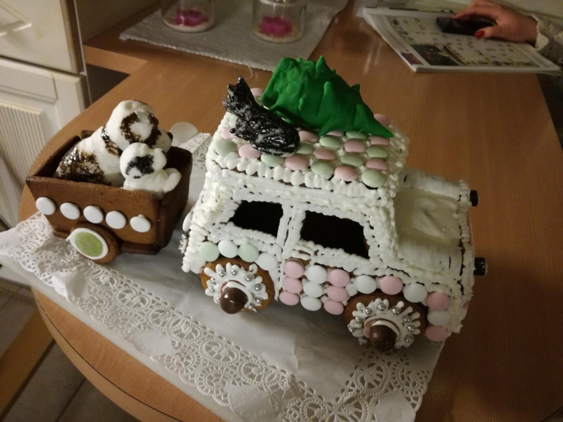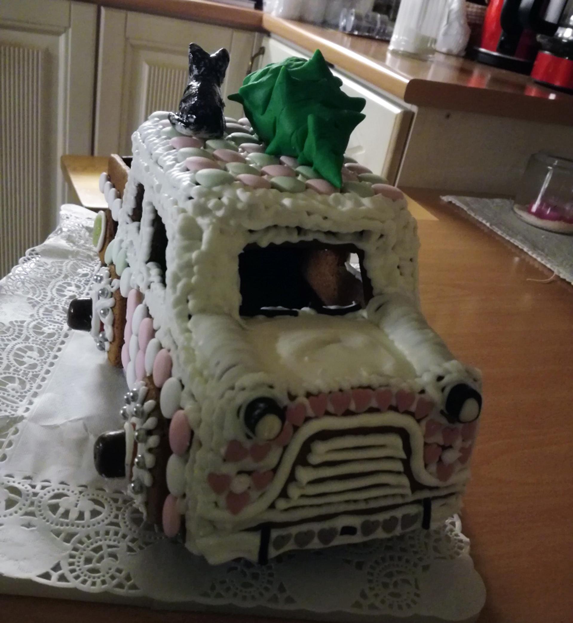Tänä vuonna ostin Minna Immosen joulukalenterin, jossa oli joulupukki ja -muori ajavat Minillä ja peräkärryllä. Kun itsellänikin on kulkupelinä Mini, ajattelin, että teenpä piparista Minin ja peräkärryn. Pikkuhiljaa idea alkoi rikastua. Meille on tulossa taas ”jouluvauva”, toinen bernhardinkoira Oku eli poika Luukkainen. Lisäksi meillä asustaa kissaneiti Virve Rosti eli Viki. Tänä vuonna kaikki elikot pääsivät siis Minin kyytiin!