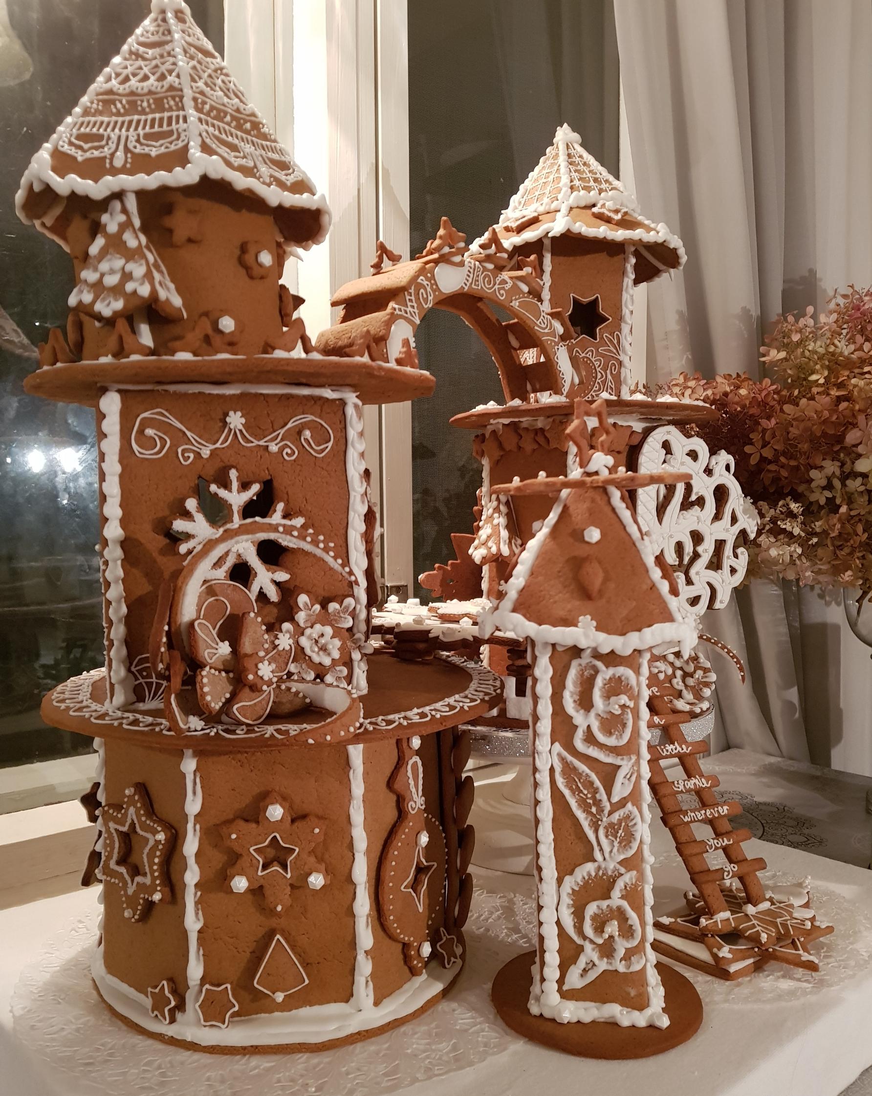 "Perheeni pyysi minua tekemään kotiin piparitalon, ja inspiraation satulinnaan sain Pinterestin kauniista piparkakkuteoksista. Ammattilainen en missään tapauksessa ole, vaan enemmän sellainen satunnaisesti mustikkapiirakkaa leipova kotiäiti. Päätin kuitenkin heti, että mikään tavallinen ei riitä.