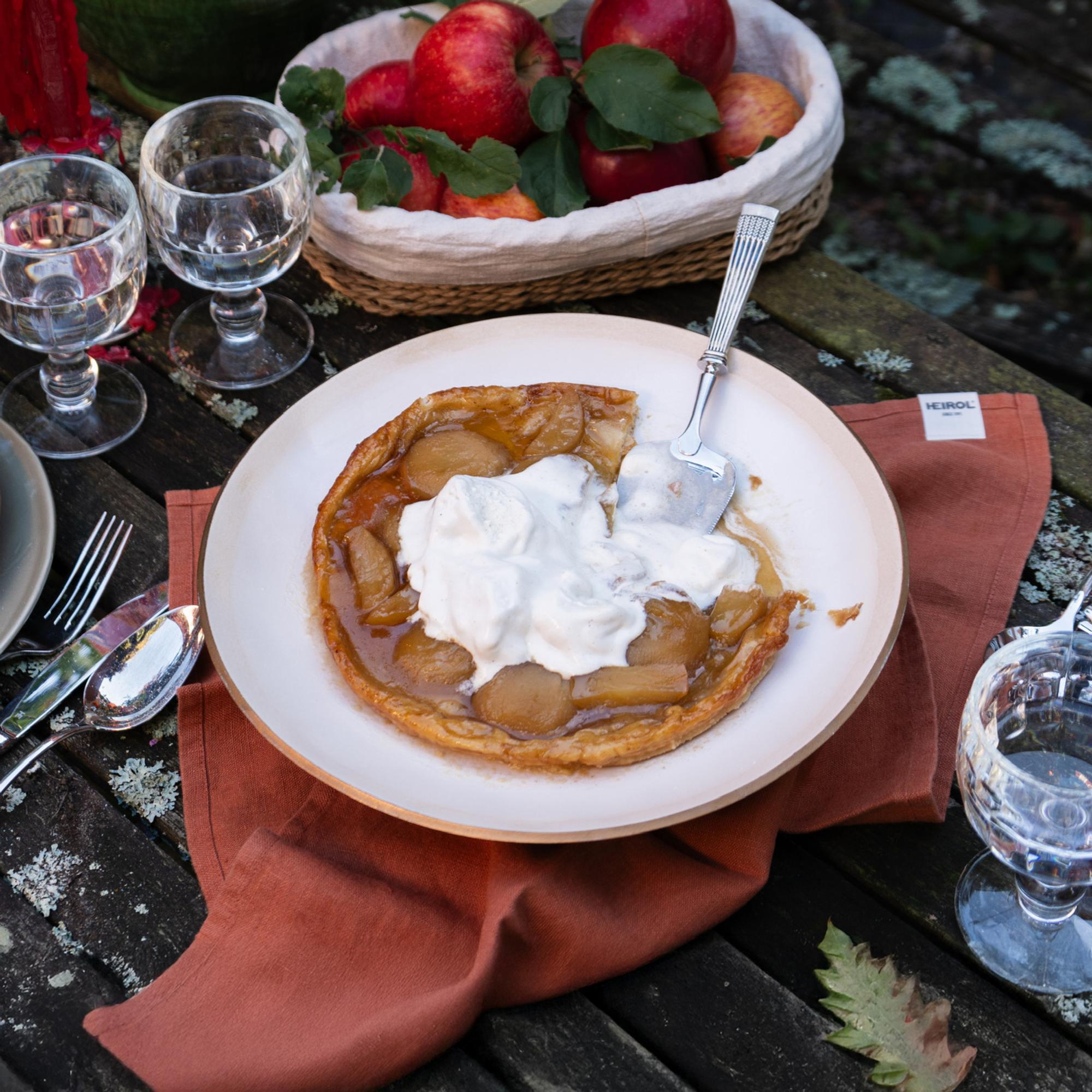 Keikauskakut eli tarte tatinit karamellisoituvat ja paistuvat herkullisen rapeiksi valurautapannulla. Tämä jämerä valurautapannu kestää uunin kuumuutta 250 celsiusasteeseen saakka ja on hyvin hoidettuna kokkaajan ikuinen apuväline.