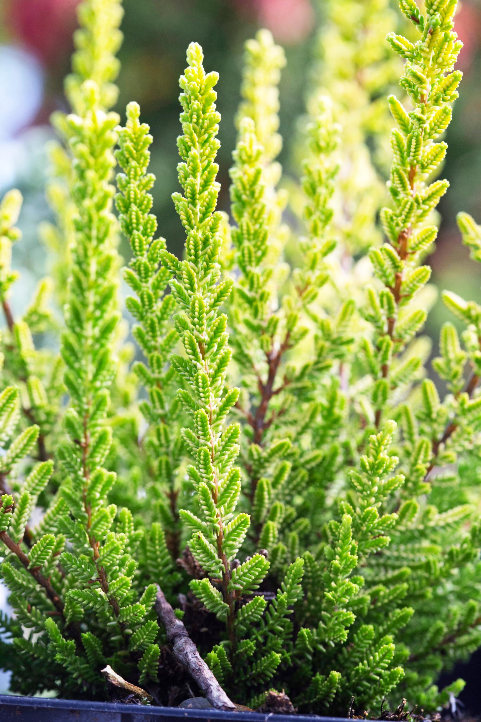 Kanerva 'Zeta' ei kuki, mutta kerää katseet jäykän pystyllä kasvutavallaan ja hohtavan kellanvihertävillä lehdillään.