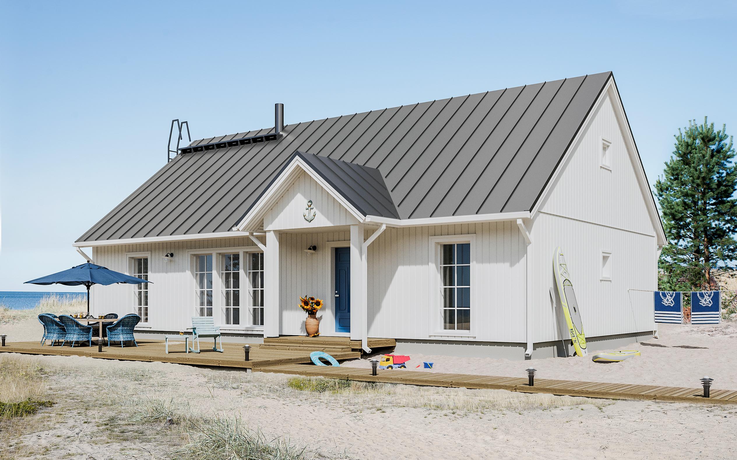 Kiinnostava Beach house -versio on saanut inspiraationsa Amerikan itärannikon taloista. Julkisivu on pelkistetty, mutta ruutuikkunat ja pystylaudoitus sekä harjakuisti tuovat beach housille tyypillisen ilmeen ja pehmentävät kokonaisuutta. Tämä vaihtoehto tuotiin modernin ja perinteisen arkkitehtuurin väliin.