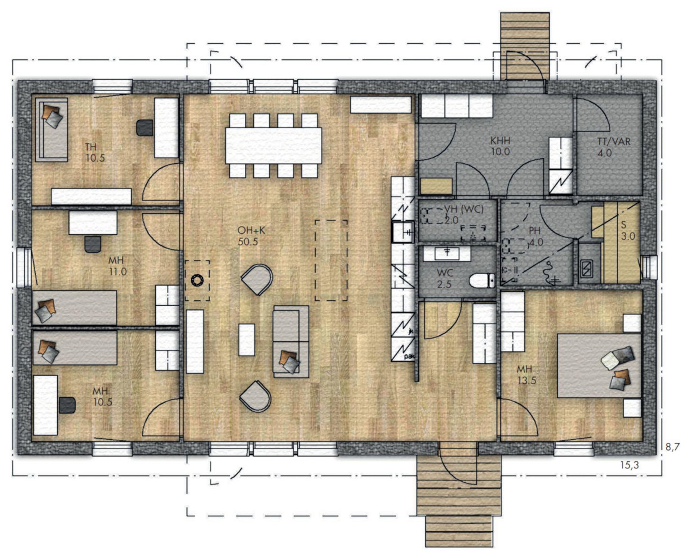 Kaksikerroksinen talomalli Juhla 150 suunniteltiin Venla-talomallin pohjalta. Taloon saa peräti viisi makuuhuonetta, ja siksi se hyvin isommallekin perheelle.
