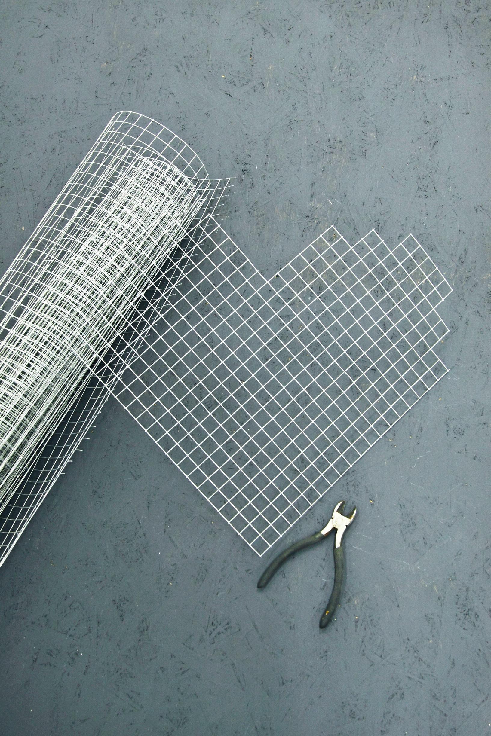 1. Katko sivuleikkureilla verkosta 23 × 23 ruudun pala. Muotoile pala sydämeksi. Taivuta rullalla ollut verkkosydän suoraksi. Valitse kahden ruudun levyisiä, kuivia, tasakokoisia käpyjä.