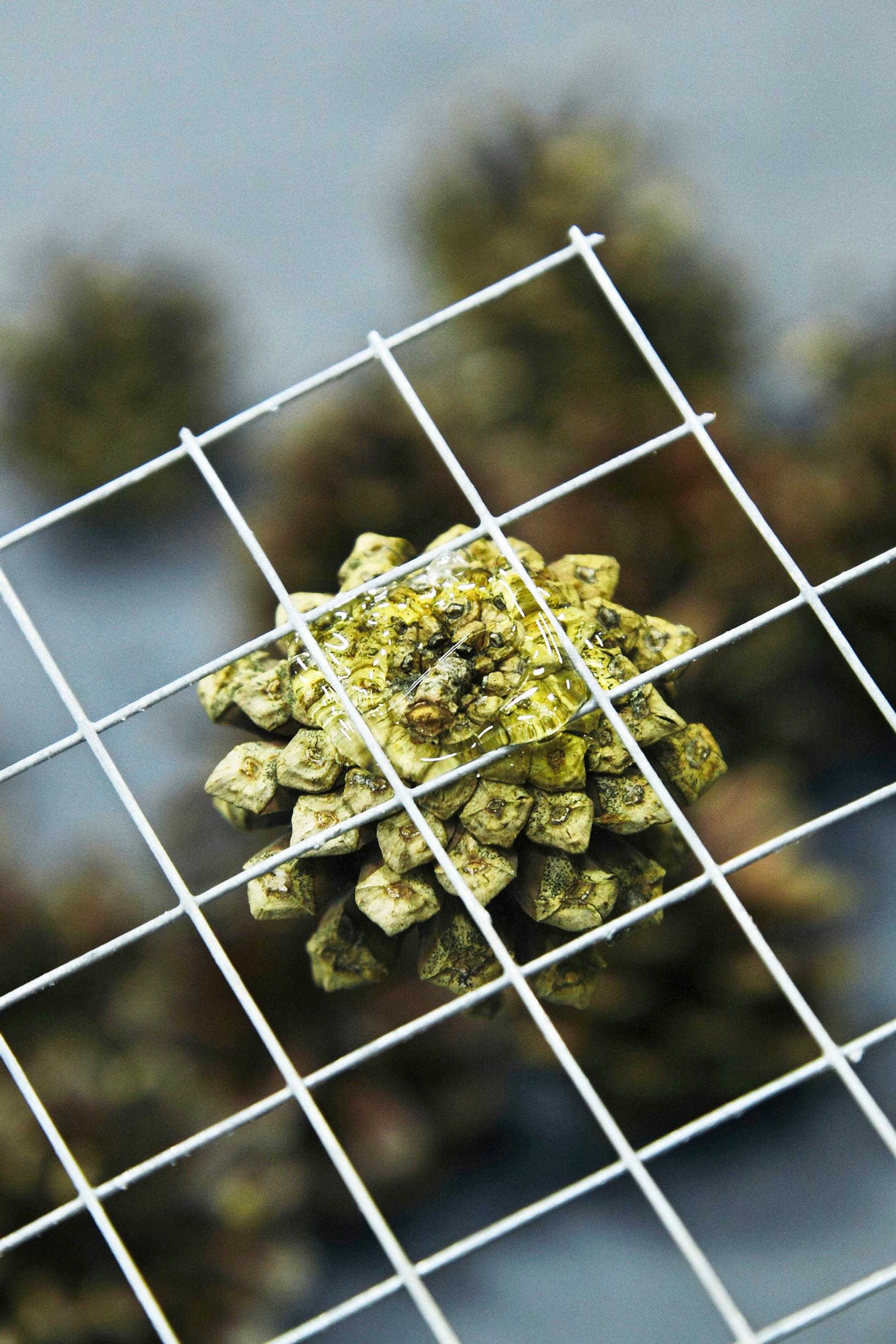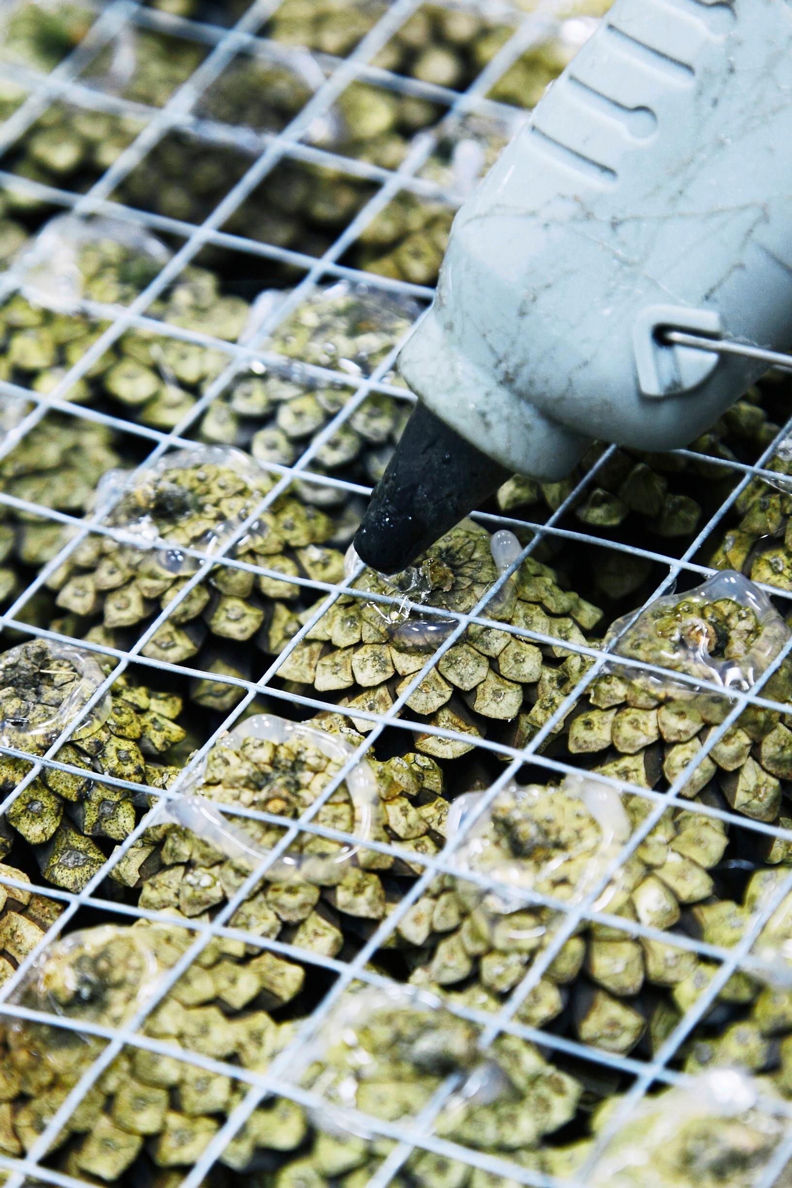 2. Pursota kuumaliimaympyrä sentin etäisyydelle kävyn tyvestä. Odota, että liima jäähtyy hieman ja paina käpy verkkoon, toiseen ruuturiviin. Tue käpyä hetkisen liiman jähmettyessä.
