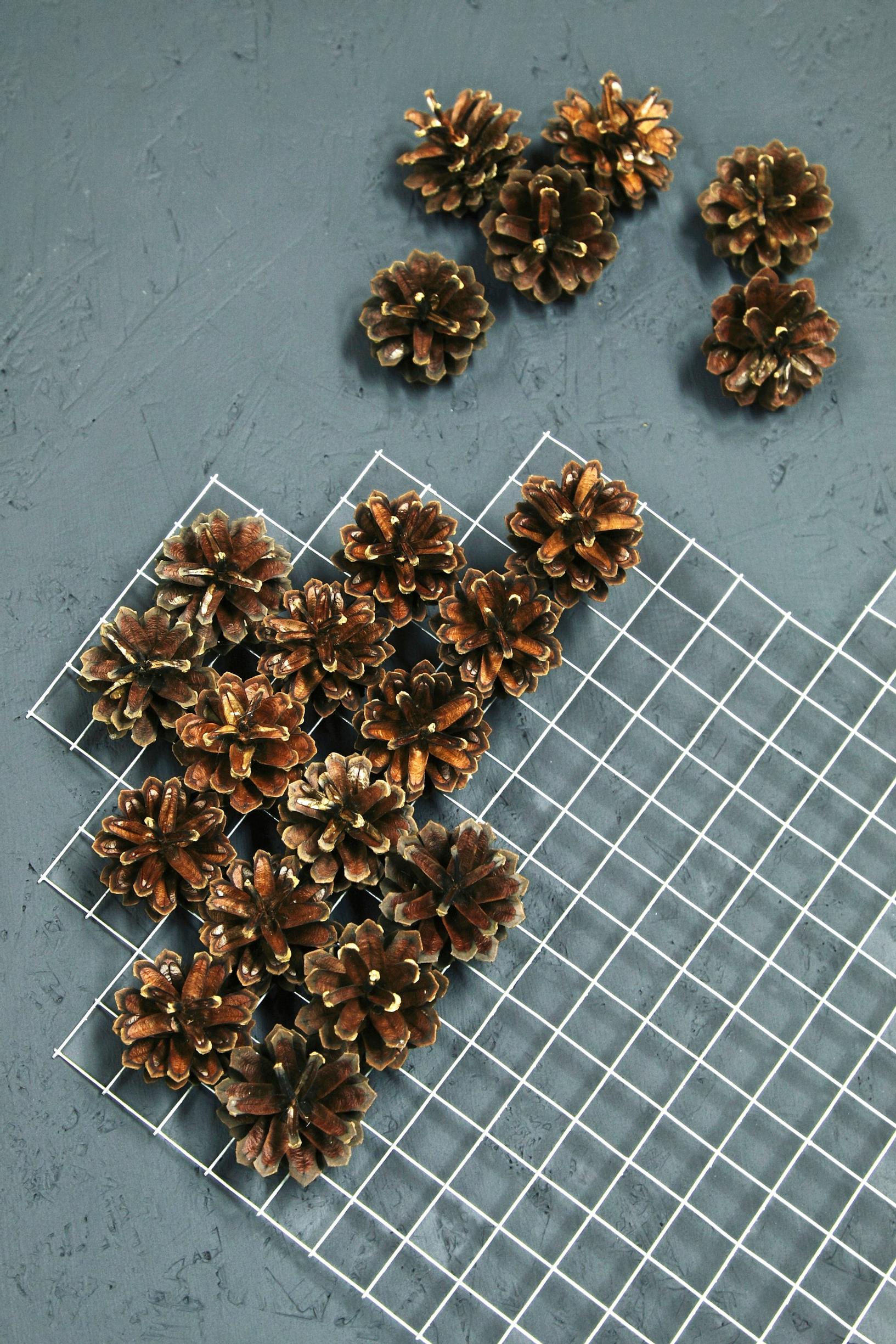 3. Pidä verkkoa irti työtasosta ja liimaa käpy kerrallaan joka toiseen ruutuun. Puolitoista ruutua suuntaansa täyttävät kävyt peittävät pohjaverkkoa mahdollisimman hyvin.