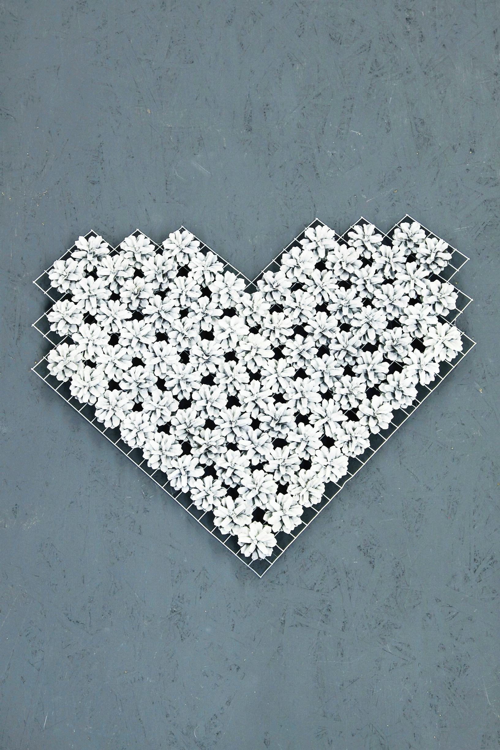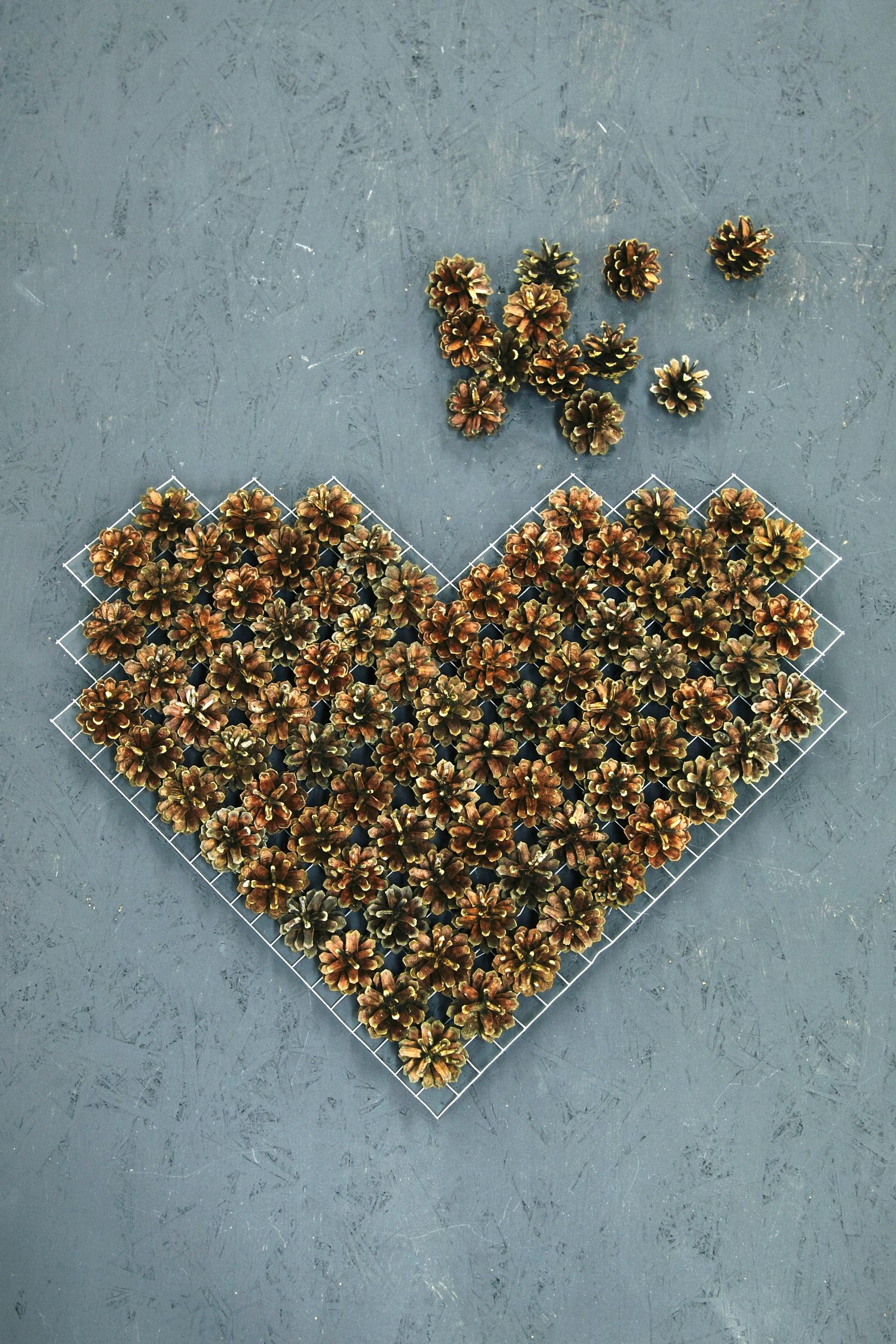 4. Käytä samanmuotoisia ja samankorkuisia käpyjä, jotta pinnasta tulee mahdollisimman tasainen. Kun kaikki 120 käpyä on liimattu verkkoon, sydän on valmis.