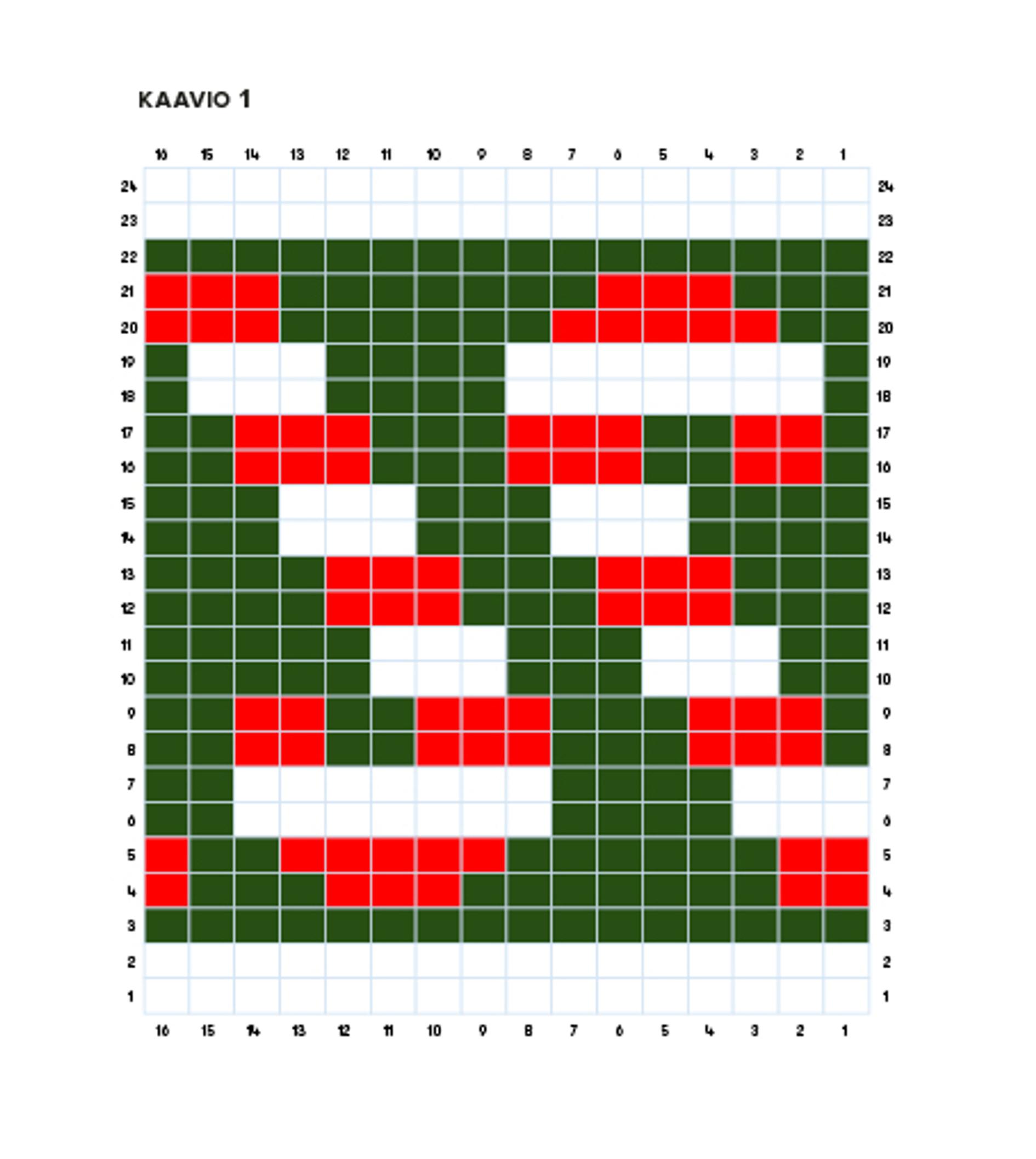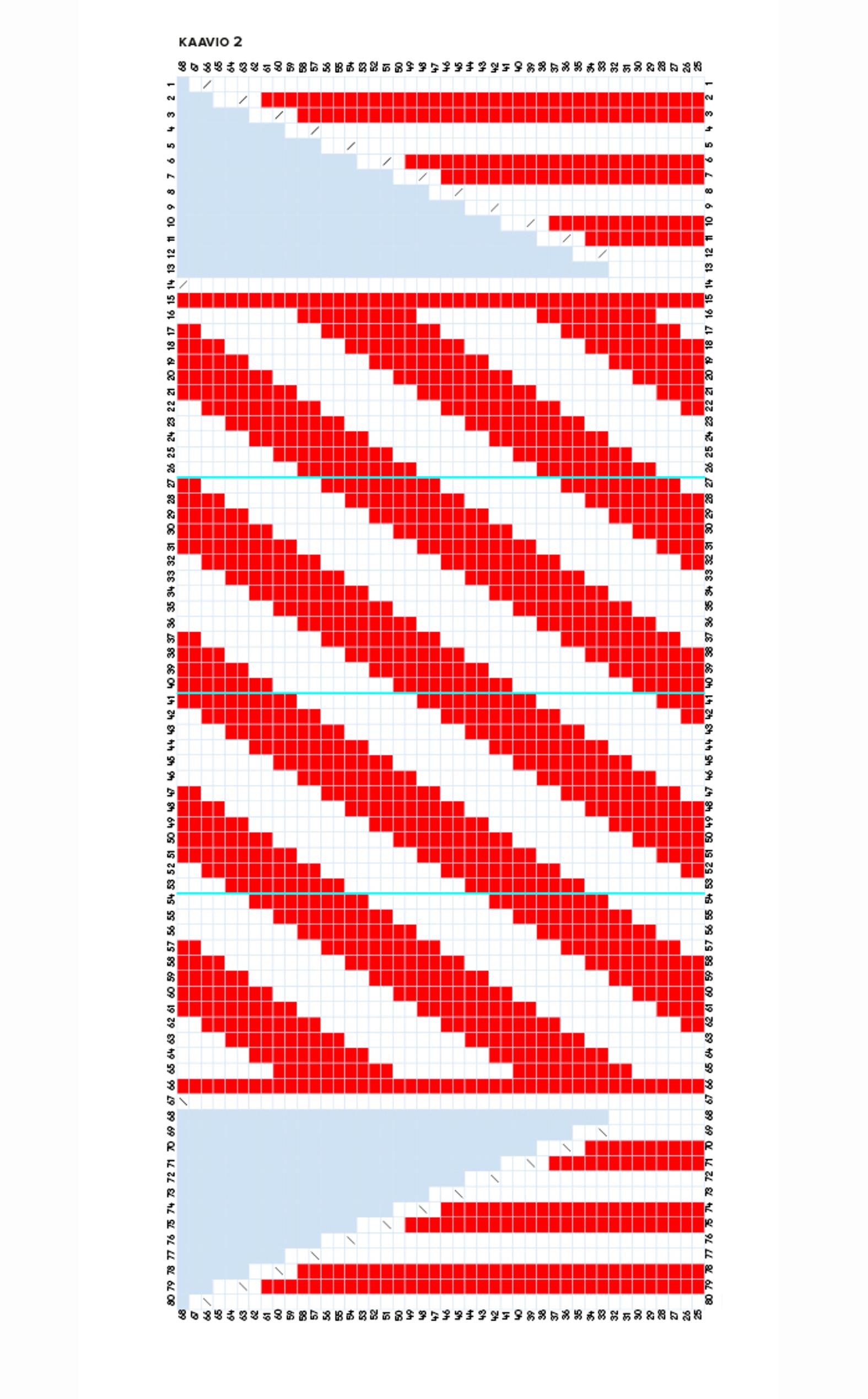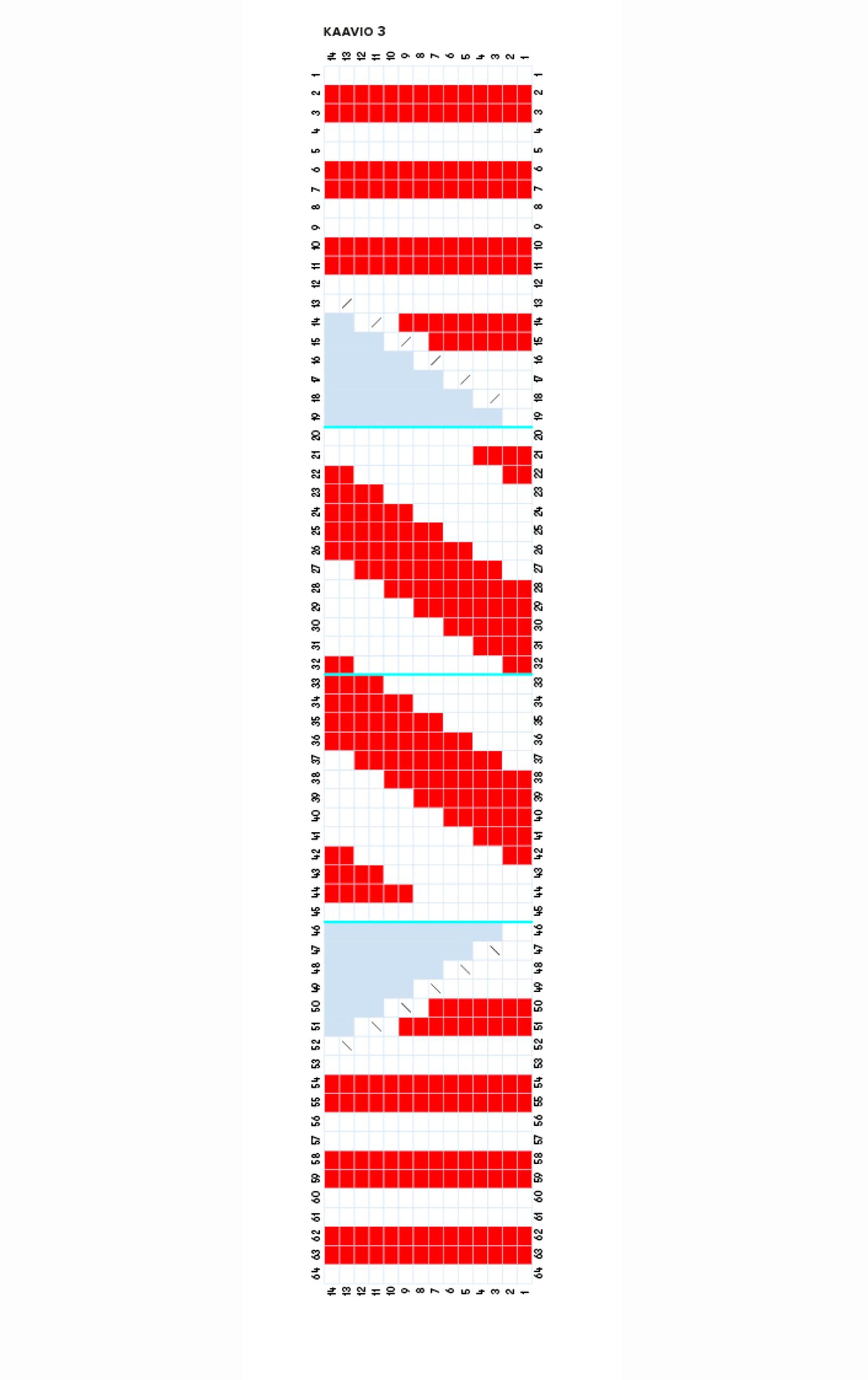 - Kun olet neulonut kaavion, sinulla on puikoilla 54 s. Jaa silmukat 13/14/13/14. Jatka seuraavasti: neulo 1. puikon ensimmäinen s valkoisella ja toinen punaisella. Jatka diagonaalikuviota 1.–4. puikot, kunnes jäljellä on 4. puikon 2 viimeistä s. Neulo toiseksi viimeinen s punaisella ja viimeinen s valkoisella. Jatka näin yhteensä 20 krs:ta, jolloin lisäyksen jälkeisiä krs:ia on 24+44+20=88.
