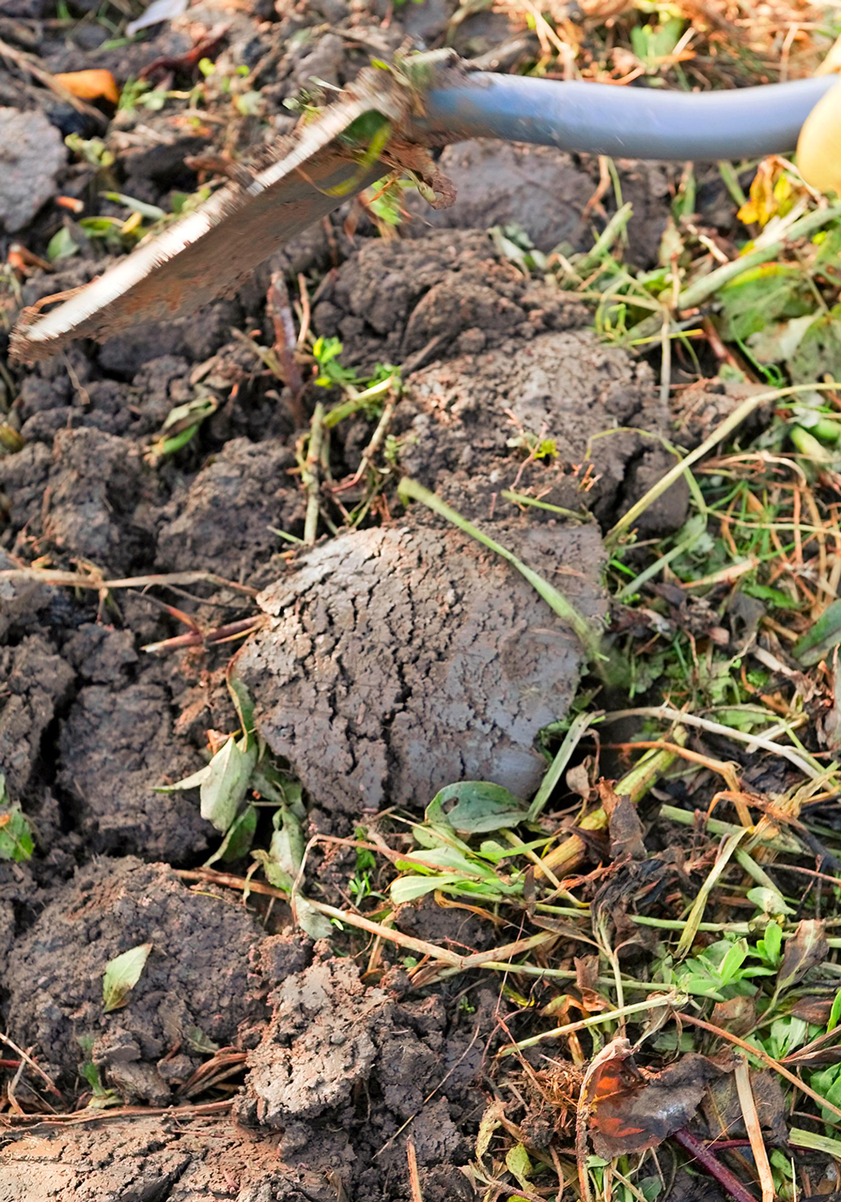 3. Käännä savinen kasvimaa lapion tai talikon piston syvyydeltä sadonkorjuun jälkeen. Jätä maakokkareet sellaisenaan maan pinnalle. Silloin routa pääsee paremmin murentamaan niitä. Poista paakuista mahdolliset rikkakasvien näkyvät juuret jo syksyllä.