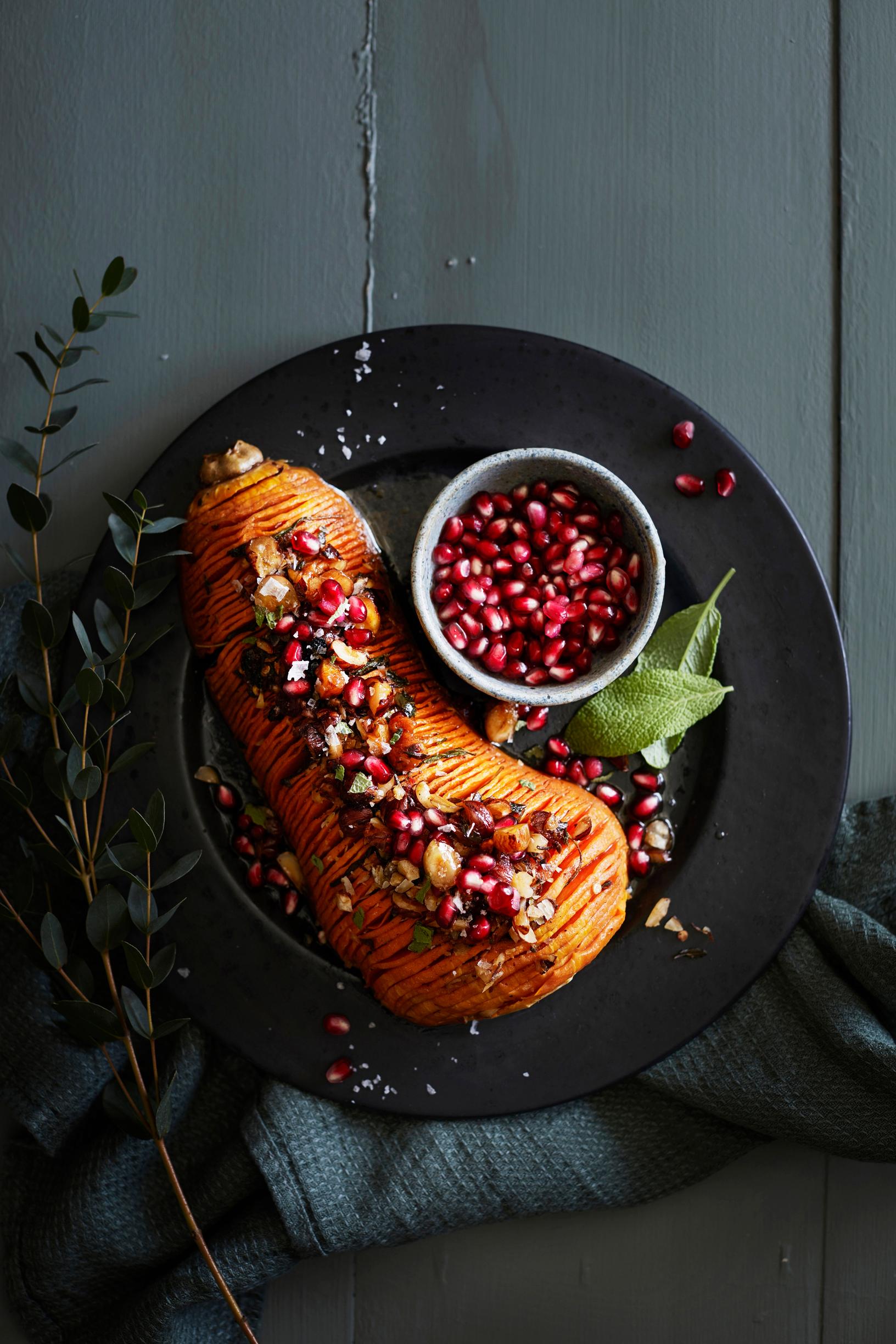 Hasselbackan kurpitsa on näyttävä vegaaninen herkku. Ras el hanout -mausteseoksella loihdit vaivattomasti marokkolaishenkisen makumaailman. Lisäsävyjä tuovat salvia ja granaattiomenan siemenet. Hasselbackan kurpitsan ohjeen löydät täältä.