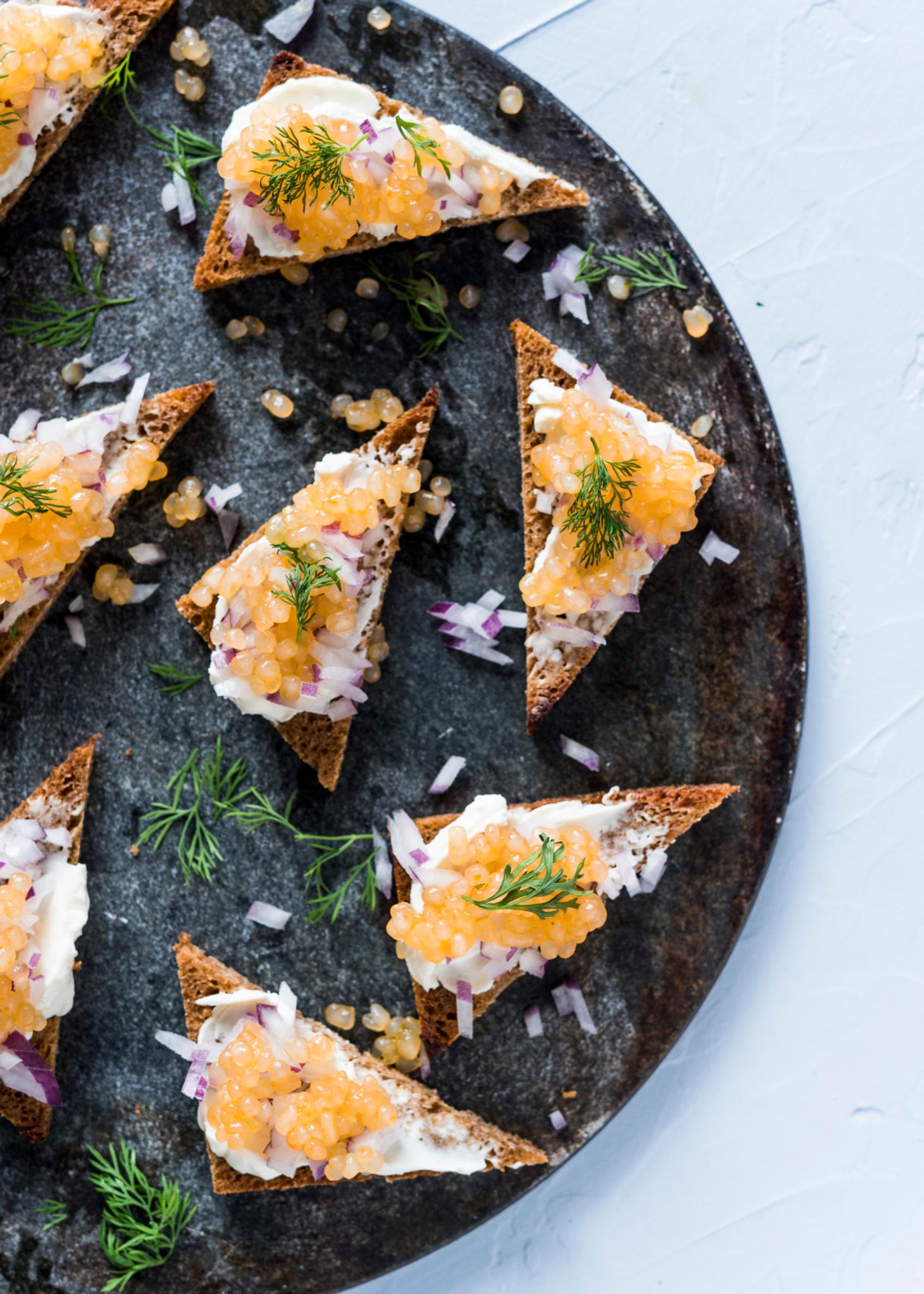 Tämä ei ole mätiä, vaikka siltä näyttääkin! Kyseessä on perunasuurimoista tehty vegaaninen mäti, jota bloggaajamme Perinneruokaa Prkl nimittää vegaariksi, vegaanin kaviaariksi. Ota vegaarin ohje talteen täältä. Alkupalapöytään sopii myös porkkanasta valmistettu vegaaninen "kylmäsavulohi" eli porkkala. Ohjeen porkkalan valmistamiseen löydät täältä.