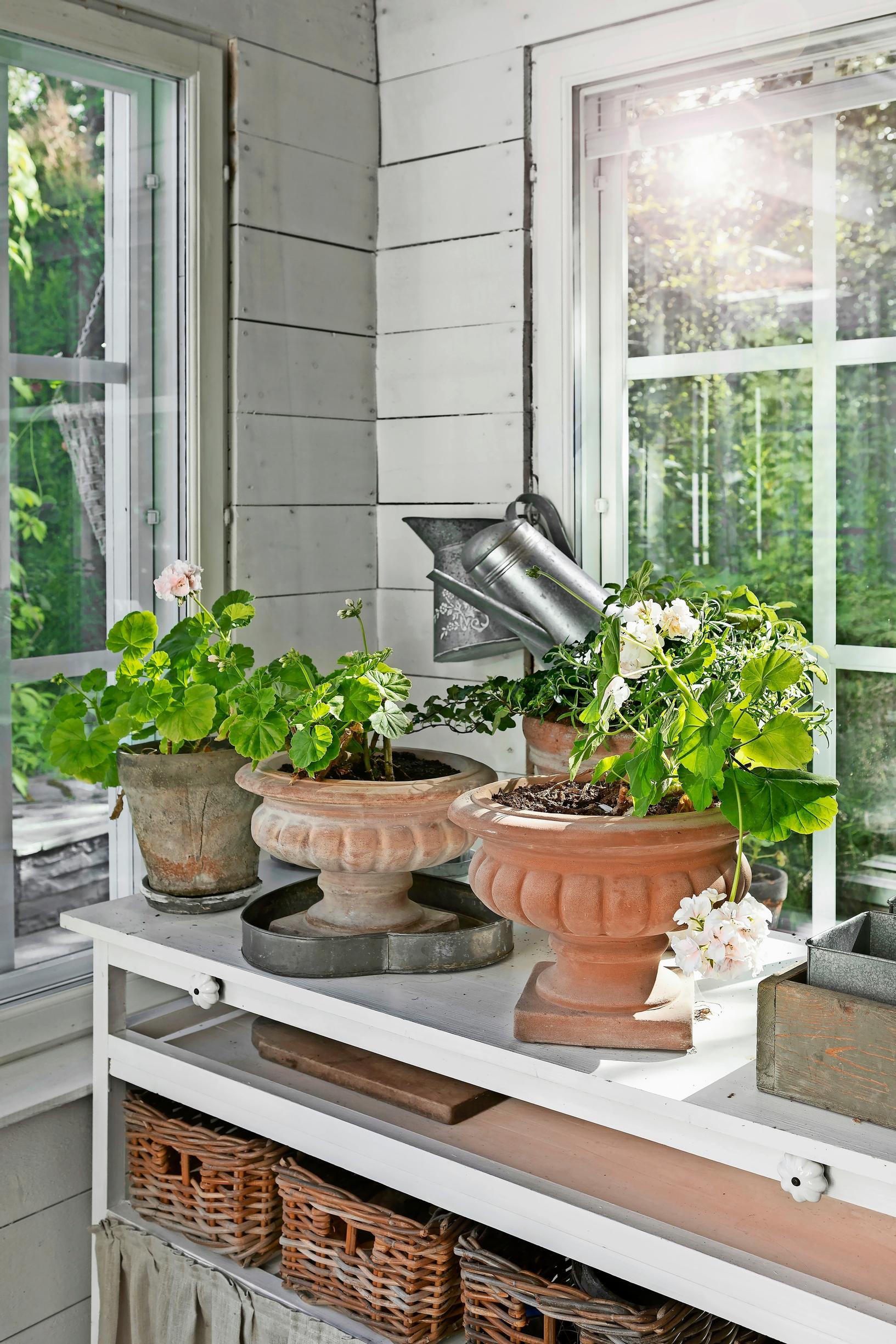 Vietän vihermökissä paljon aikaa myös kasvien parissa. Talvisin pidämme vihermökin noin 10-asteisena, ja siellä talvehtivat pelargonini ja oliivipuuni. Minusta on kiva käydä vihermökissä hoitamassa niitä ja ihmettelemässä, onko puhjennut uusia silmuja.