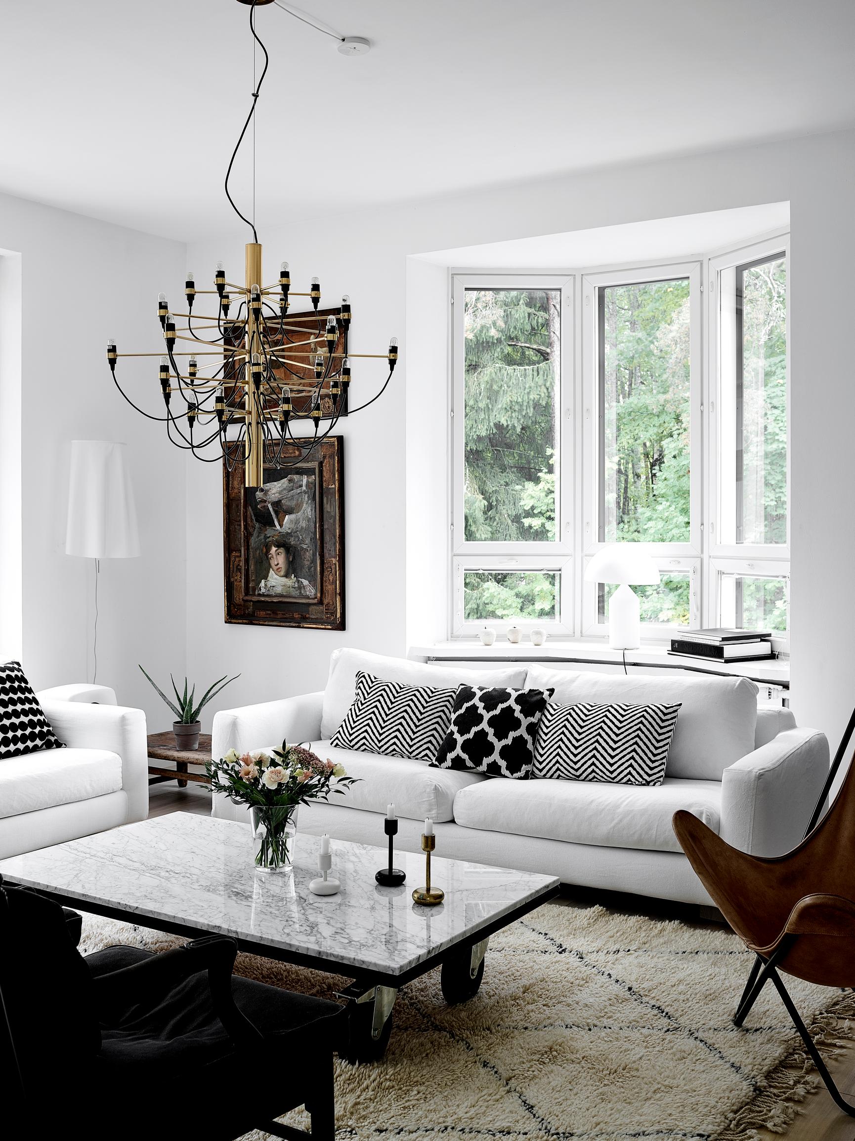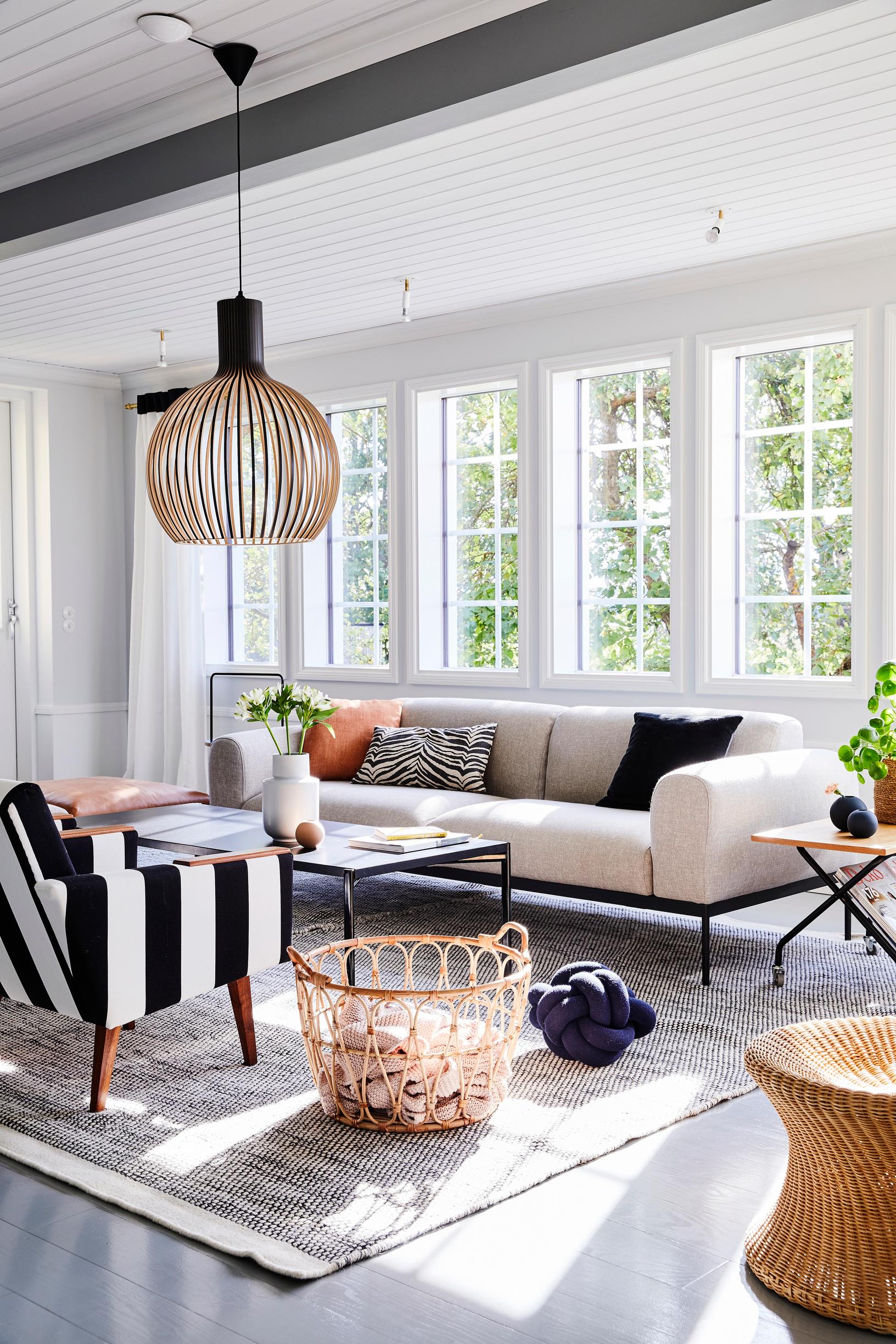 Iso riippuvalaisin, siro lattiavalaisin vai klassinen pöytävalaisin? Katso ideat skandinaaviseen tyyliin sisustetuista suomalaisista olohuoneista.