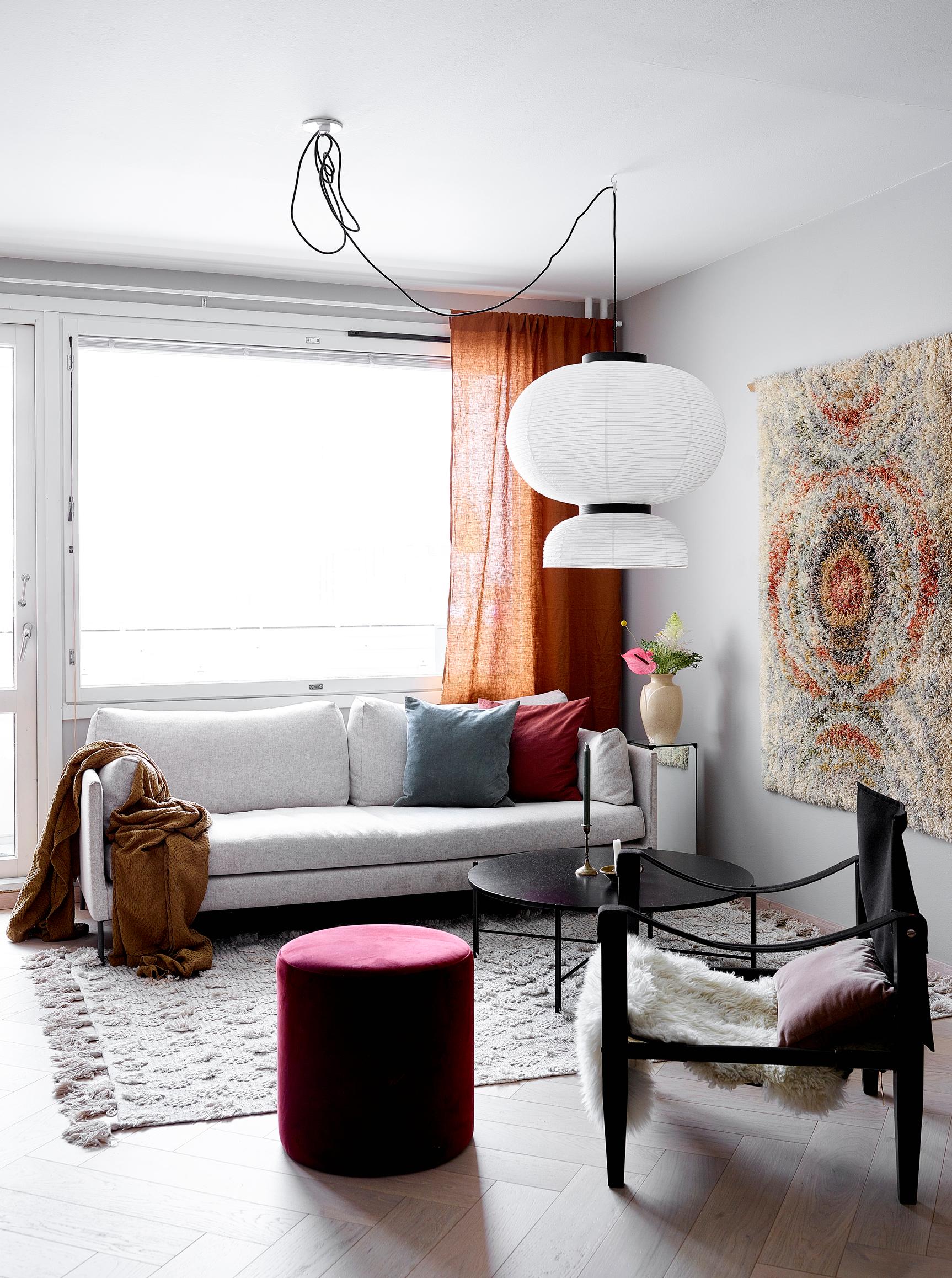 Moni pohtii, sopiiko kookas riippuvalaisin matalaan kerrostalohuoneistoon. Suuri mutta keveä riippuvalaisin on mainio normikorkuiseen (2,50 m) huonetilaan, sillä se saa tilan vaikuttamaan korkeammalta kuin se todellisuudessa onkaan. Tässä olohuoneessa kookas riisipaperivalaisin on ripustettu nerokkaasti huoneen sivuun. Sohvapöydän ylle ripustettua valaisinta ei tarvitse kumarrella.
