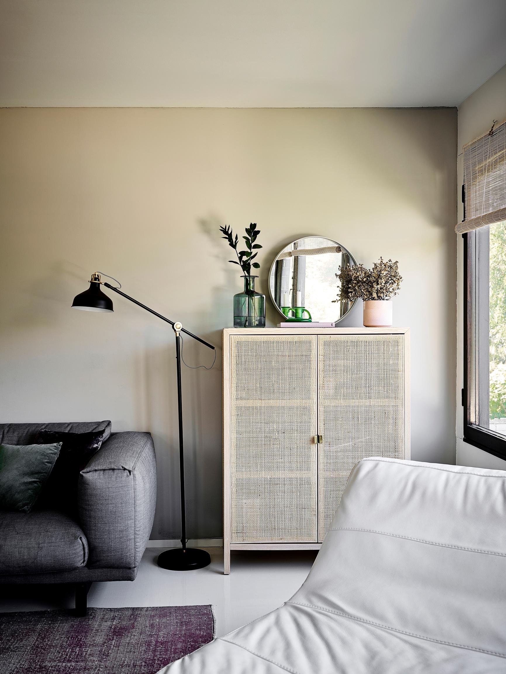 Sohvan pääty on ideaali paikka sirolle lattiavalaisimelle. Se antaa hyvän lukuvalon ja valaisimen kupua kääntämällä valon voi suunnata seinään korostamaan sen väriä. Musta teollisuustyylinen lattiavalaisin on trendikäs yhdistelmä beesin seinän kanssa.