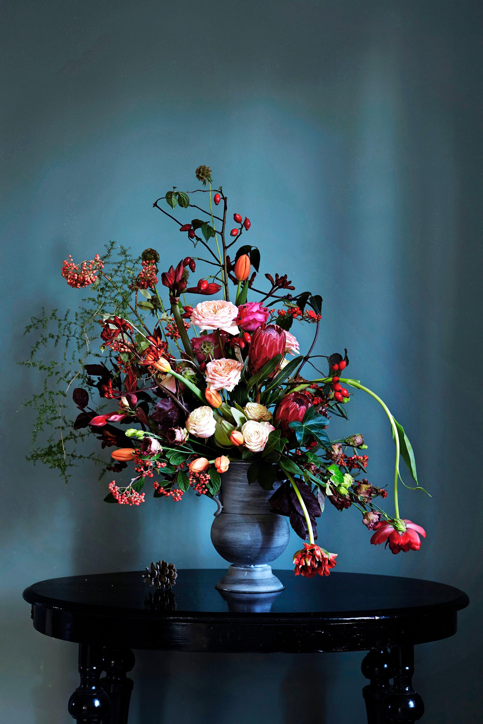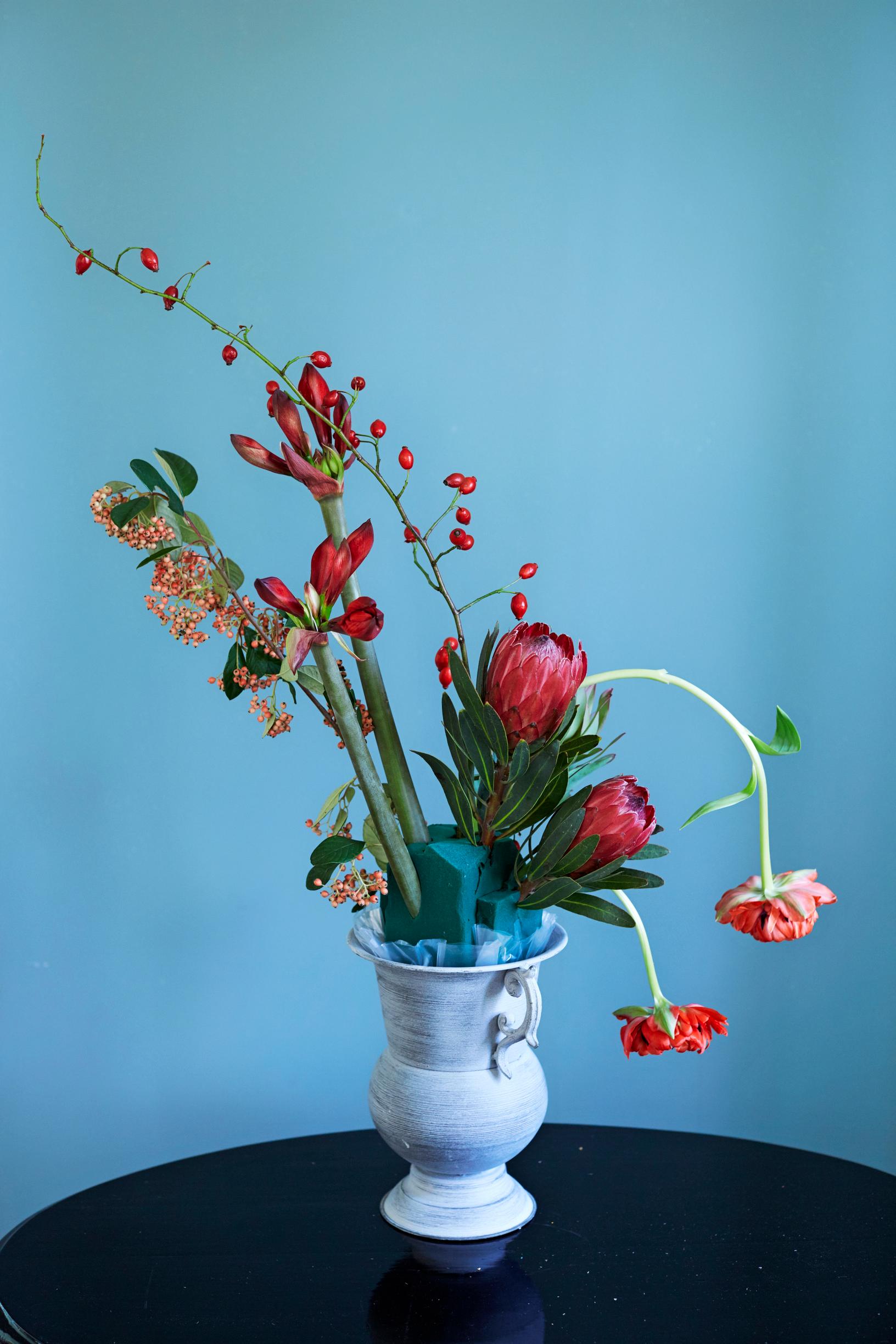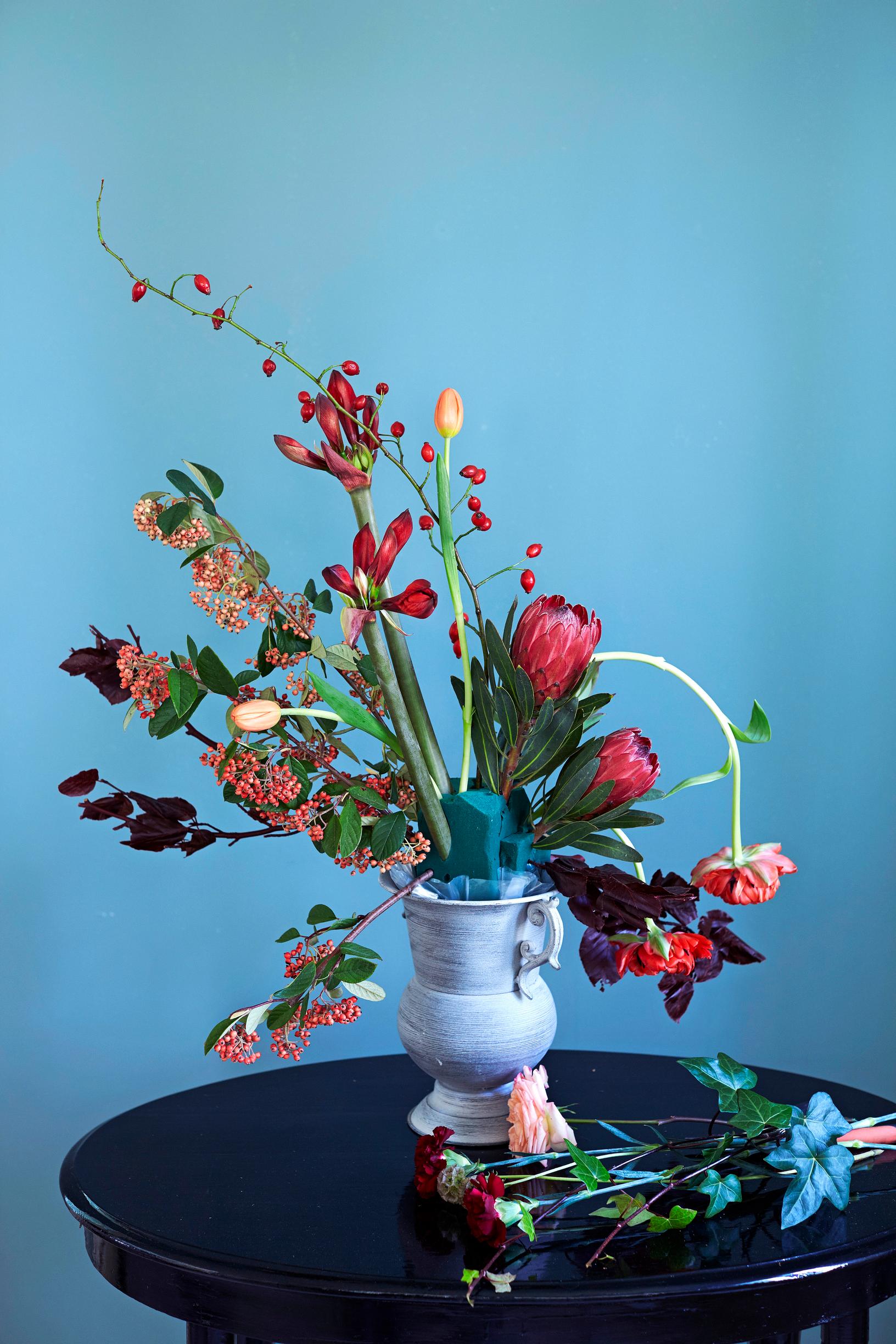 Anna kasvien muotojen ja kasvutapojen määritellä, minkä mallisen asetelman teet. Sen pitäisi näyttää villin rönsyävältä, vaikka kokoatkin sen suunnitelmallisen harkitusti. Aloita äärilinjoista, isoista ja pystyistä pääkasveista. Ne on myös helppo laittaa kukkasieneen ensimmäisinä. Pitkä- ja taipuvaversoiset ranskalaiset tulppaanit saavat vapaasti kaartua oikealle, vastapainoa tuovat jäykät ritarinkukan ja protean kukkavarret ja tuhkapensaan marjovat oksat. Ruusunmarjaoksa jatkaa kaartuvaa linjaa ylävasemmalle.