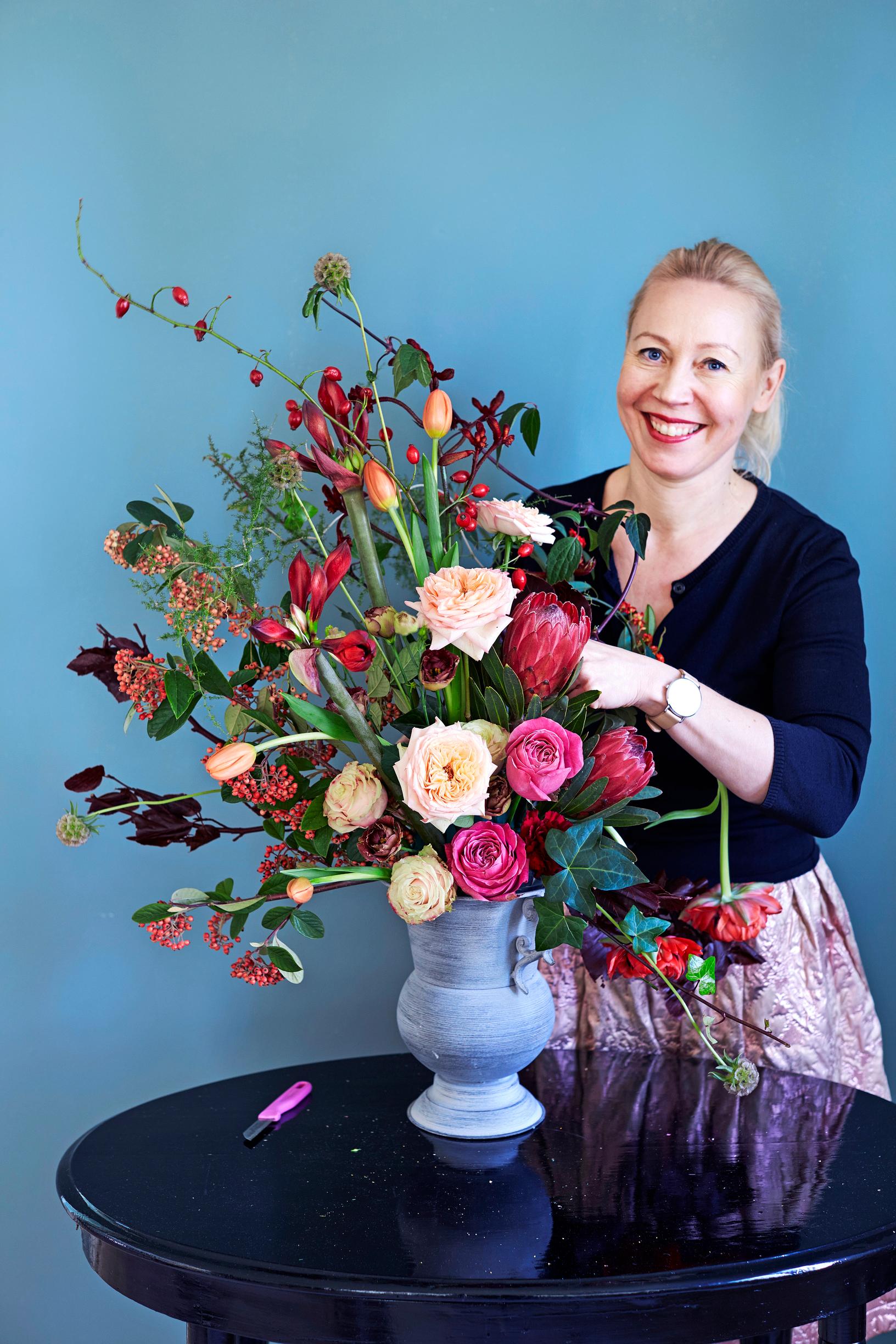 Maalauksellinen kukka-asetelma syntyy yhdistämällä leikkokukkia ja oksia rennon ryöppyäväksi kokonaisuudeksi. Floristimestari Saija Sitolahti opastaa. Kurkkaa myös video jutun lopusta!
