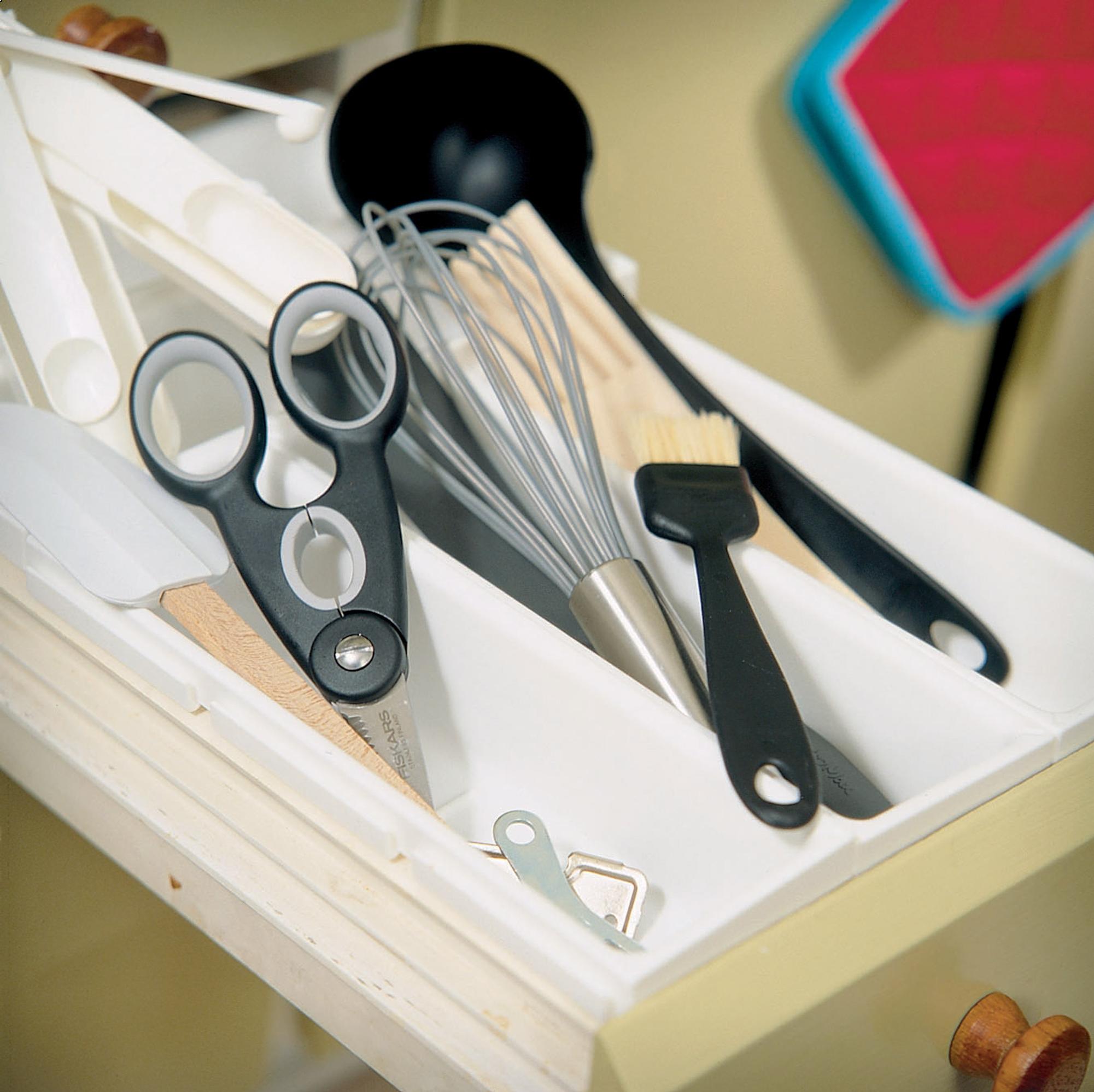 Täydennä varustusta tarvittaessa näillä: reikäkauha, lihanuija, juustohöylä, suppilo, valkosipulinpuristin, munaleikkuri, munakello, paistolämpömittari, kaulin, pihdit ja sitruspuserrin. Säästä laatikkotilaa ja sijoita usein käyttämäsi pienet keittiötyövälineet roikkumaan koukuista metallitankoon työskentelypisteen läheisyyteen.