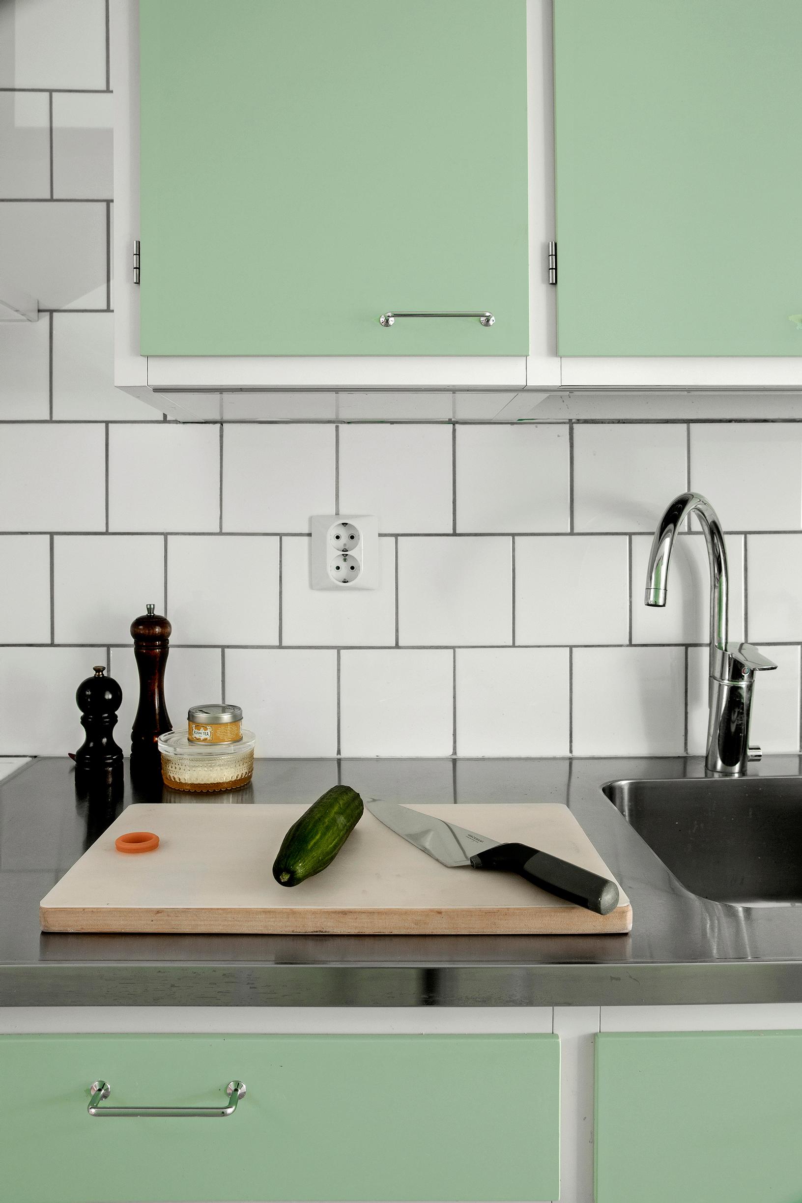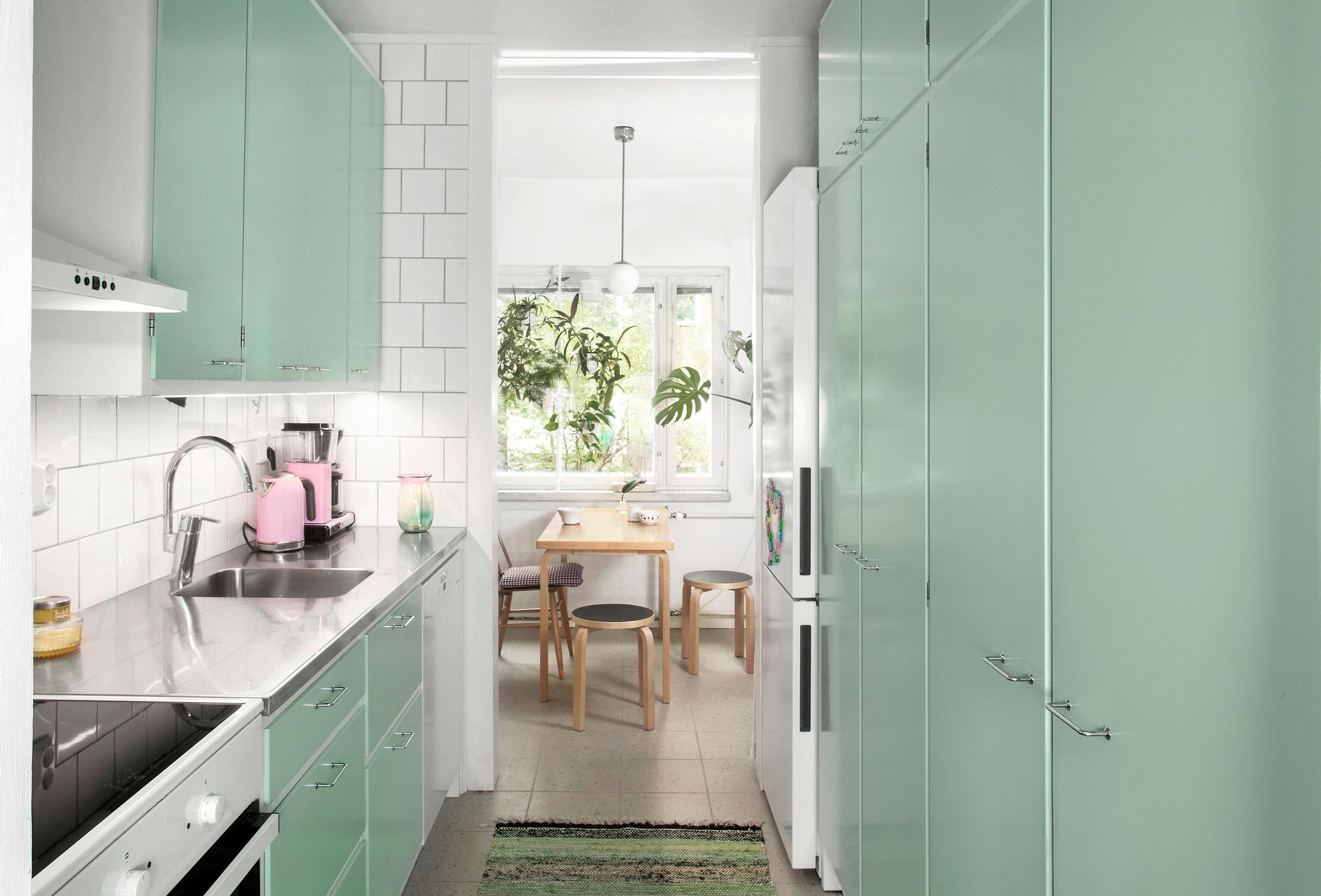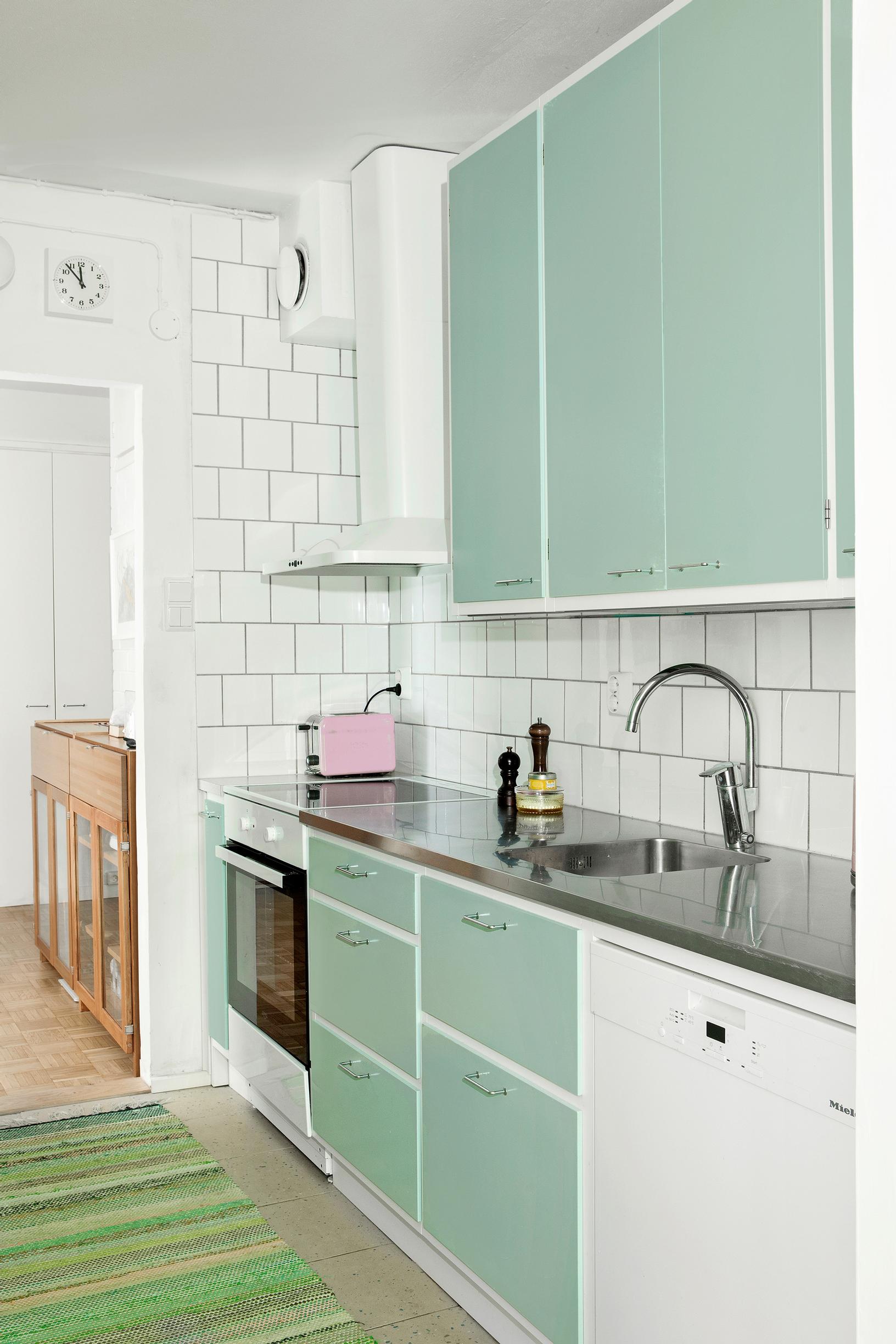 Helsinkiläisen kerrostalokodin keittiöremontissa otettiin mallia viisikymmenluvun tyylistä. Herkullinen mintunvihreä väri muutti rauhattoman tilan harmoniseksi.