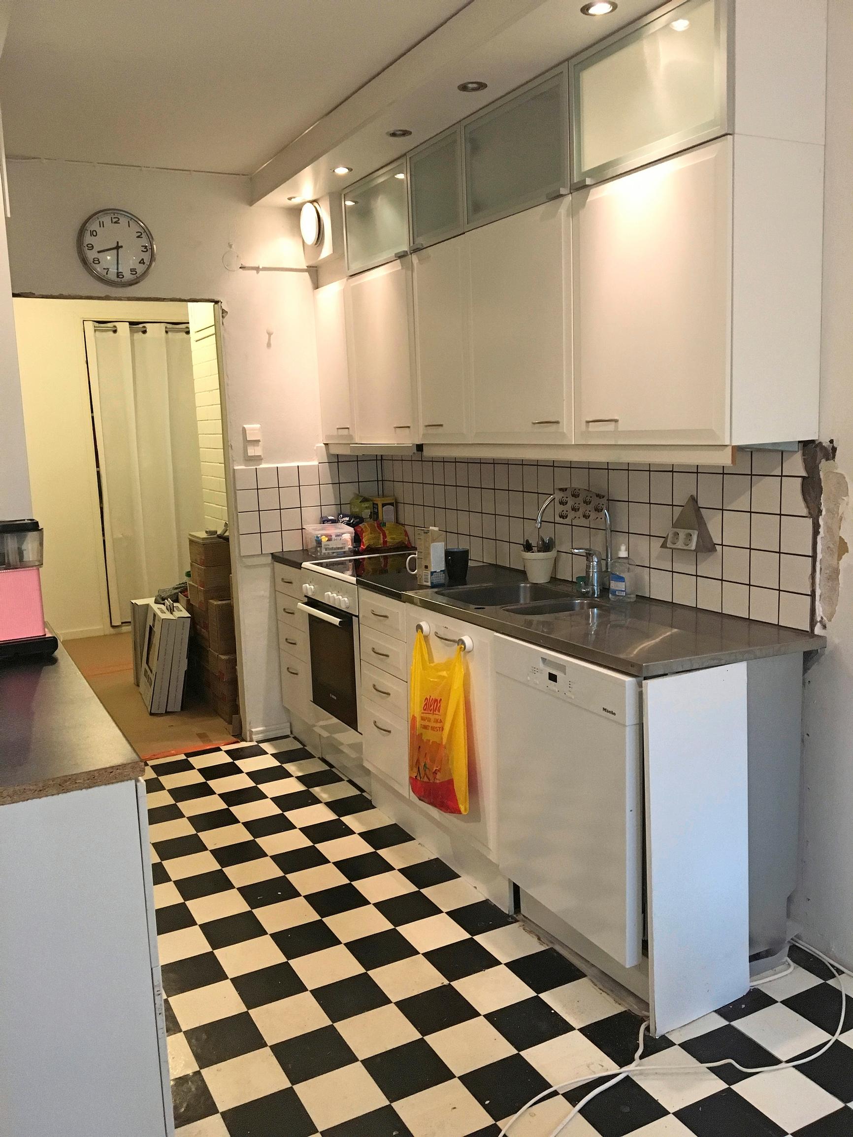 Vanhan tunnelman tuuletus aloitettiin purkutöillä. Työn alkuvaiheessa keittiöstä paljastui muun muassa kyseenalaisia sähköasennuksia, jotka poistettiin. Suurin yllätys piili vanhan keittiön toisella seinustalla olevien korkeiden kaappien sokkelien alla. Edellisessä remontissa poistetuista kiintokaapeista oli purettu vain se, mikä oli ollut välttämätöntä; lattiassa oli edelleen jäljellä betonivaluja, jotka piti poistaa ja tasoittaa ennen uusien kaappien asentamista.