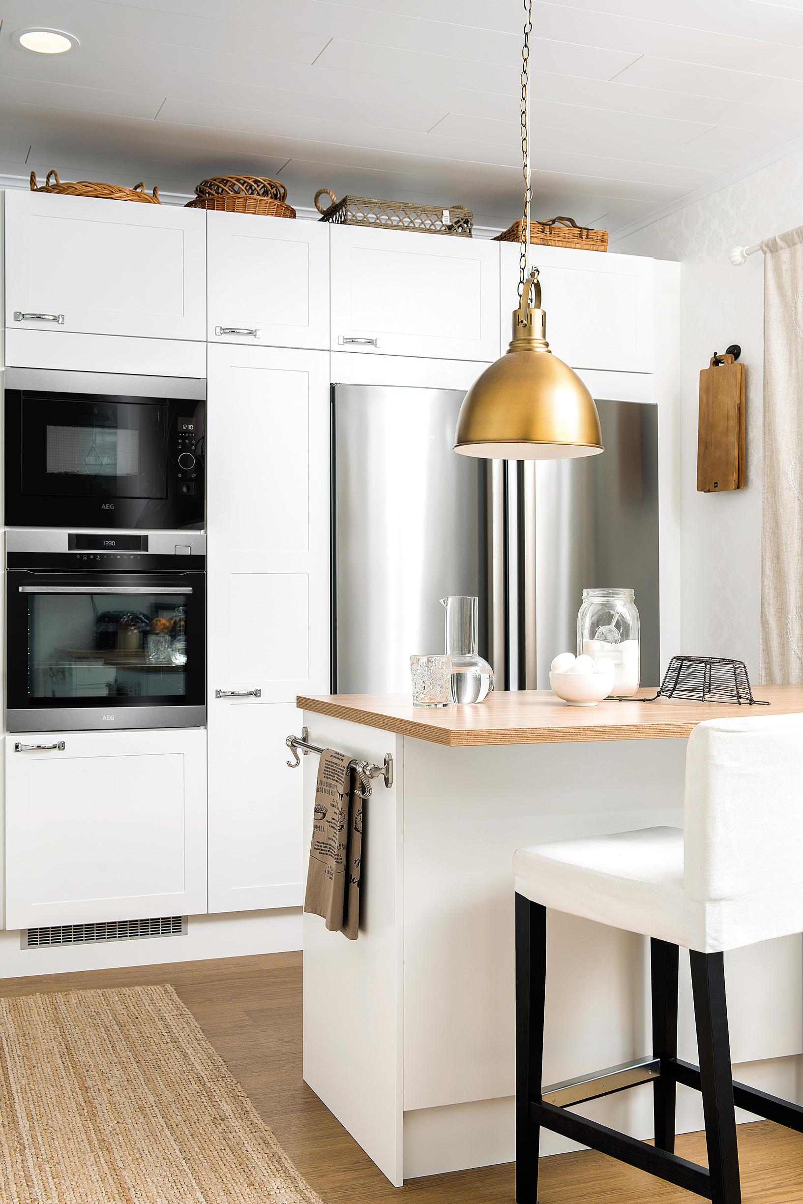 − Se on tyylikäs vaihtoehto ja siitä kannattaa ottaa kaikki hyöty irti. Sijoita sinne korkeat kodinkoneet kuten jääkaappi ja pakastin, ja ota säilytystilaa kattoon asti. Kannattaa tutustua uudenlaisiin säilytysjärjestelmiin, joita on tarjolla myös yläkaappeihin. Harkitse aamiaiskaappia, jonne saat piiloon kahvinkeittimen ja leivänpaahtimen. Tällöin ne eivät vie myöskään tilaa työskentelytasolta.