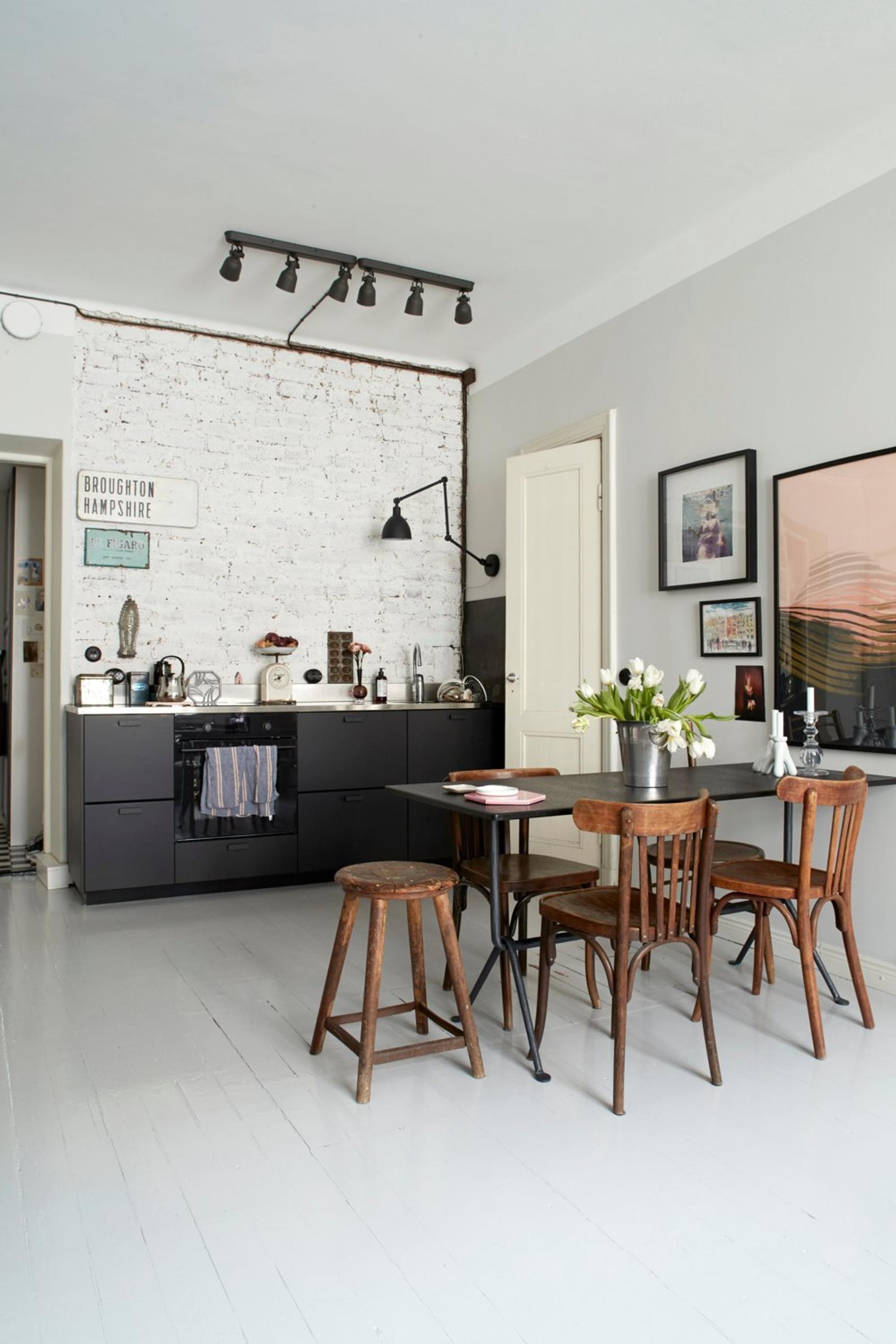 Kirjailijan kodissa olohuone ja keittiö sulautuvat yhteen kuin parhaat kaverit. Musta laatikosto näyttää enemmän senkiltä kuin keittiökalusteelta etenkin, kun maalattu, rosoinen tiiliseinä on jätetty paljaaksi. Ruokapöydän yhteyteen tehty tauluasetelma ja vanhat bistrotuolit tekevät tupakeittiöstä kodikkaan kahvilamaisen tilan.