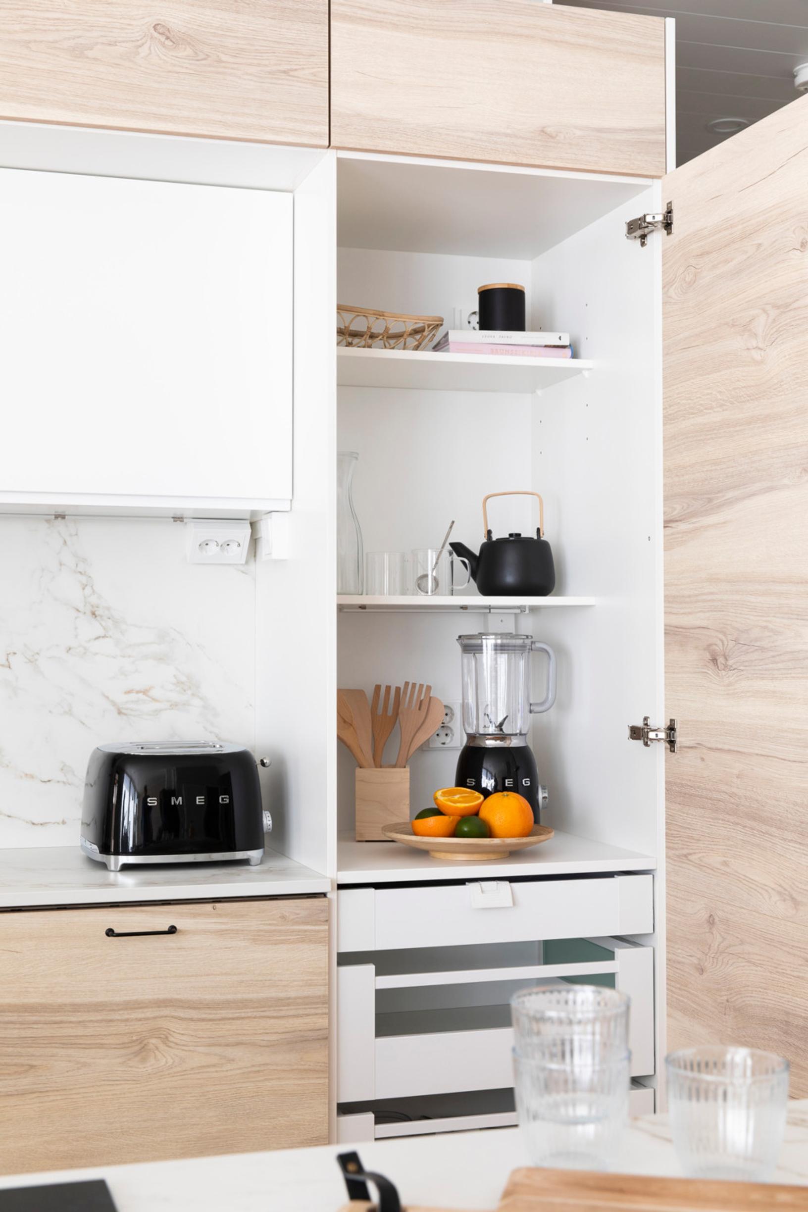 Kahvikoneen, blenderin, leivänpaahtimen ja muut aamiaistilpehöörit piilottava aamiaiskaappi on lyömätön ratkaisu isossa ja pienessä keittiössä. Aamiaiskaapin onnistunut toteuttaminen ei vaadi aina kalliita taitto-ovia. Sen voi sijoittaa tavalliseen korkeaan kaapistoon.