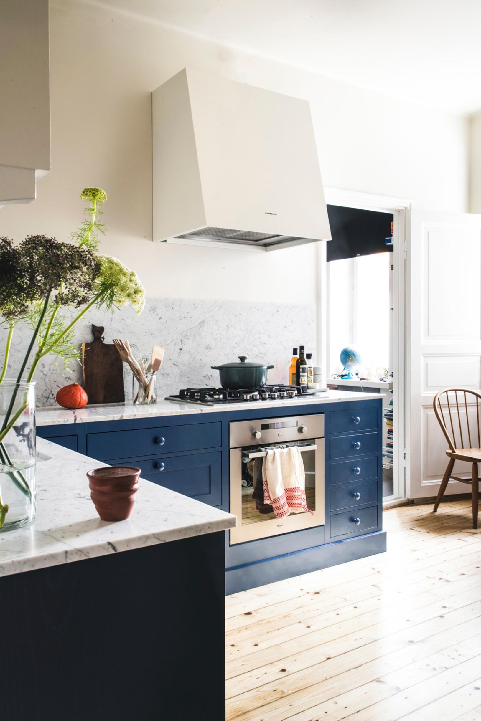 Indigo, mustikka vai taivaansininen? Siniset kaapistot ovat varma askel kohti värikkäämpää keittiön sisustusta ja ne sopivat skandikeittiöön siinä missä mustat kaapistot. Vaalea puu ja marmori täydentävät sinisen keittiön klassista tyyliä.